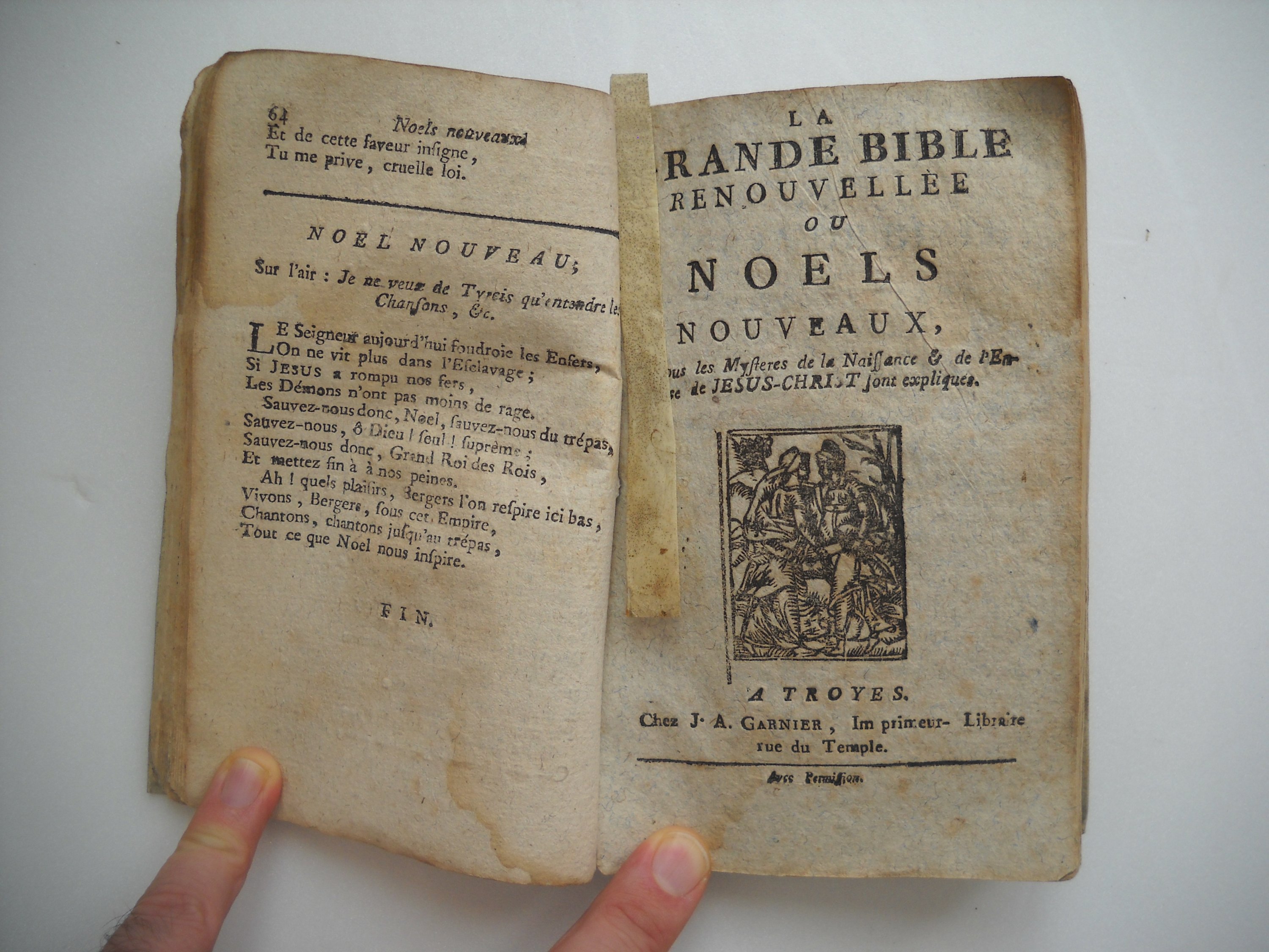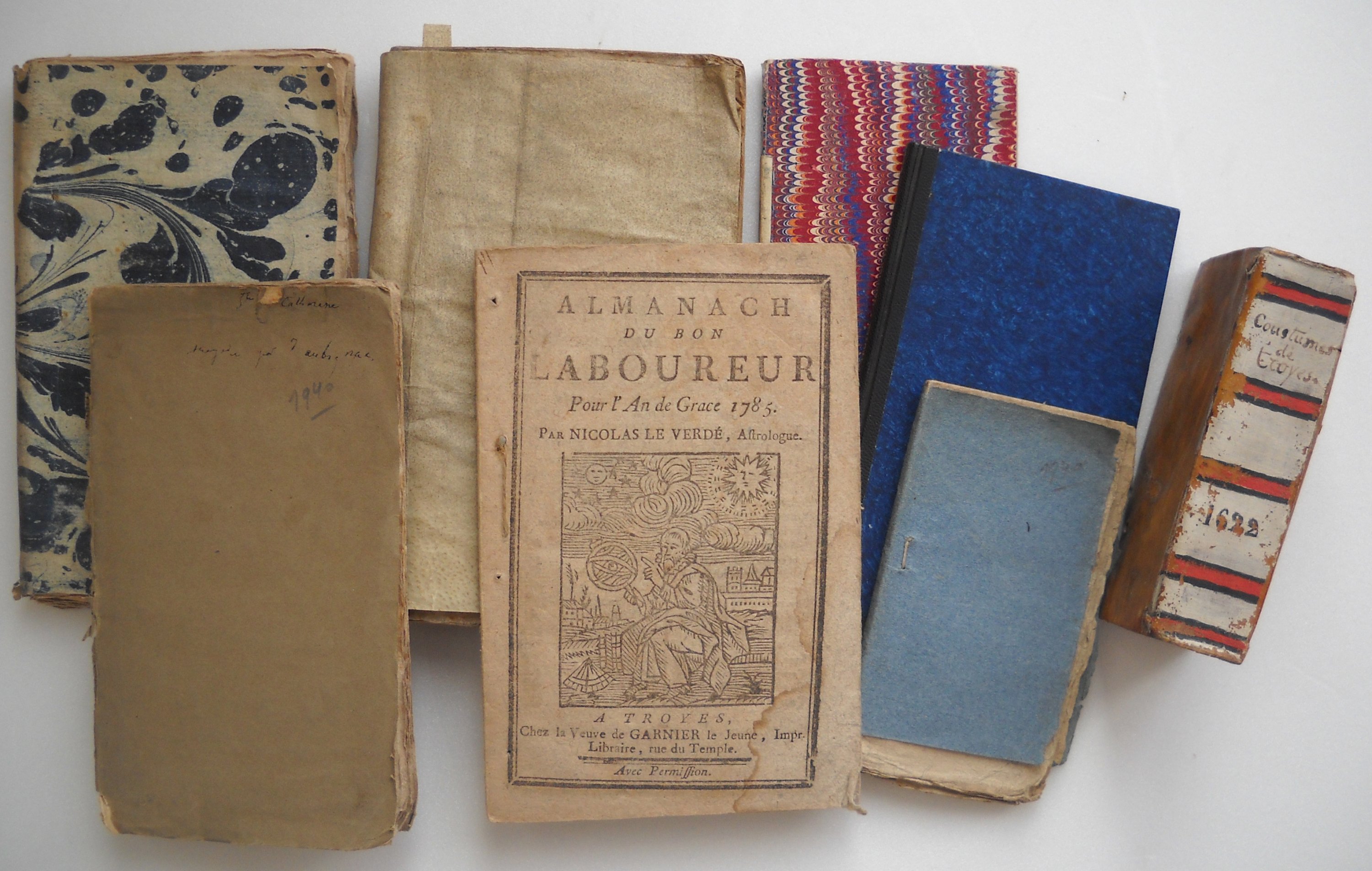 ", [entre 1754 et 1765], J. Garnier, 132 pp. - 4 ex. reliés " La Grande Bible renouvellée, ou Noëls nouveaux, où tous les mystères de la naissance & de l'enfance de Jésus-Christ sont expliqués. ", impr. chez A. Garnier, J.A. Garnier et Fme Garnier - " Almanach du bon laboureur pour l'an de grace 1785, par Nicolas Le Verdé, astrologue ", Veuve de Garnier le jeune - " La vie de Sainte Reine, vierge-martyre ", [1710], J.A. Garnier, s.d., 48 pp.
