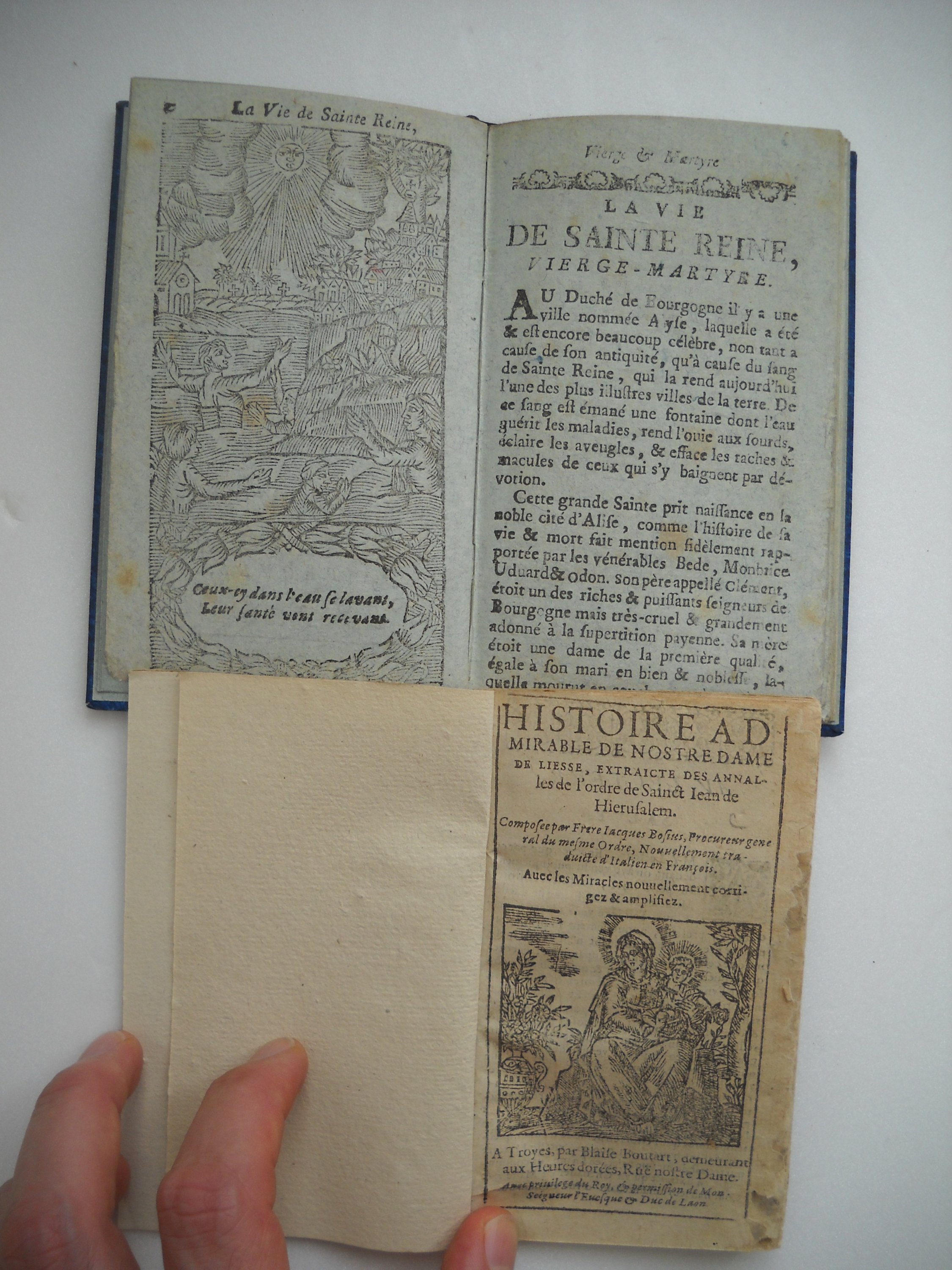 7 vol. ou plaquettes, édités à Troyes, in-18 à in-12, brochés ou rel. anciennes, XVIIe et XVIIIe siècles: " Histoire admirable de Nostre-Dame de Liesse ", par J. Bosius, [1602], chez Blaise Boutart, 60 pp. - " Sainte Catherine, tragédie. " par d'Aubignac, Veuve de Jacques Oudot, 1718, 72 pp. - " La Vie de S. Alexis, Vrai Miroir de Patience et de Chasteté ", J.A. Garnier, s.d., 47 pp. - " Exercice de dévotion contenant les Prières du Matin & du Soir, l'Entretien durant la Messe & les Prières pour la Confession & la sainte Communion