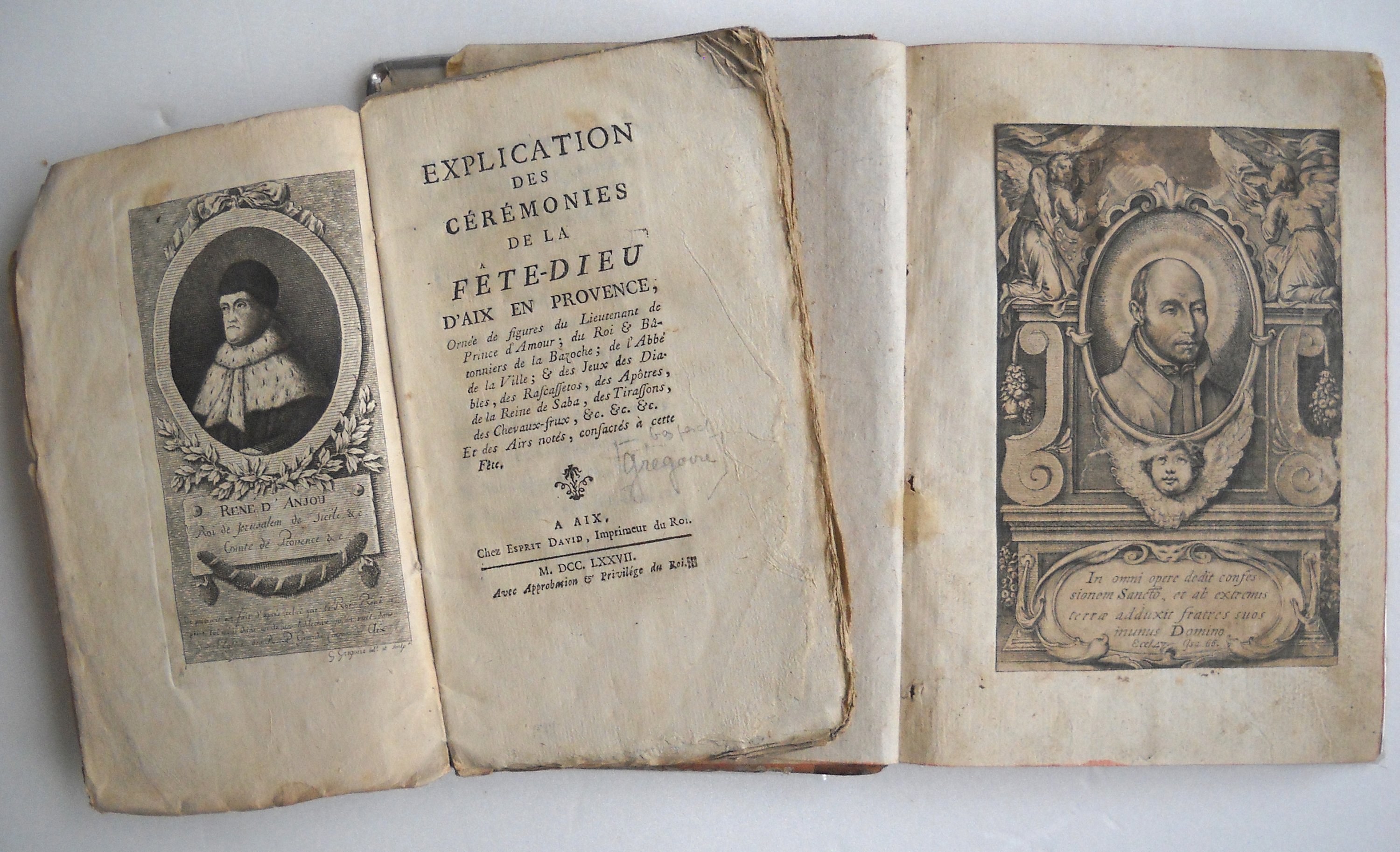 ", 1778, à Toulouse, par la Société, in-16, 299 pp. - " In omni opere dedit confessionem sancto, et ab extremis terrae adduxit fratres suos munus Domino ", Ignace de Loyola, [1556], in-12, 80 pp. (incomplet, déf. et rest.) - " Explication des cérémonies de la Fête-Dieu d'Aix-en-Provence ", 1777, à Aix, chez Esprit David, in-12, 220 pp. - " Instruction sur le chemin de la croix avec les pratiques de cette dévotion dédiée à la Très Sainte Vierge ", 1817, à Lyon, Chez Rusand, in-18, 180 pp. - " Histoire de l'origine et de progrès, et de l'état présent de la Ste Chpaelle située dans l'abbaye des ermites ou d'Einsidlen