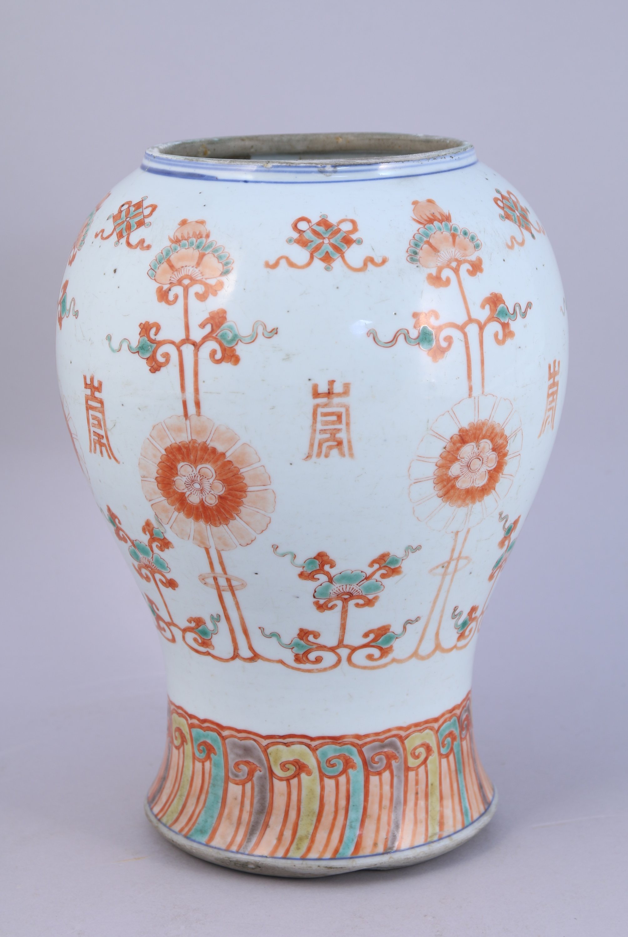 BAS DE VASE cornet coupé, en porcelaine émaillée polychrome à décor de pivoines stylisées et caractères "shou" stylisés.