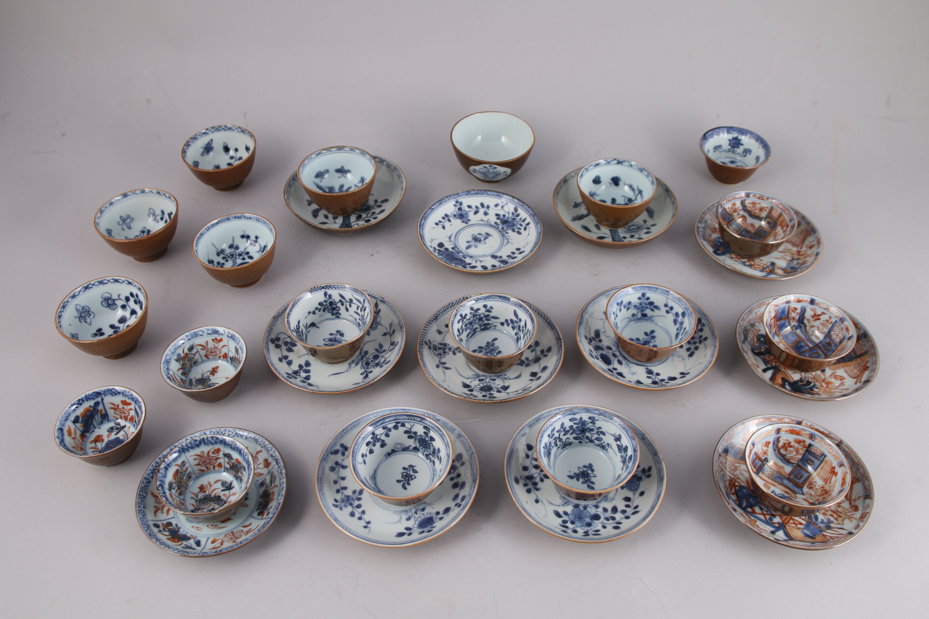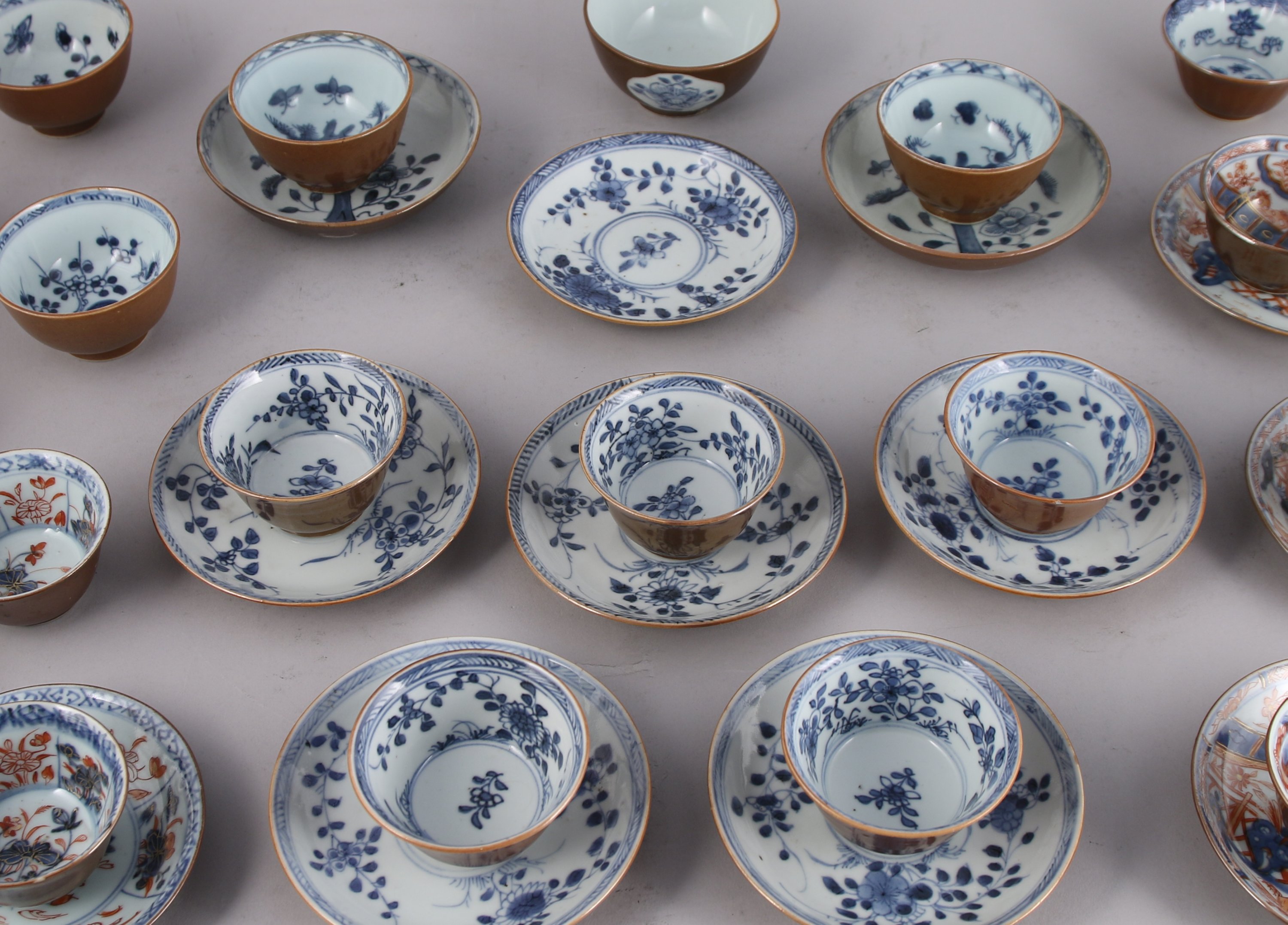 17 SORBETS et 12 SOUCOUPES en porcelaine émaillée capucin à l'extérieur, l'intérieur à motifs floraux en bleu sous couverte et rouge de fer.