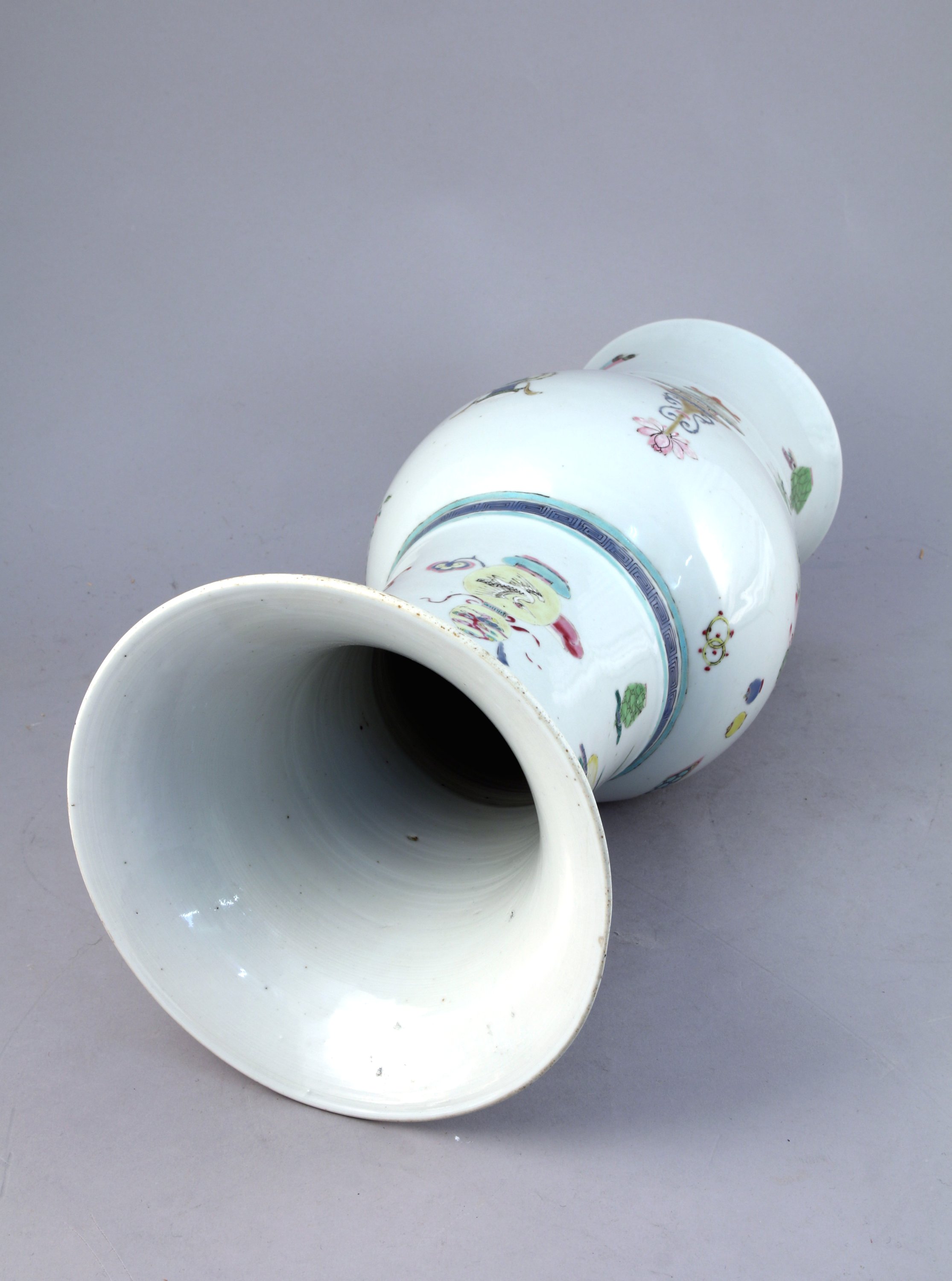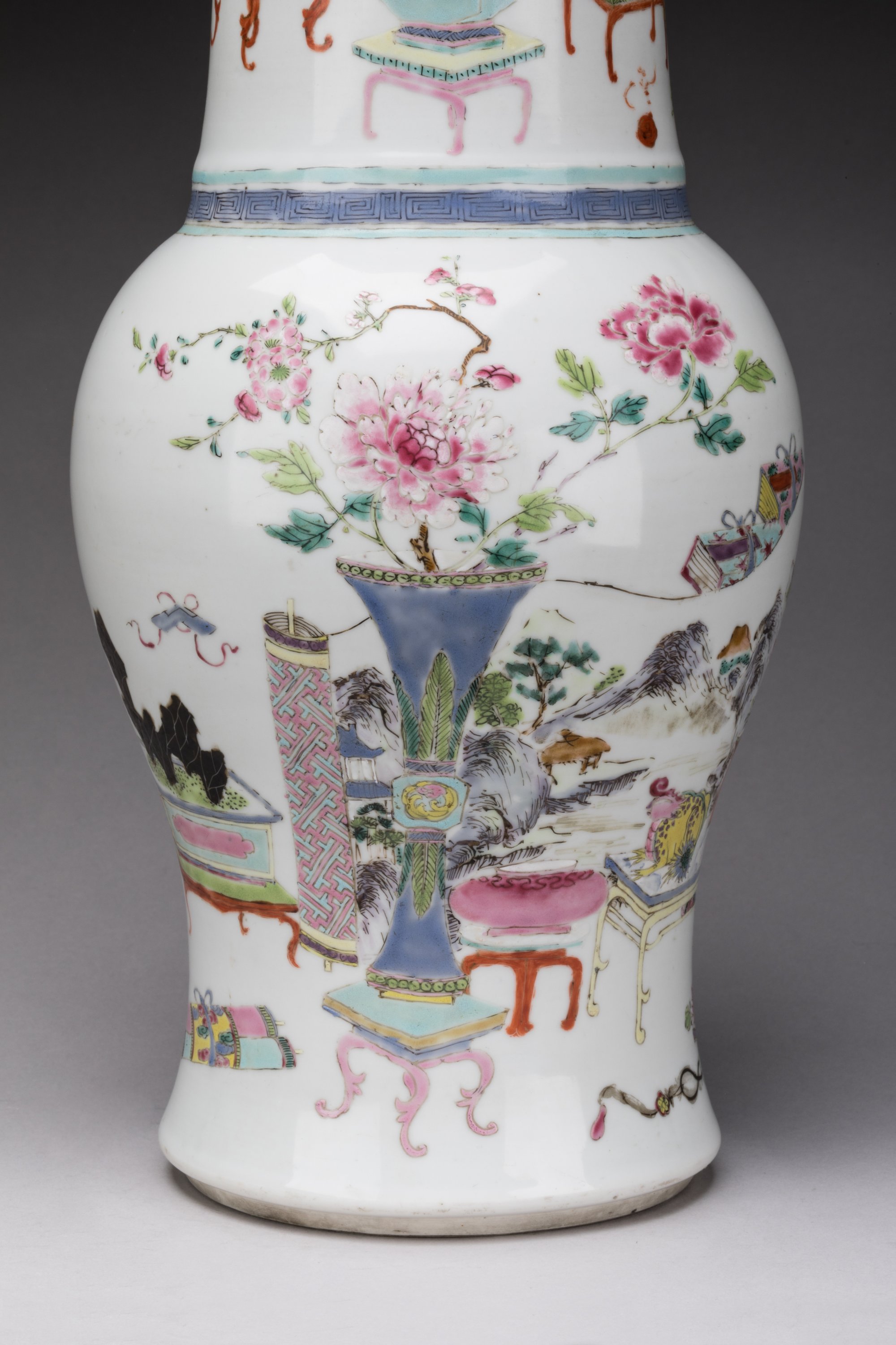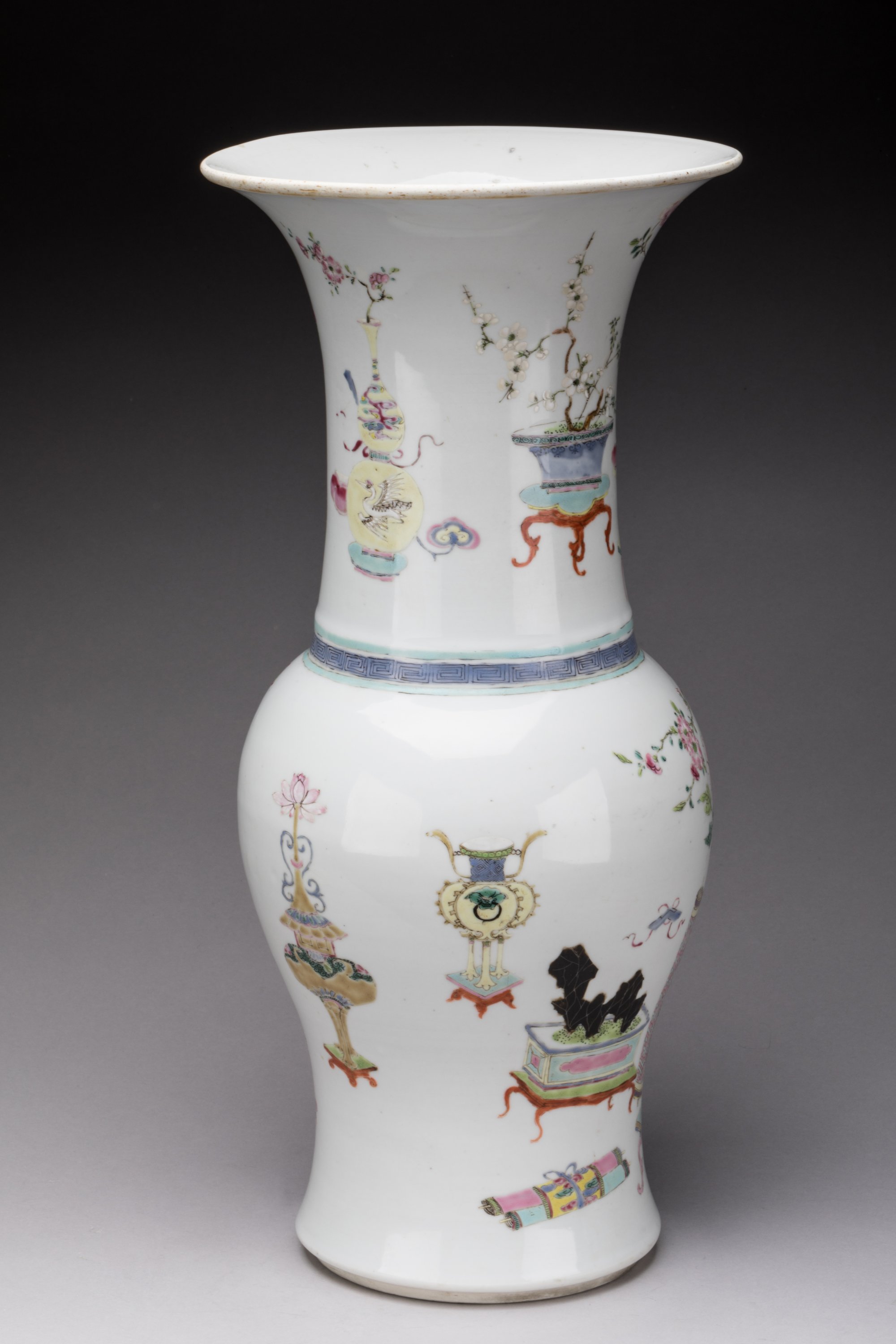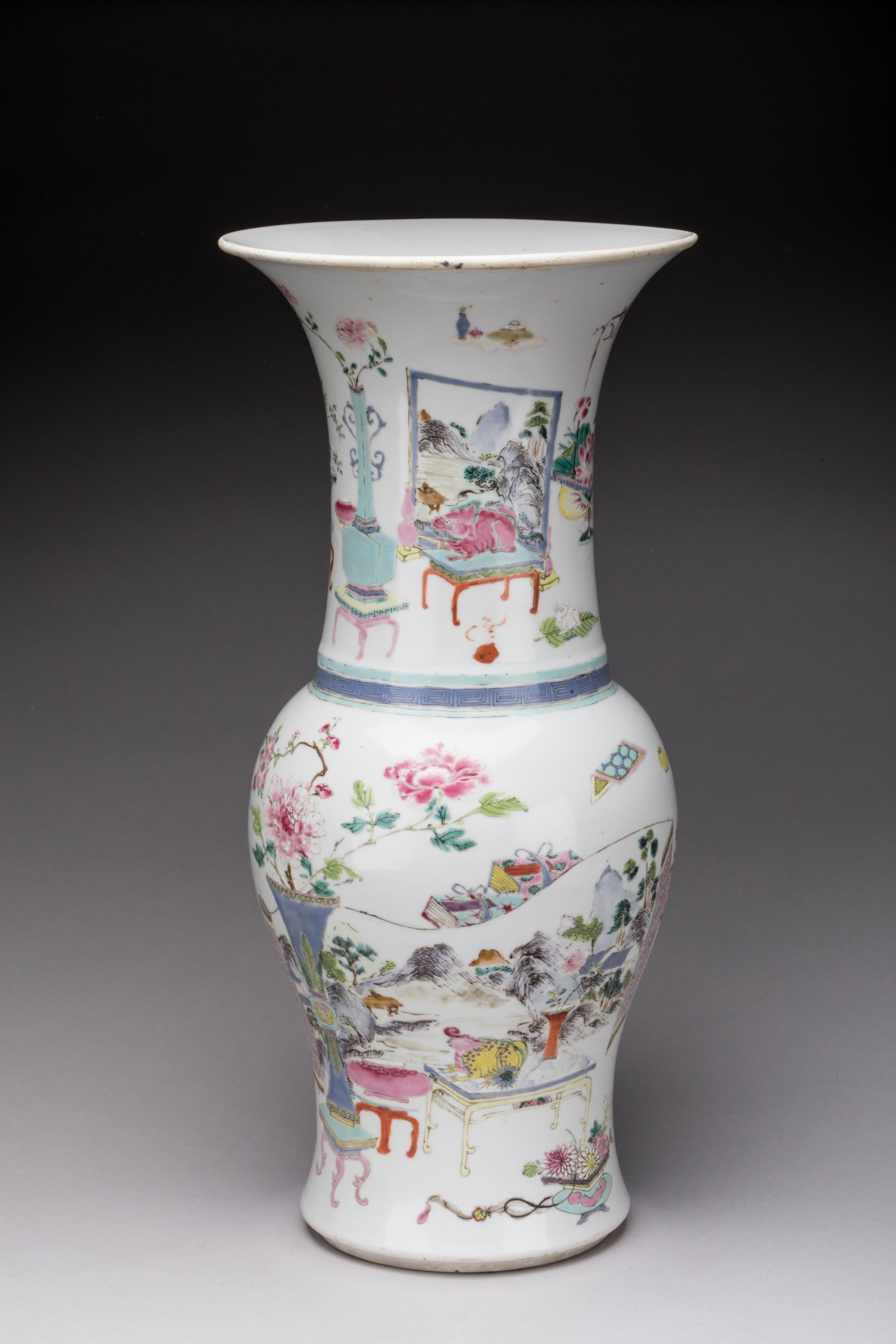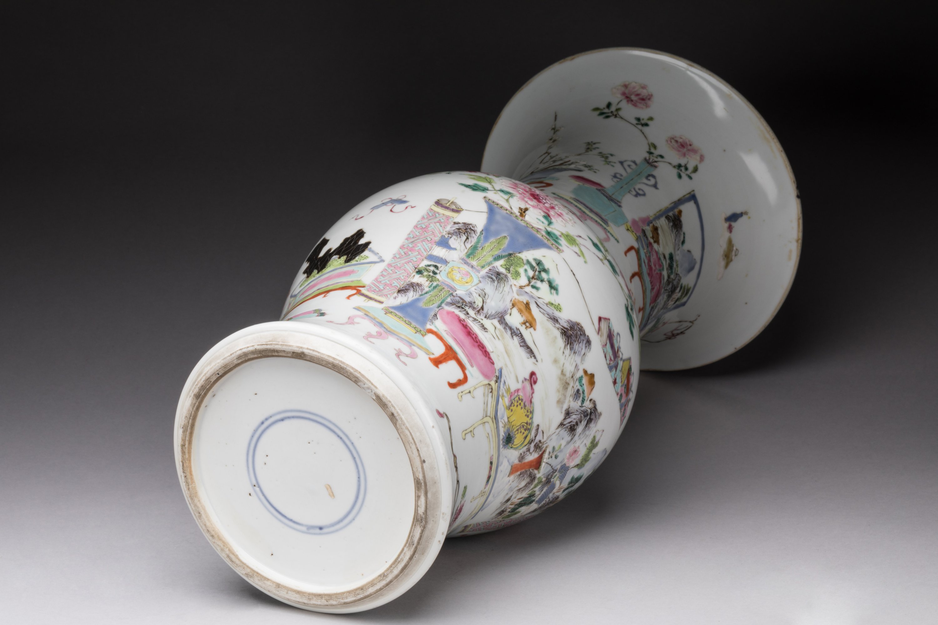 VASE en porcelaine de forme YANYAN à décor en émaux polychromes de la famille rose de vases fleuris et d'objets de lettrés, dont un rouleau représentant un paysage montagneux, le col orné d'une frise de grecques.