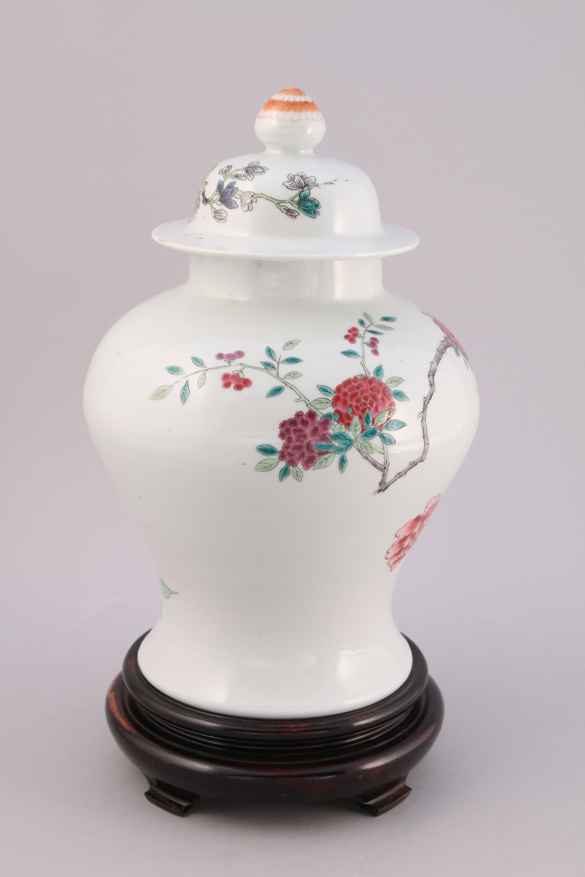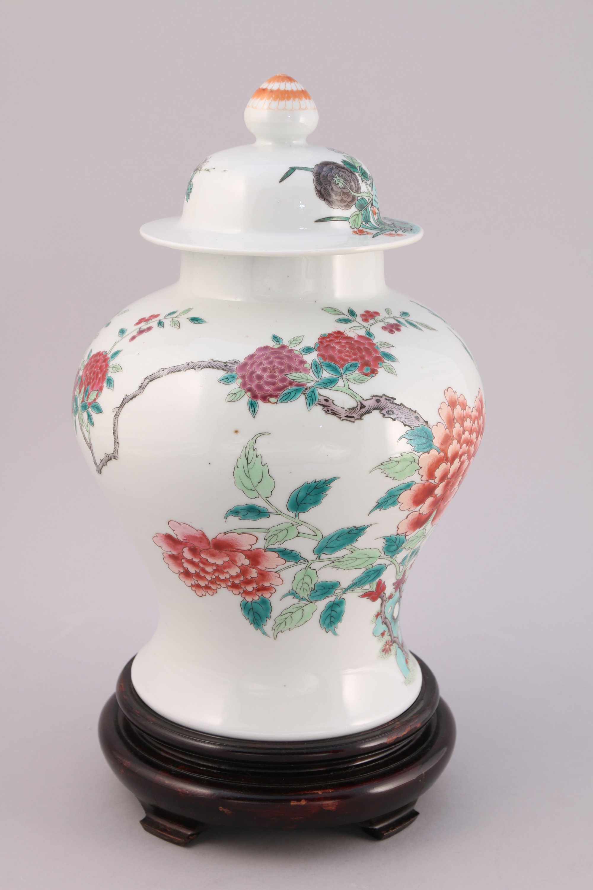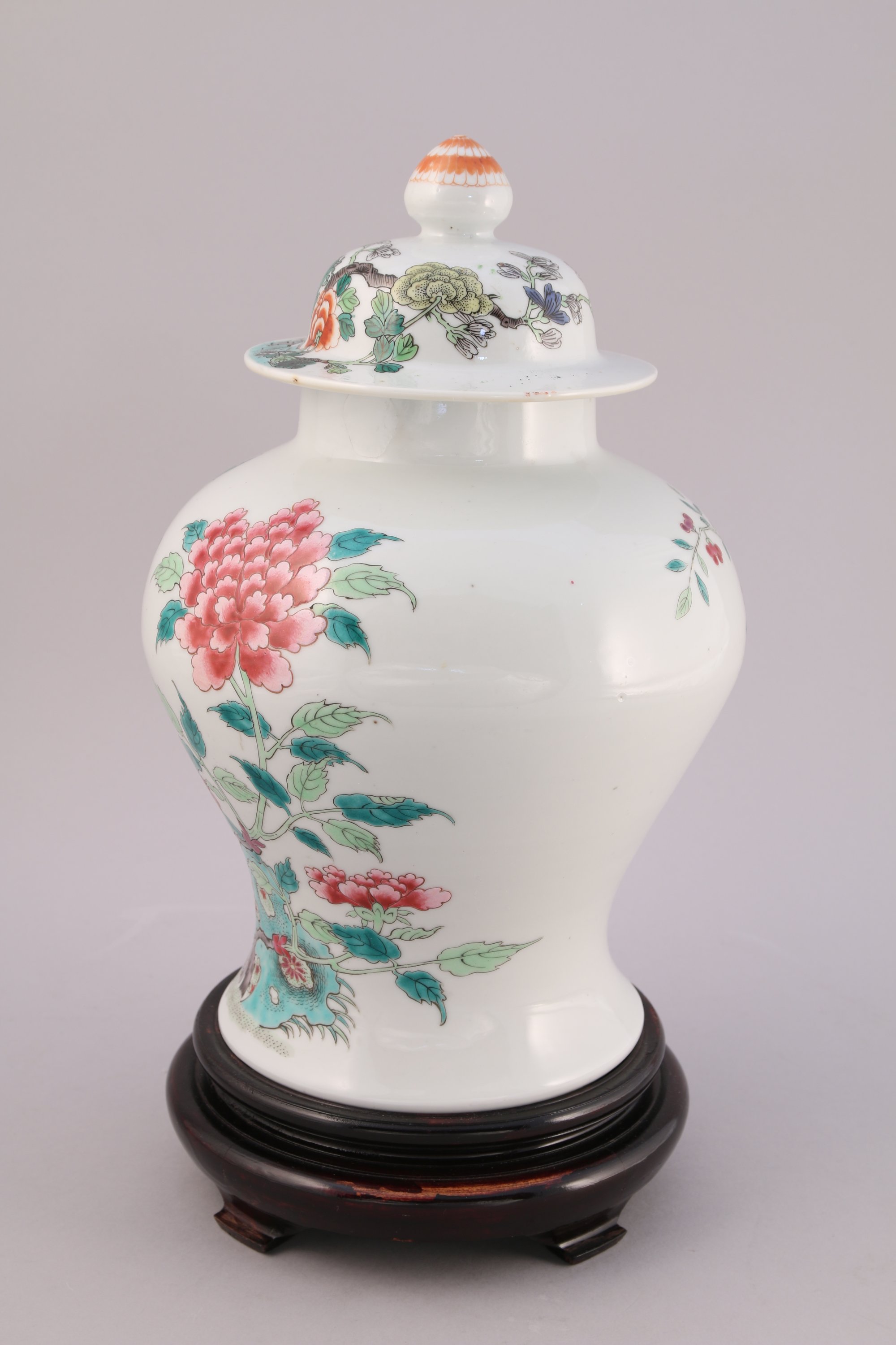POTICHE en porcelaine à décor en émaux polychromes dans le style de la famille rose de pivoines dans leur feuillage et de rochers percés.