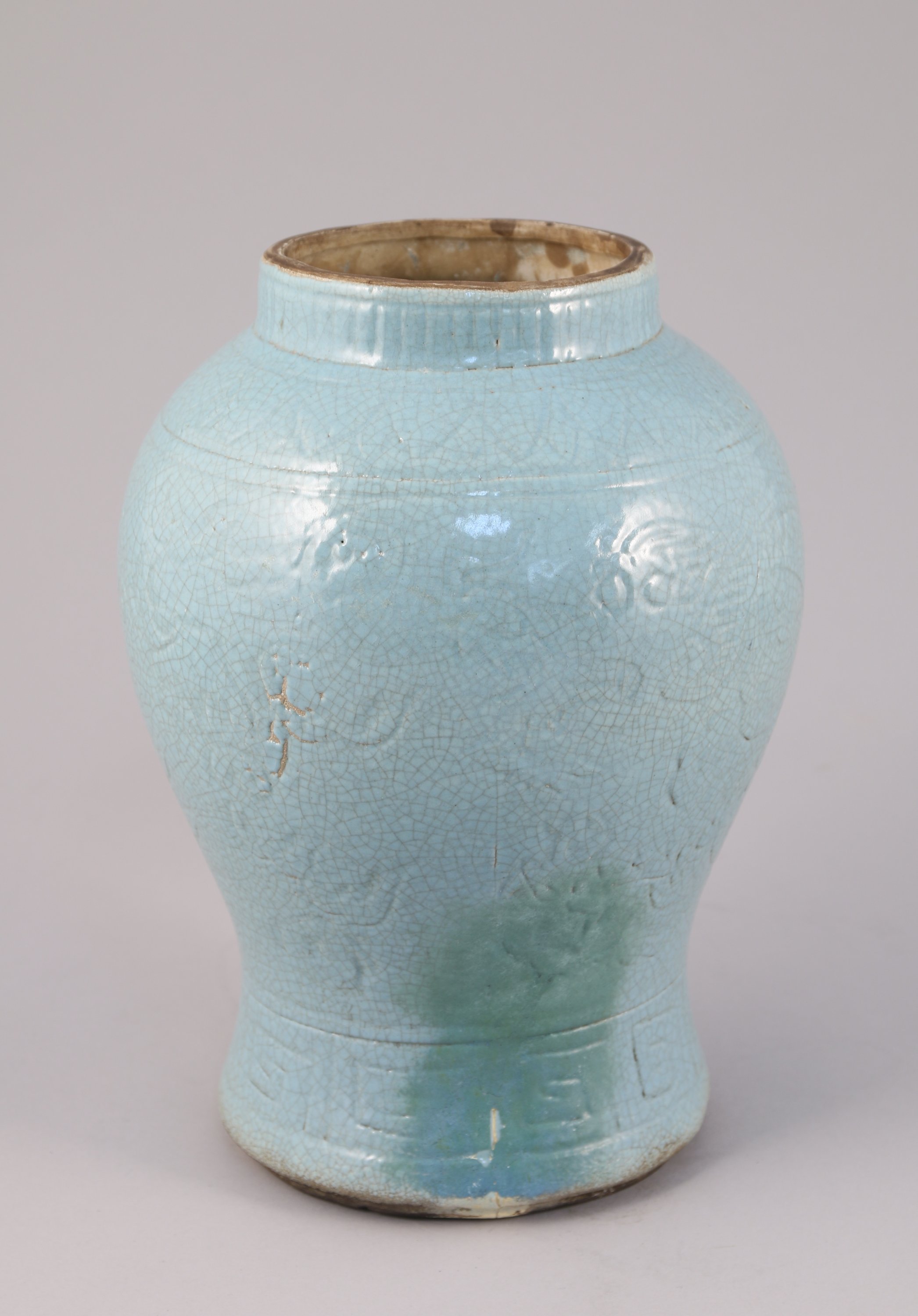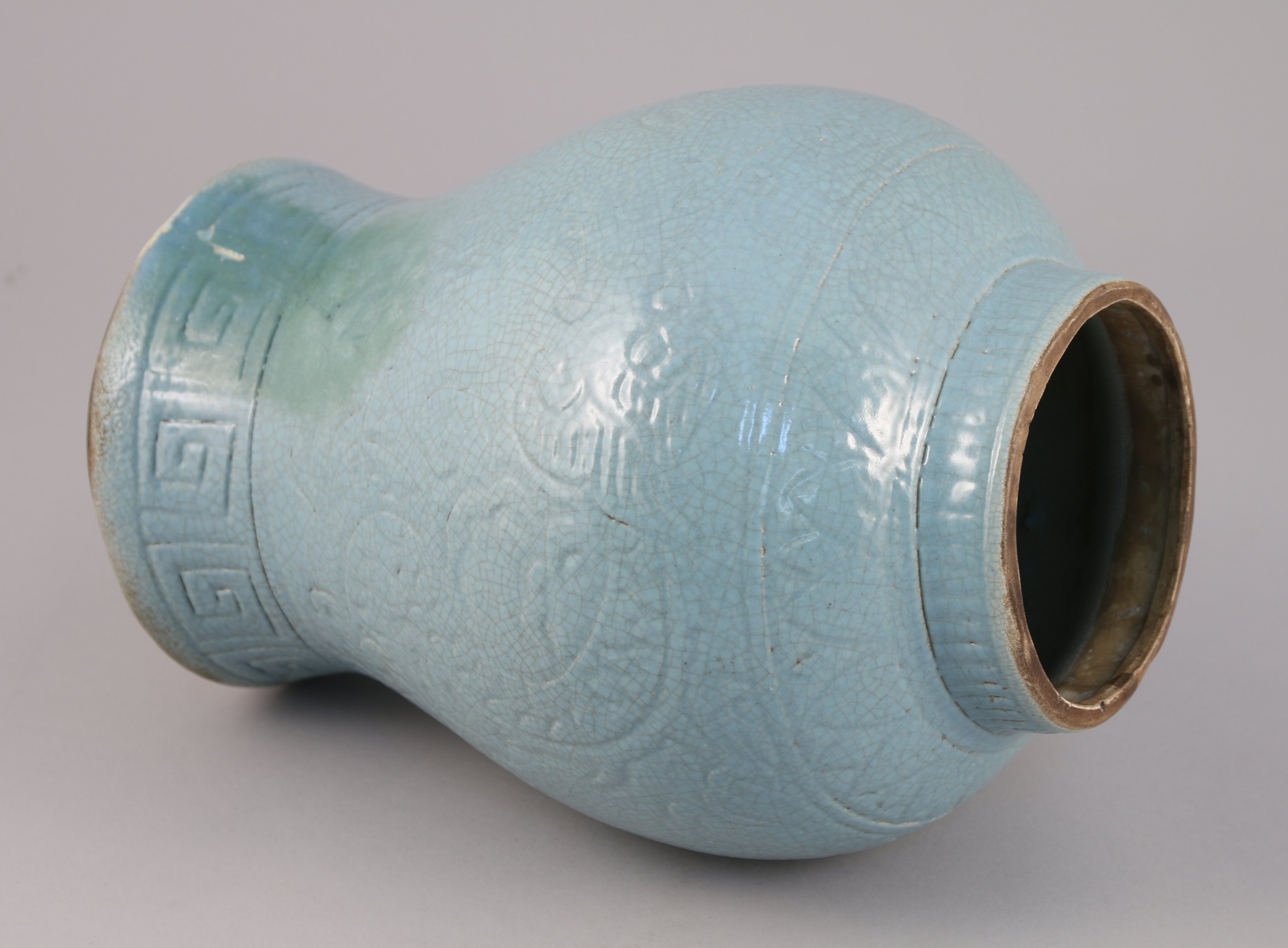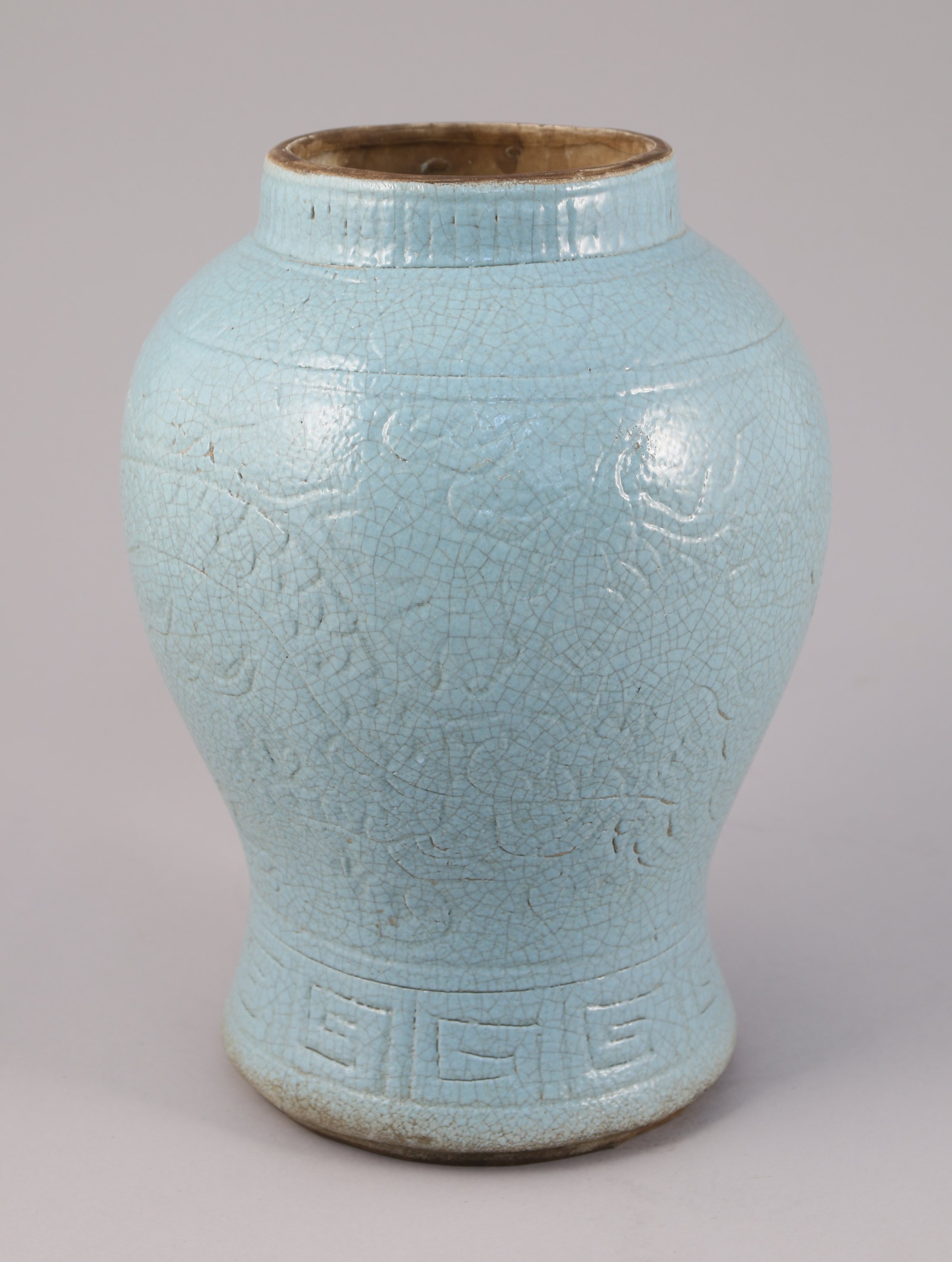 VASE balustre en porcelaine émaillée turquoise craquelé et à décor incisé sous la couverte de dragons parmi les nuages.