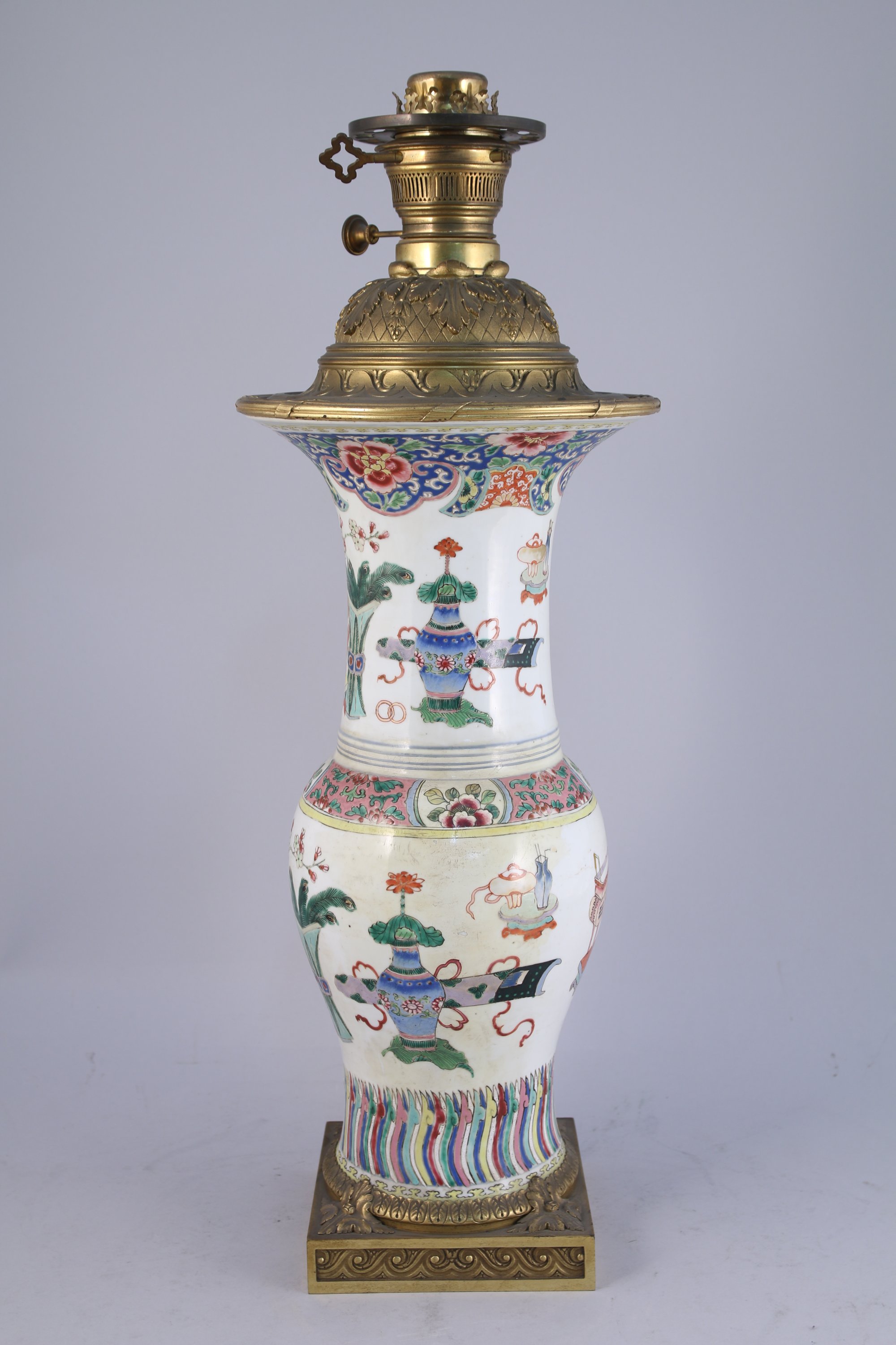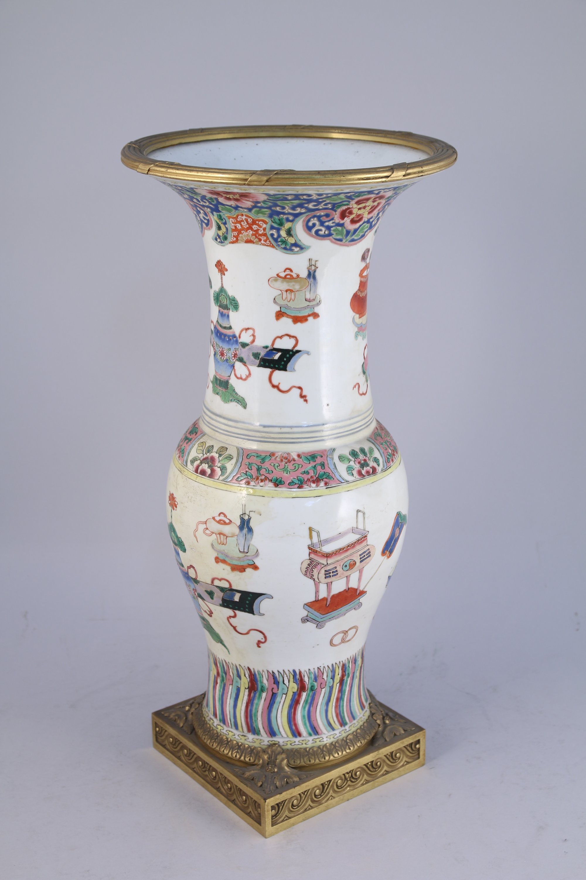 VASE de forme yanyan en porcelaine à décor en émaux polychromes de la famille rose d'objets de lettrés, l'épaule et le col ornés de frises de fleurs stylisées dans leur feuillage.