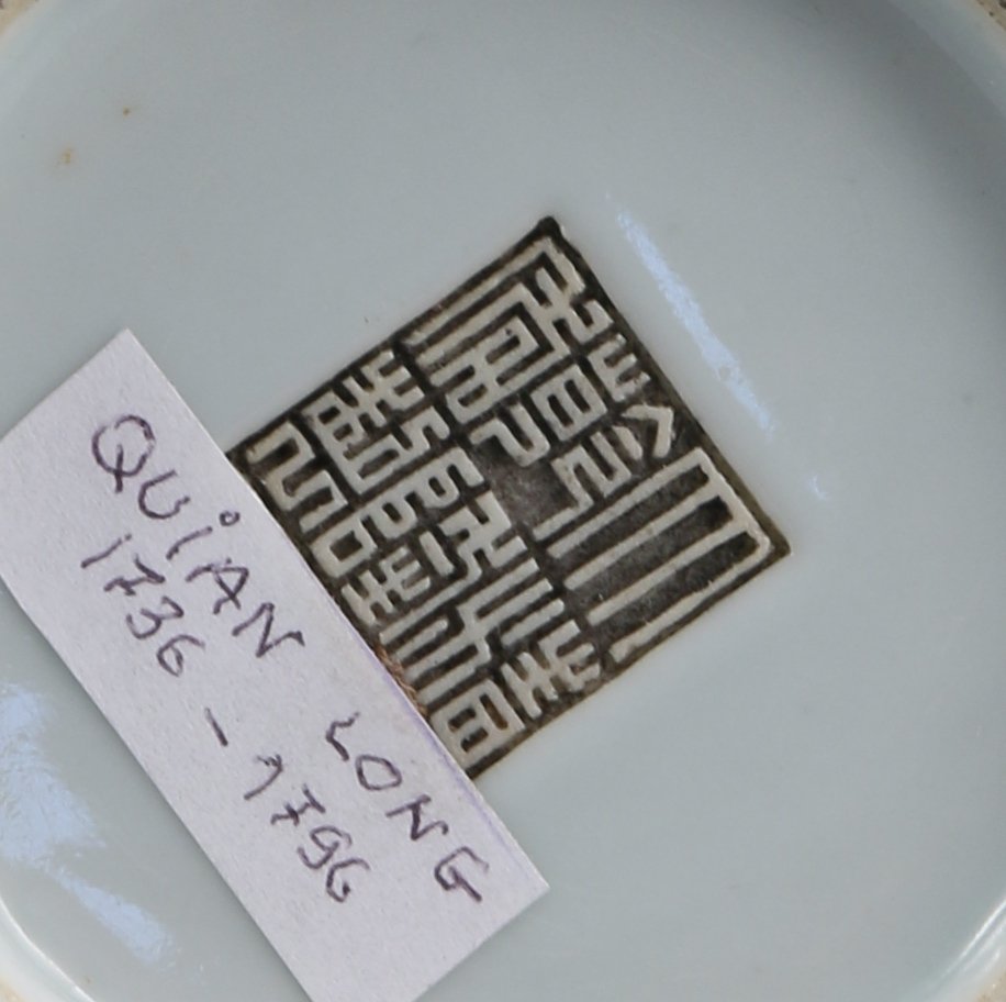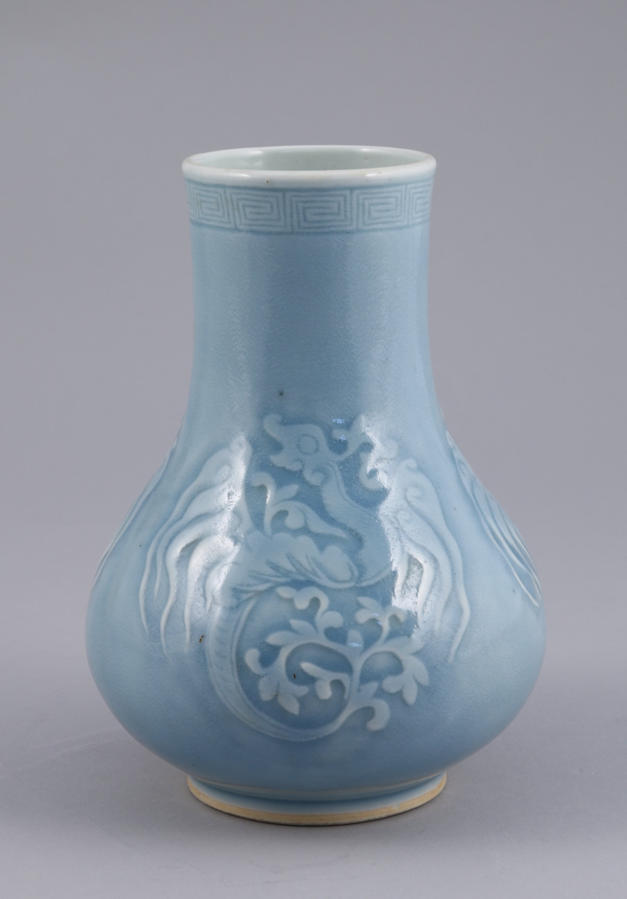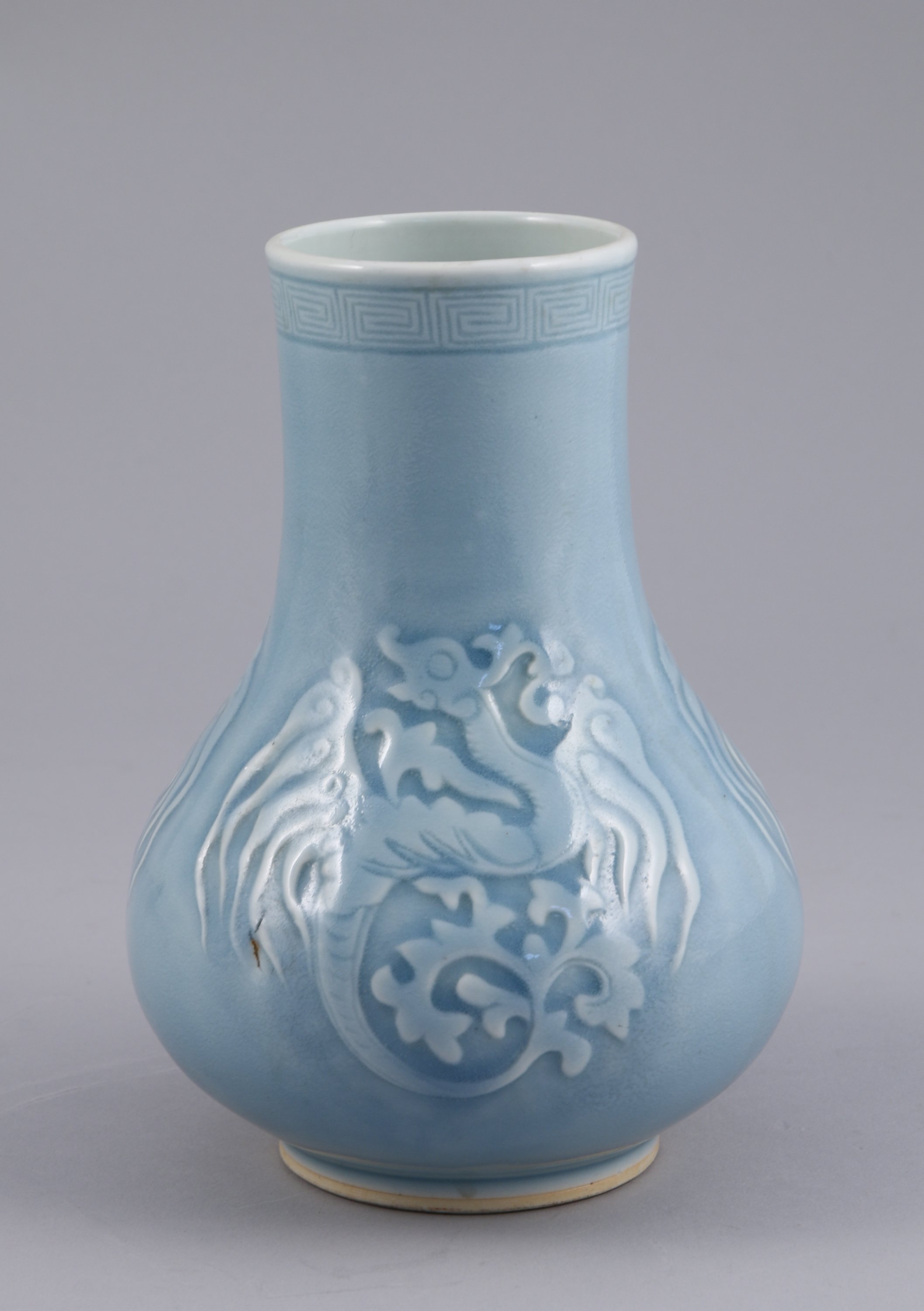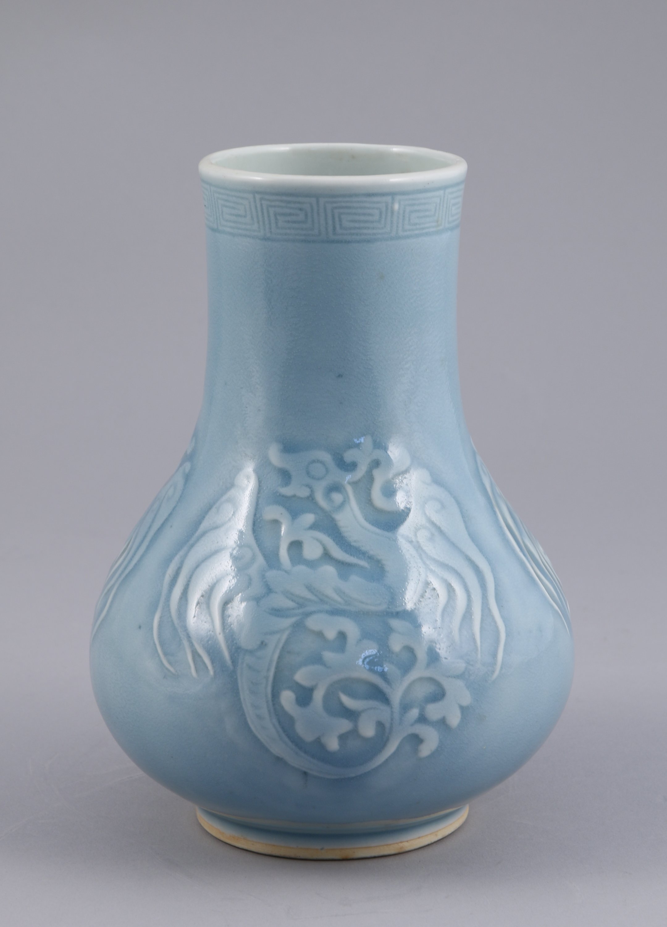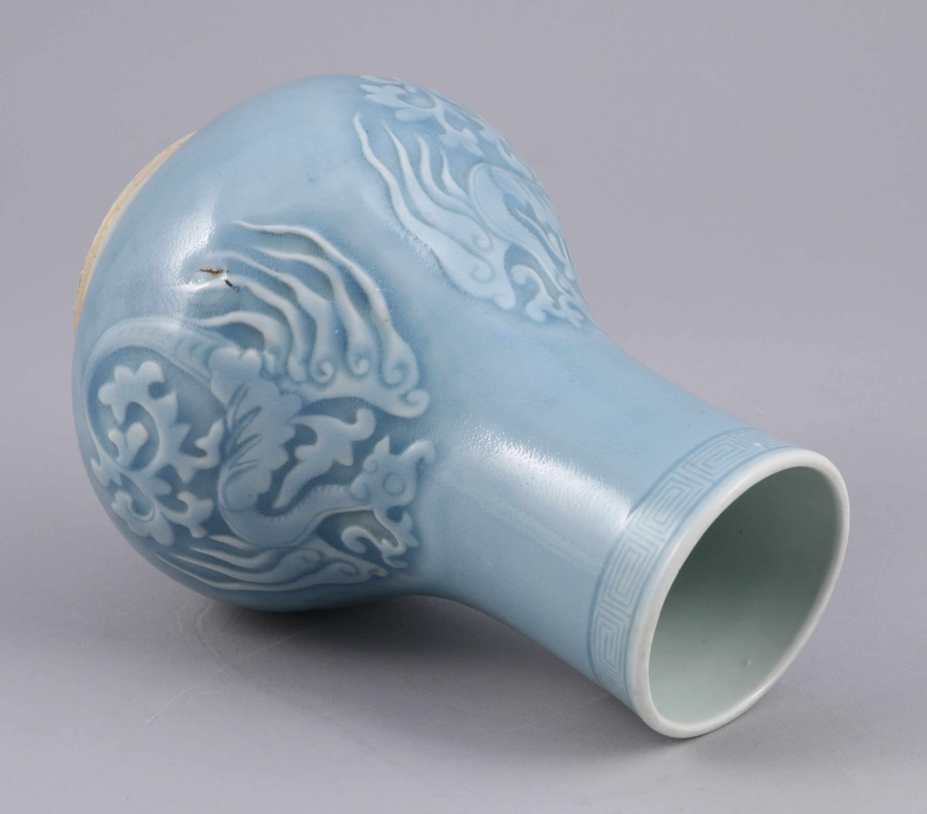 Petit VASE balustre en porcelaine émaillée clair de lune à motifs de dragons ailés et rinceaux moulés sous la couverte, le col incisé dune frise de grecques. Marque apocryphe de Qianlong au revers.