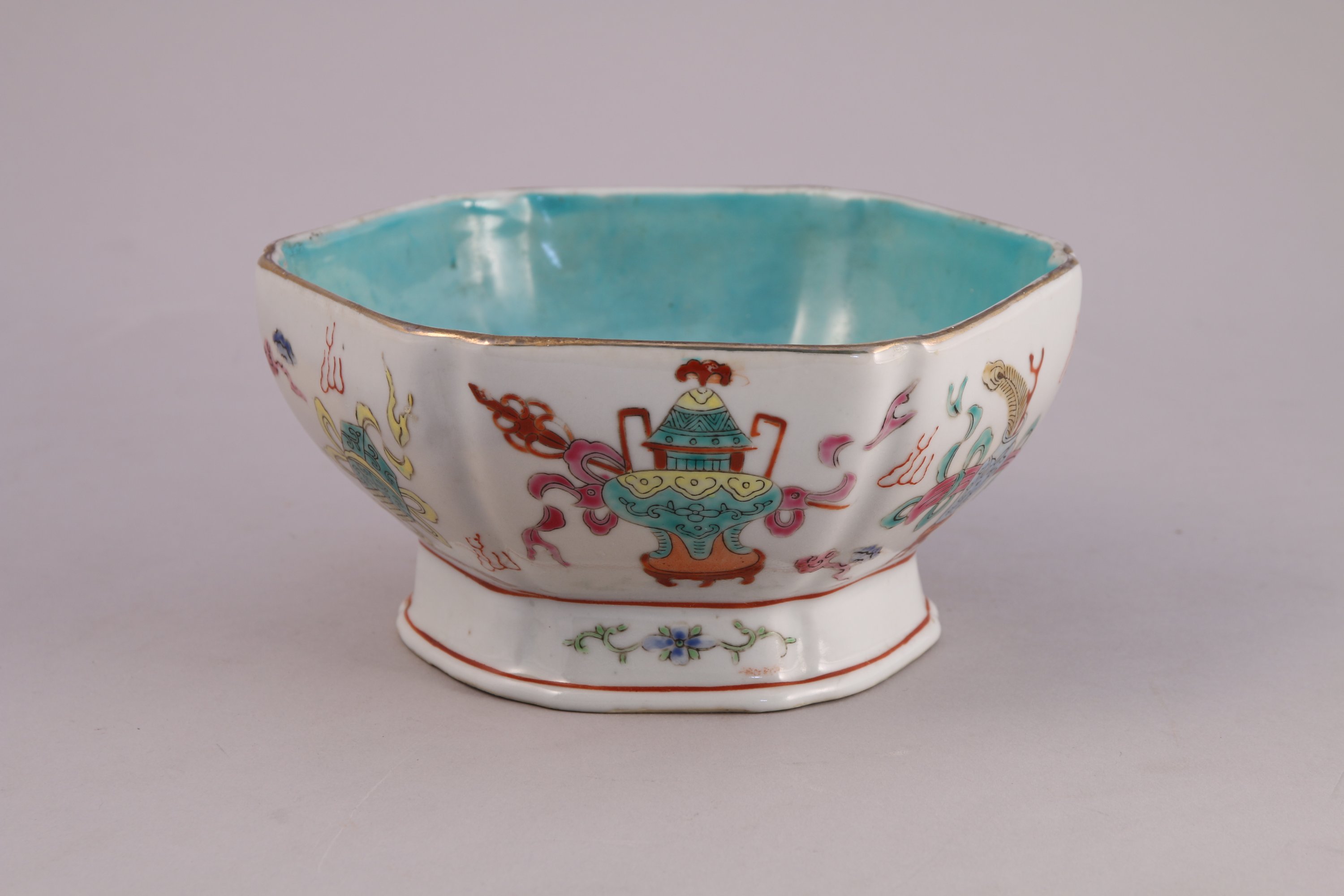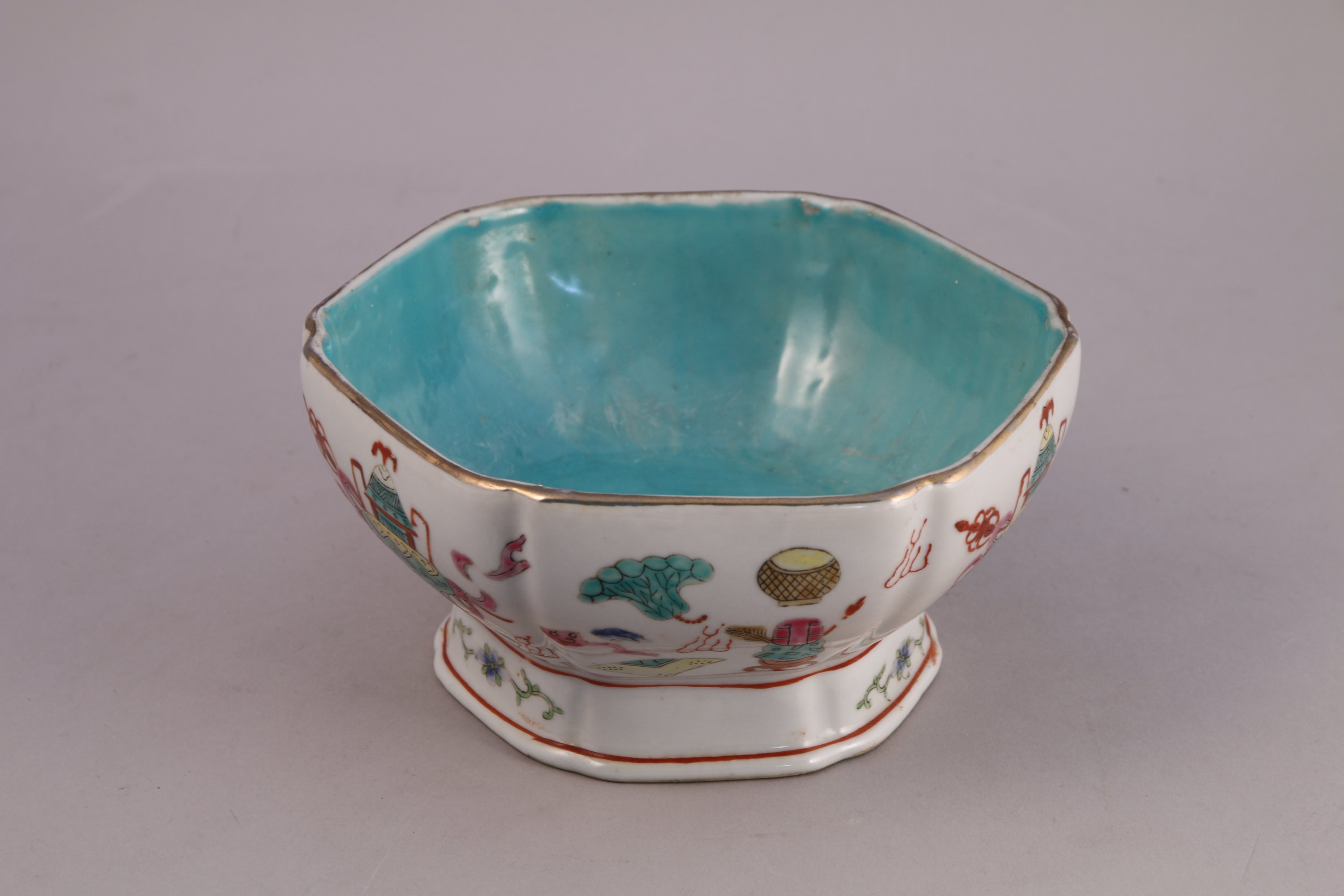CHINE, CANTON - XXeCOUPE hexagonale sur piédouche en porcelaine à...