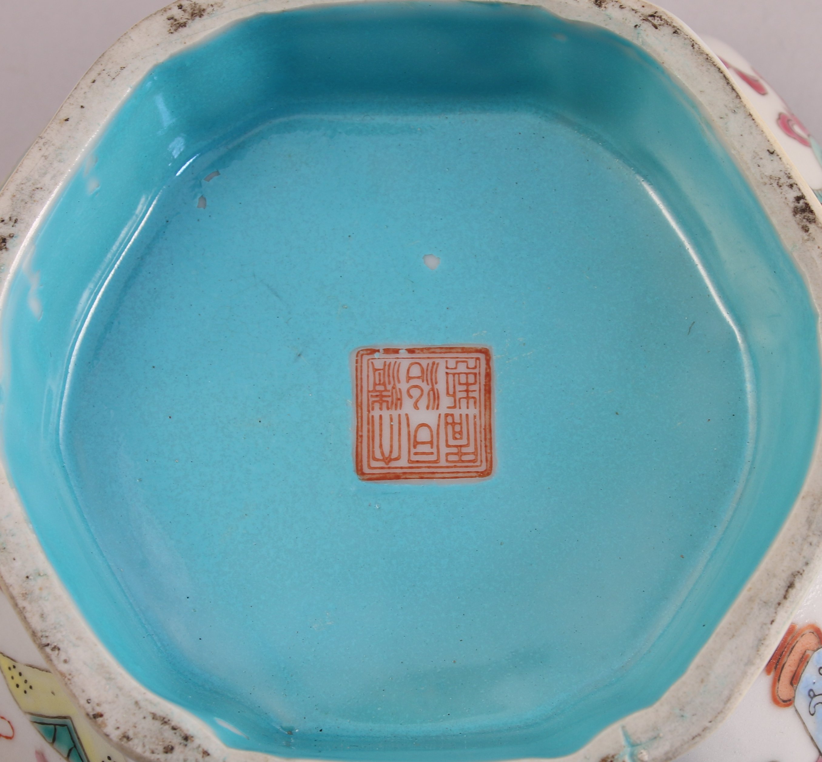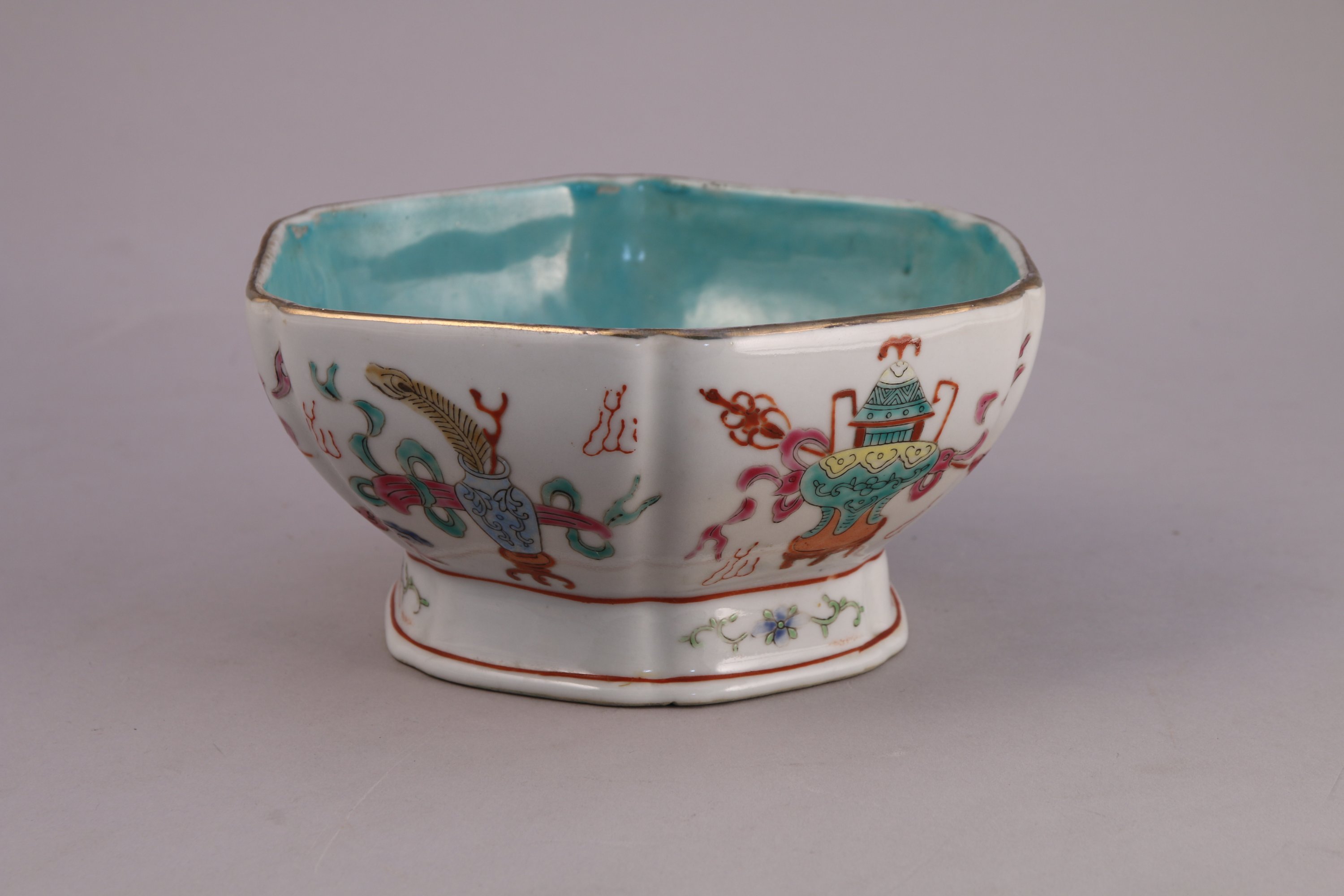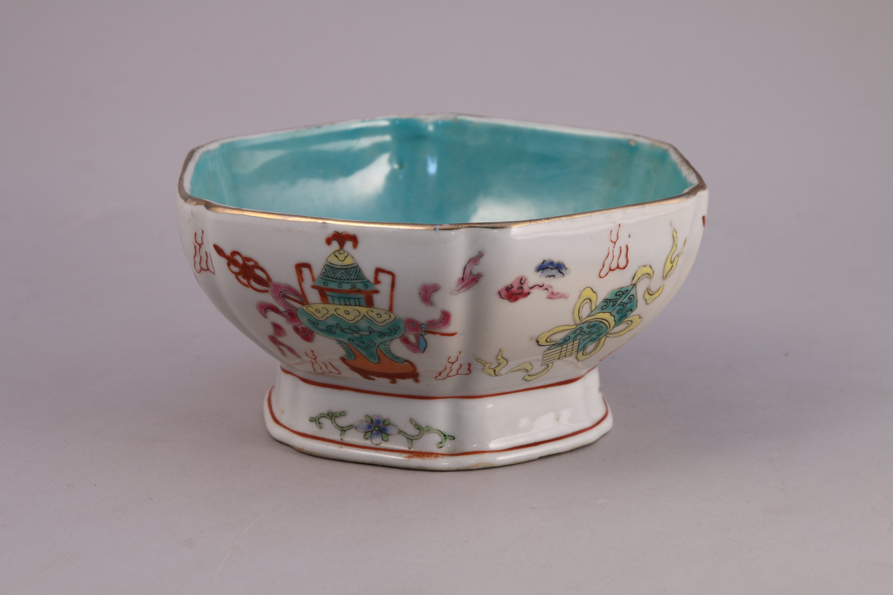 COUPE hexagonale sur piédouche en porcelaine à décor en émaux polychromes de vases et fleurs. Marques apocryphe.