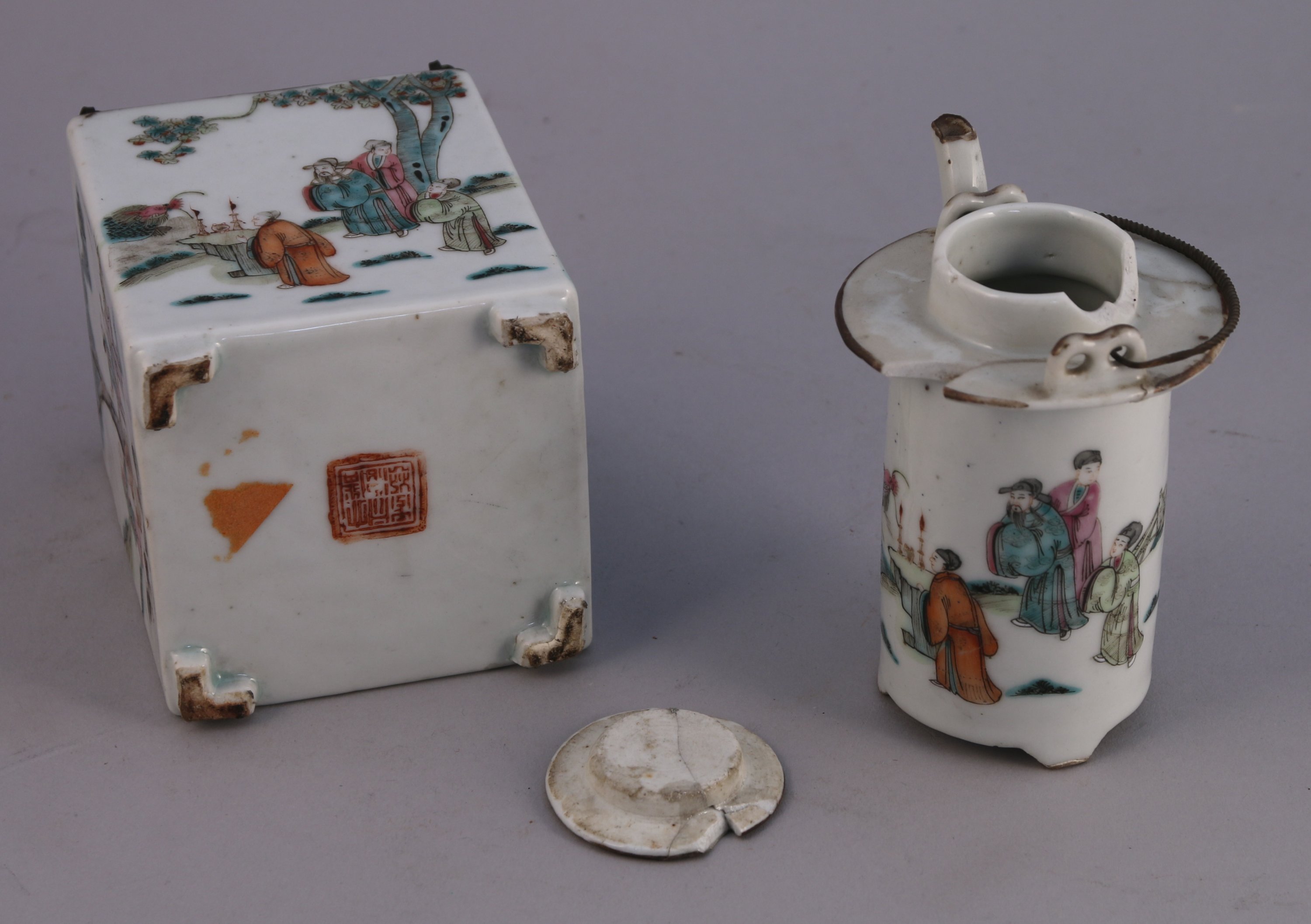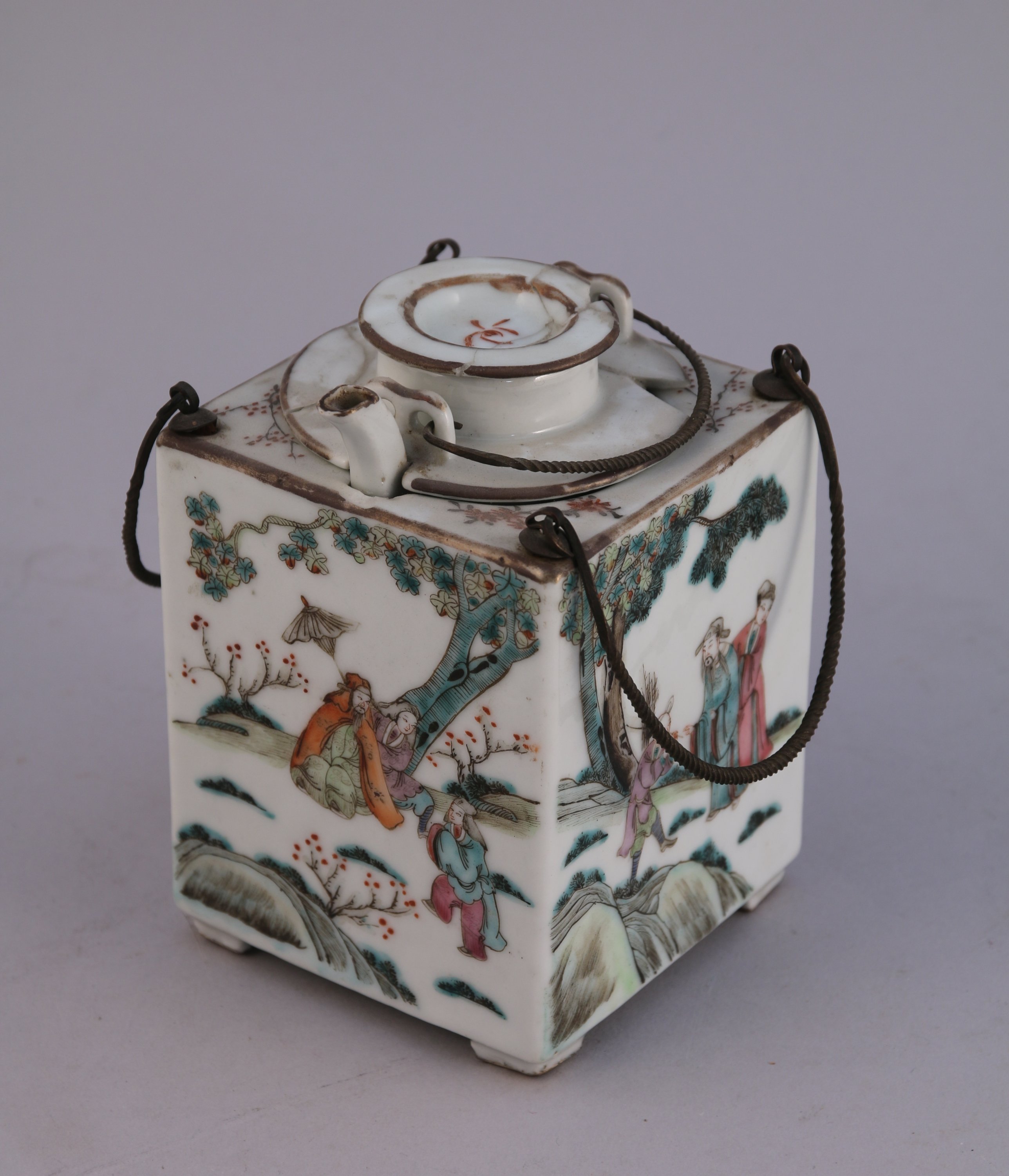 THÉIÈRE en porcelaine à décor polychorme de quatre scènes de personnages dans un paysage.