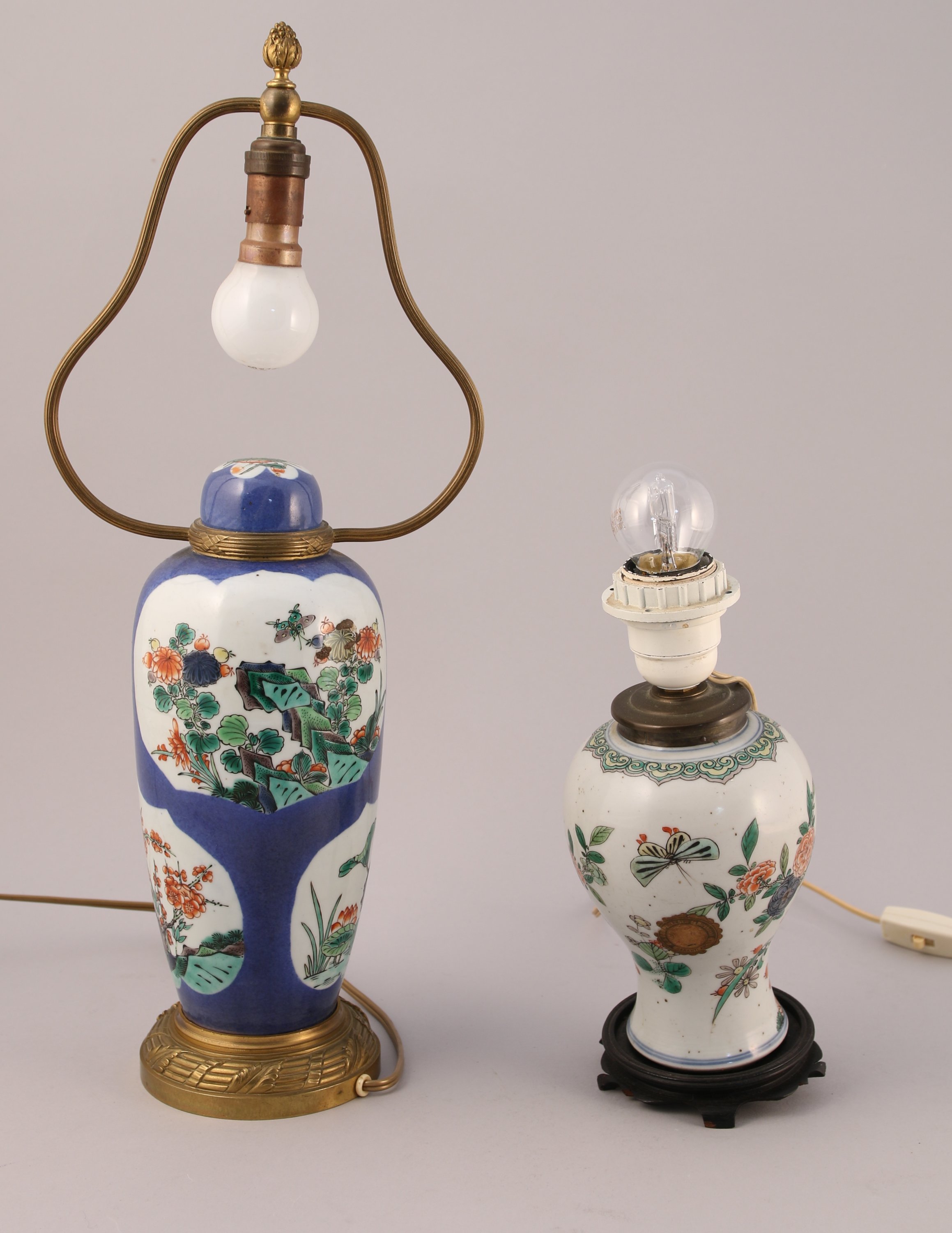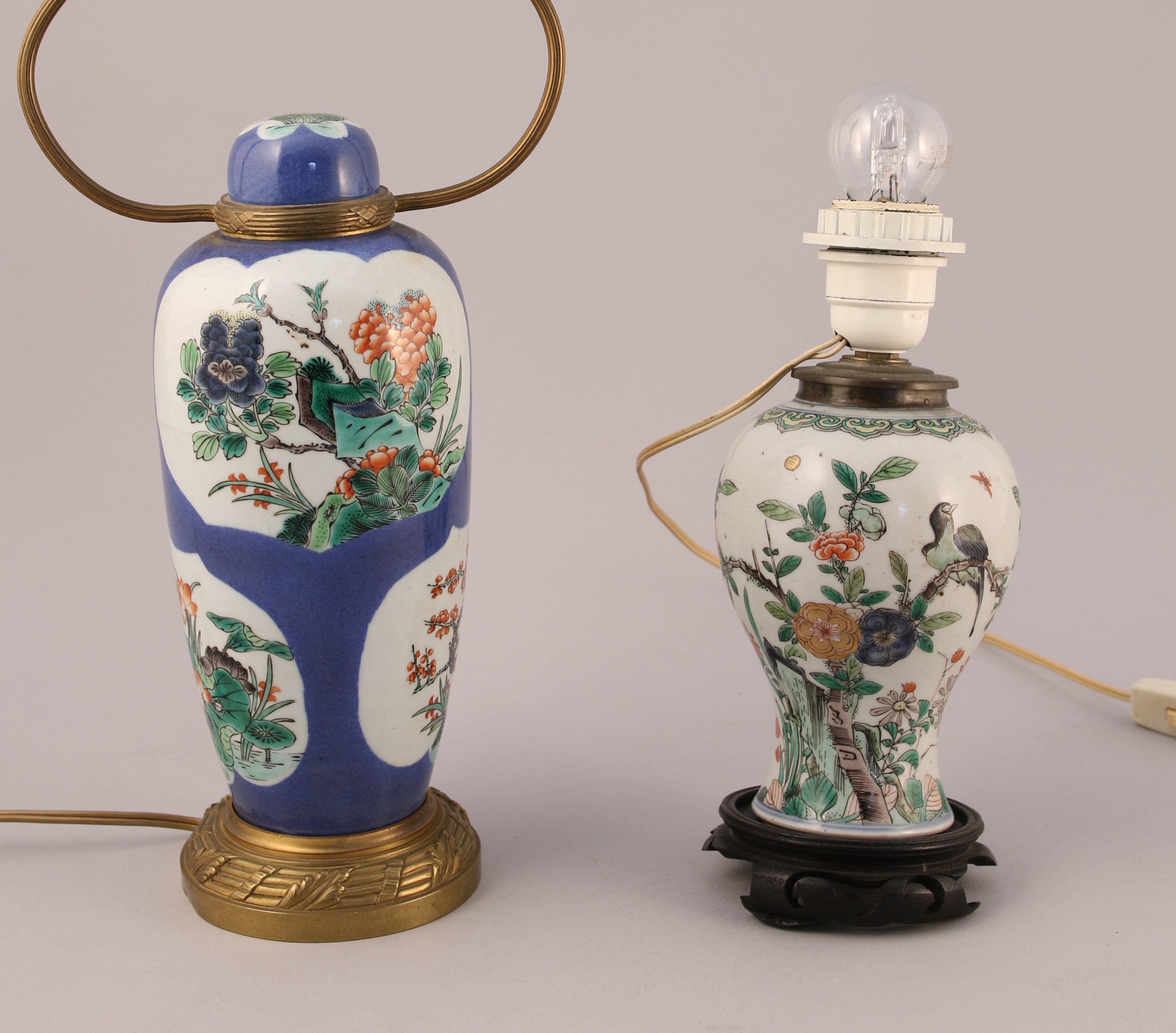 - DEUX LAMPES en porcelaine à décors polychrome. Percés pour l'électricité. Haut. 14 et 24 cm.