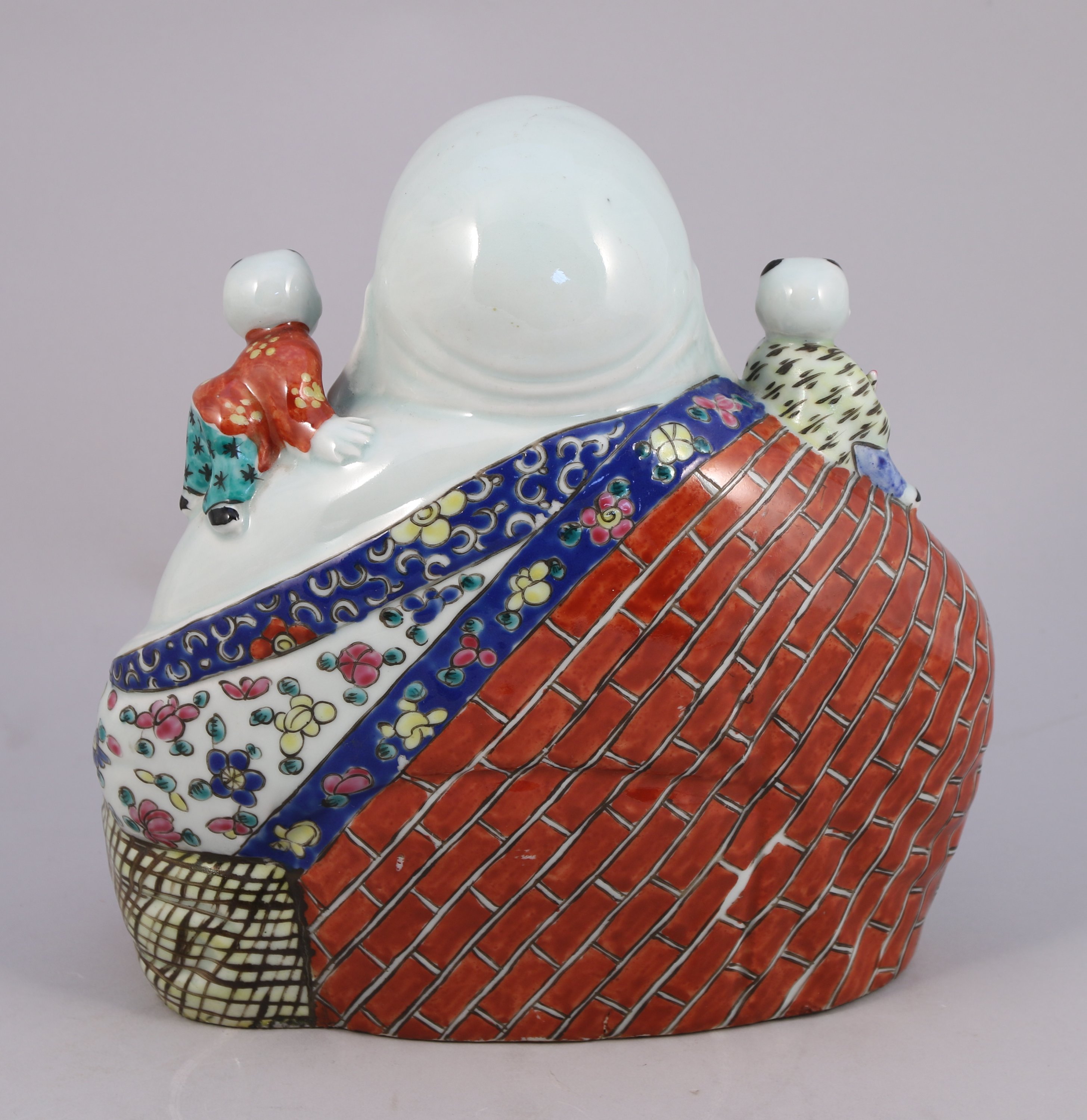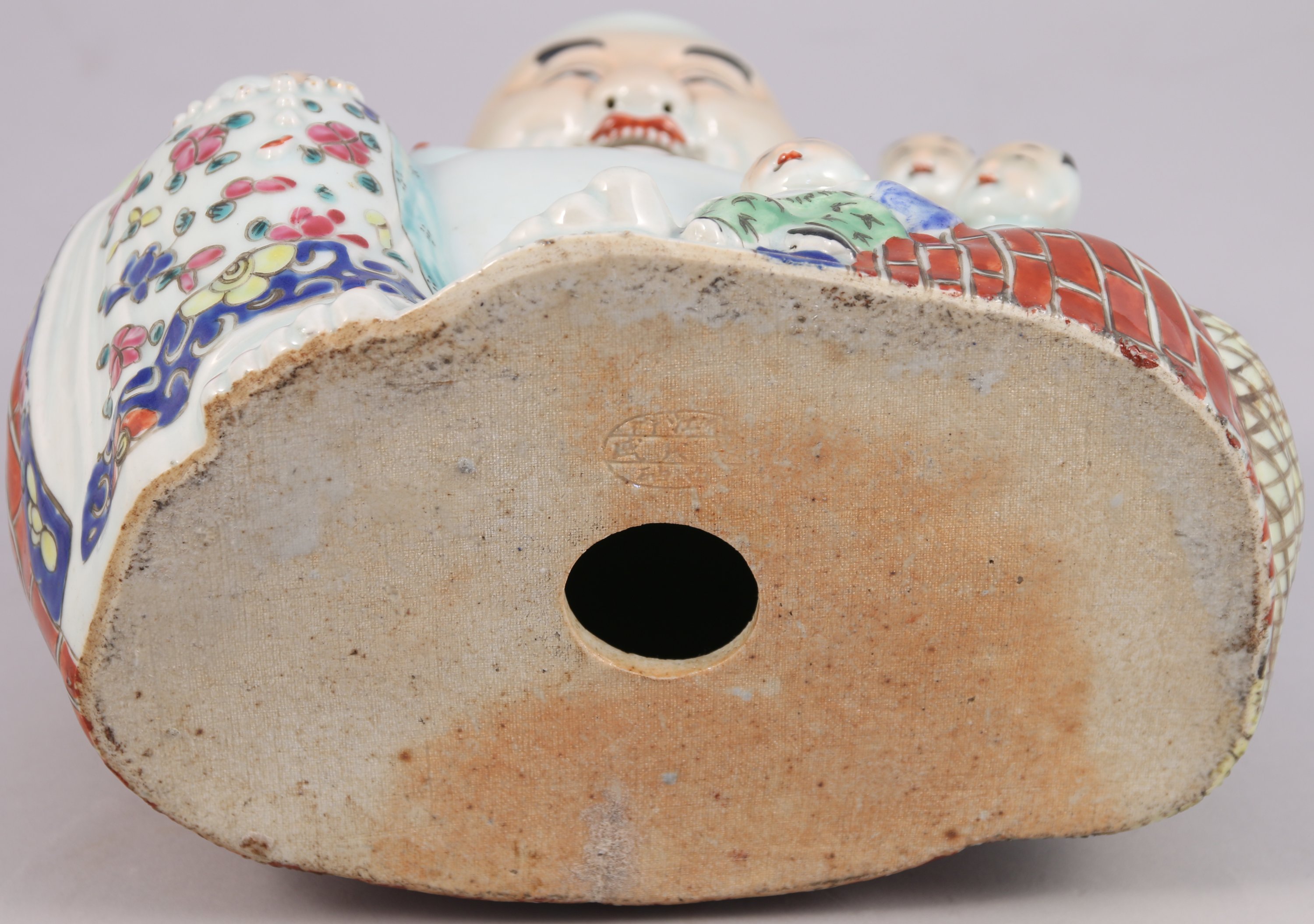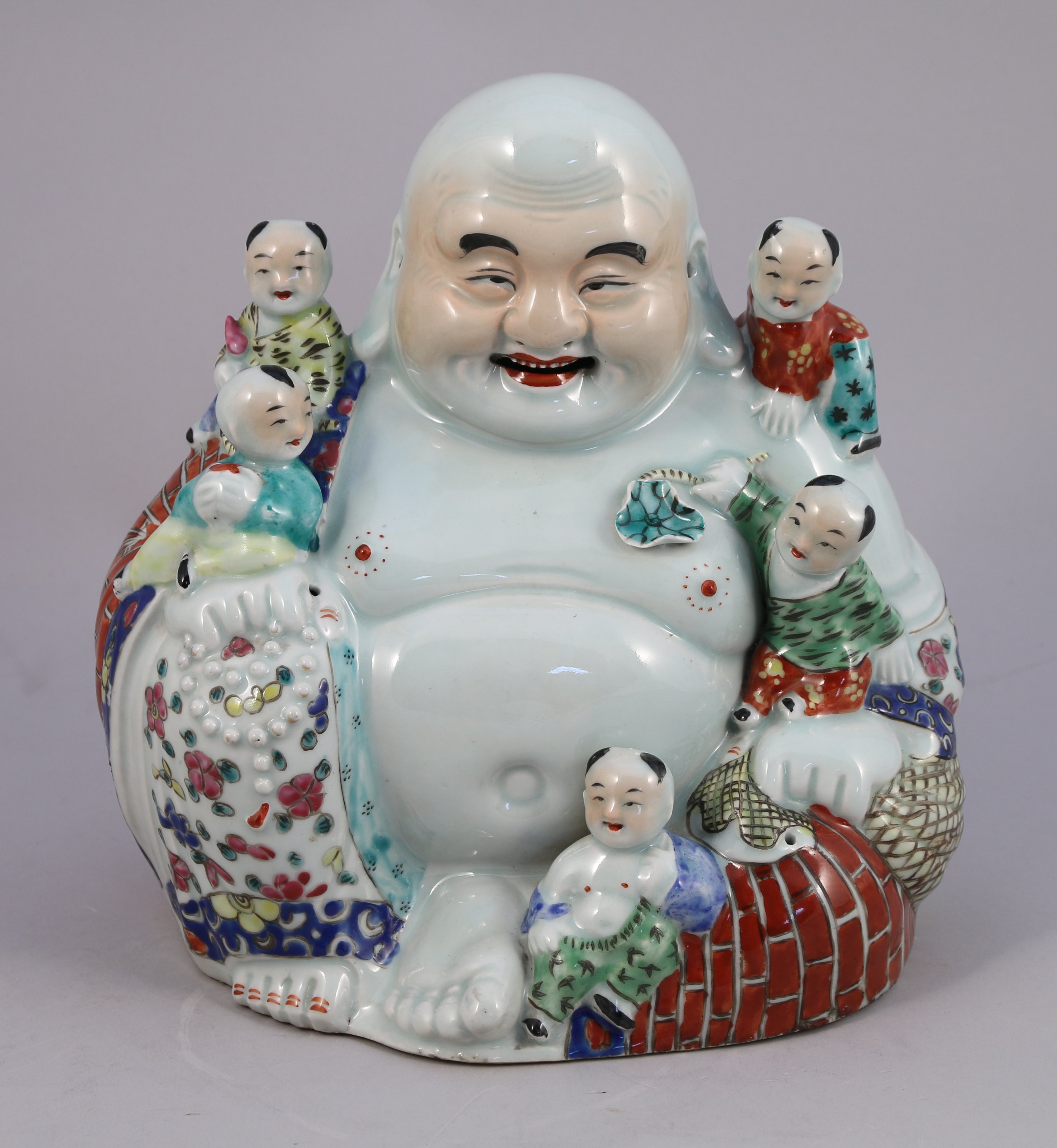 BOUDDHA RIEUR en porcelaine polychrome entouré de cinq enfants. Marques en creux au revers.