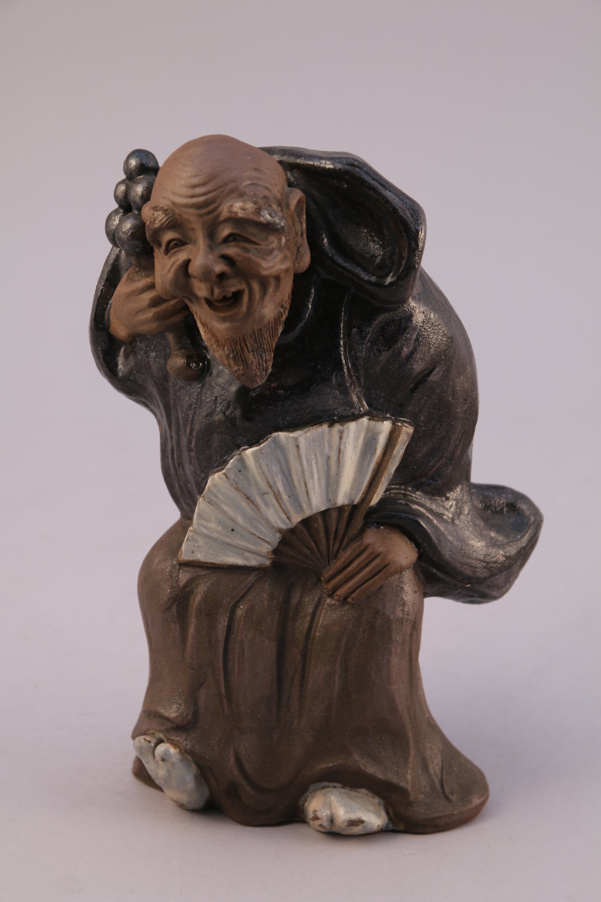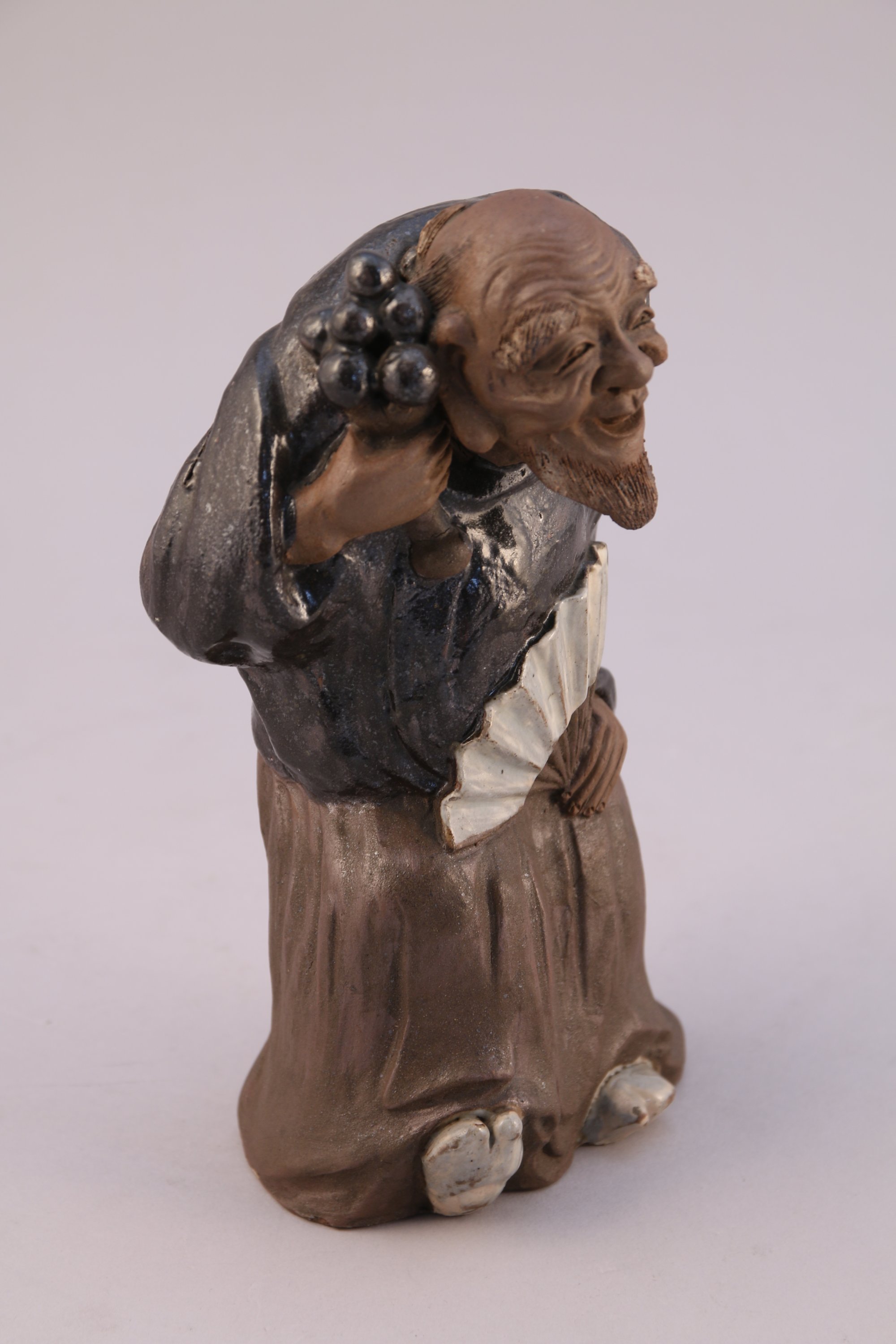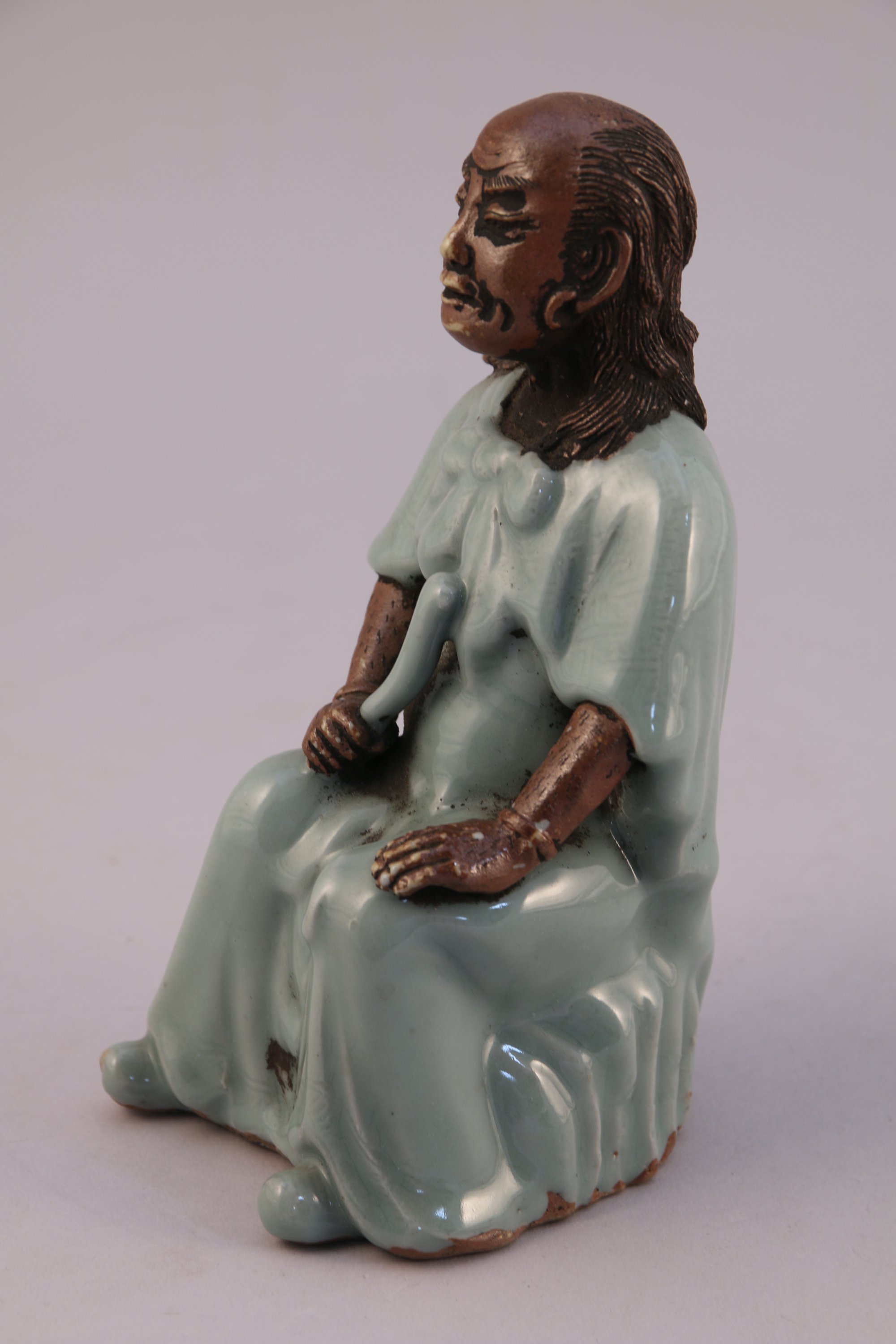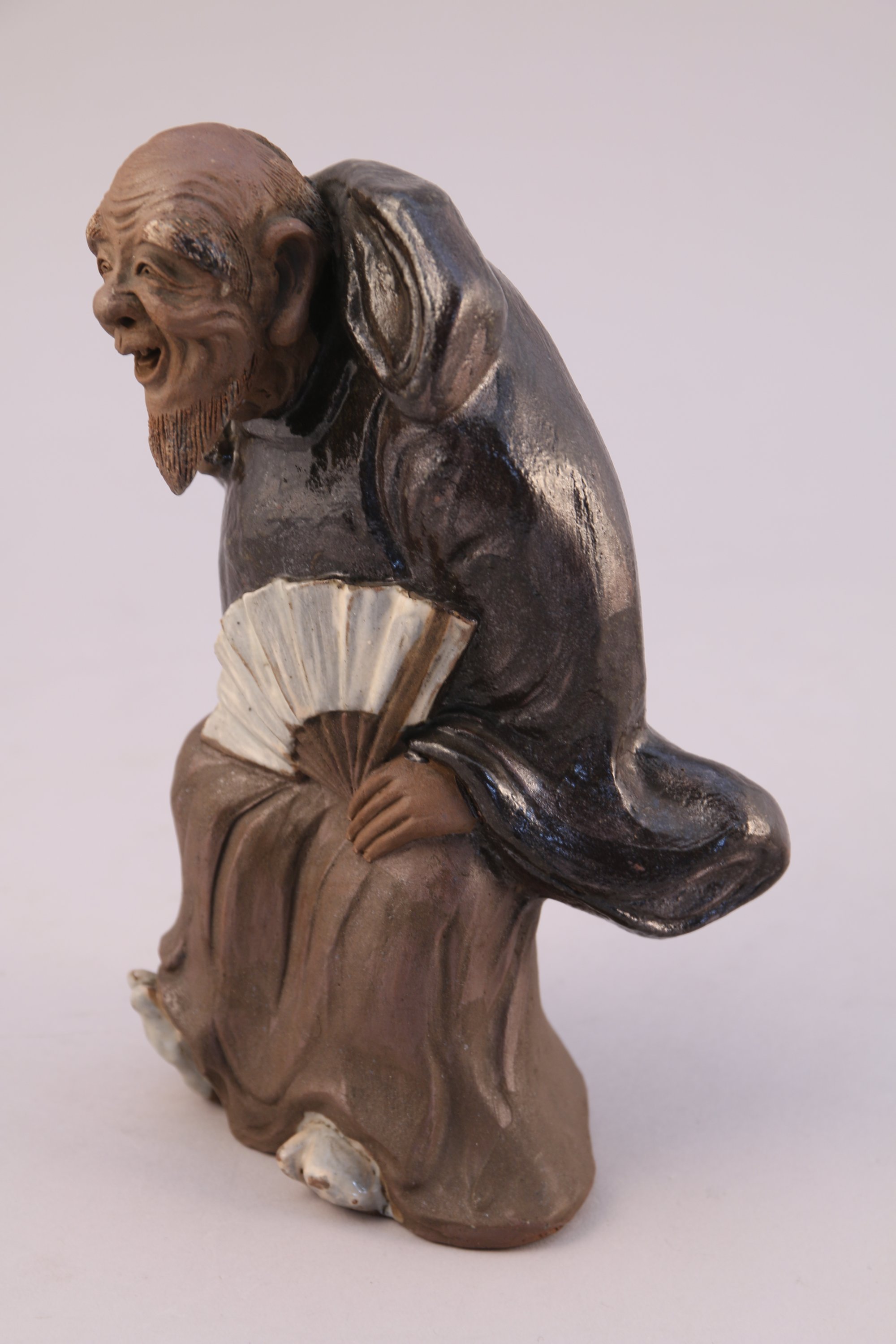 TROIS PERSONNAGES en grès émaillé: veillard à l'éventail, lettré assis, dignitaire.