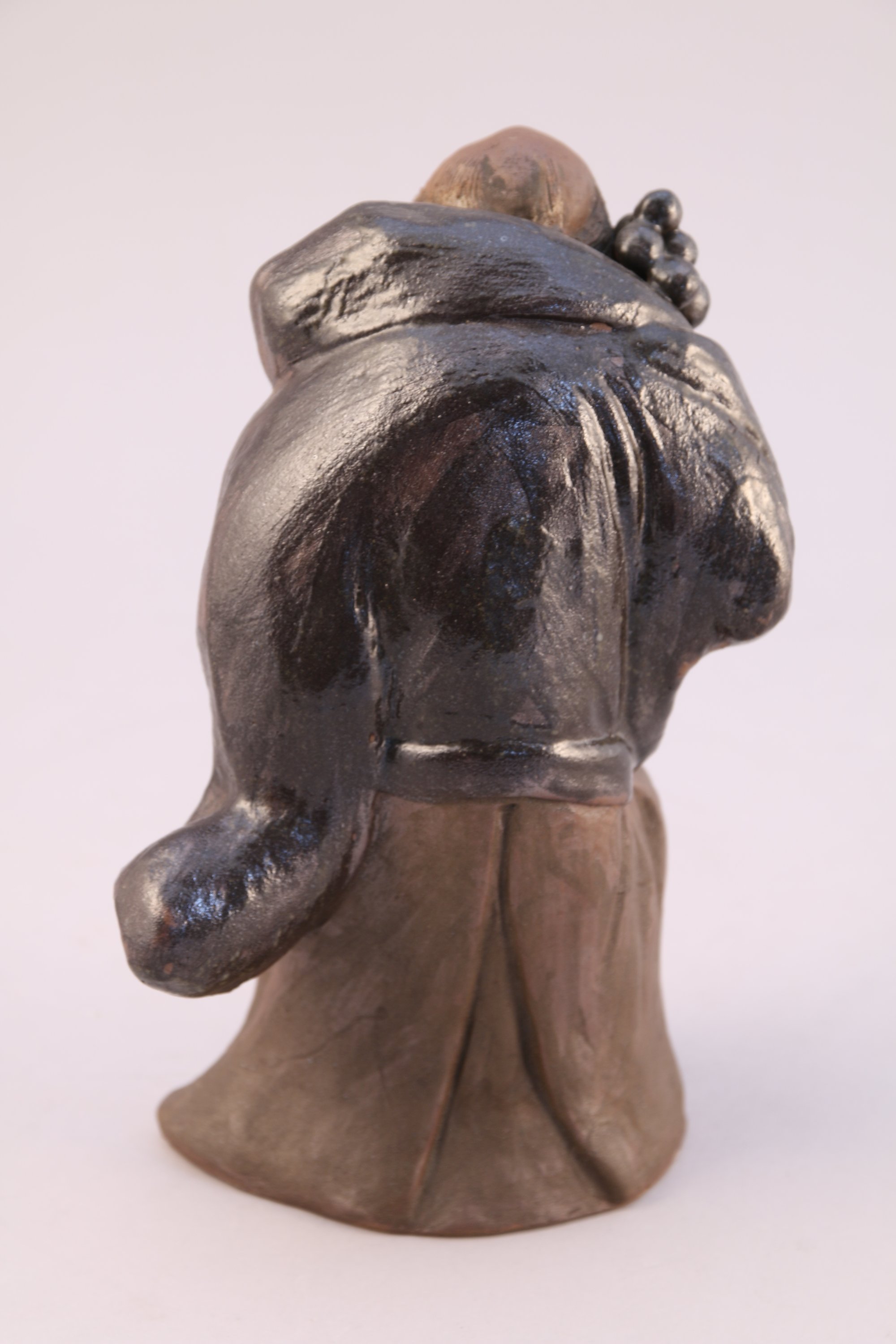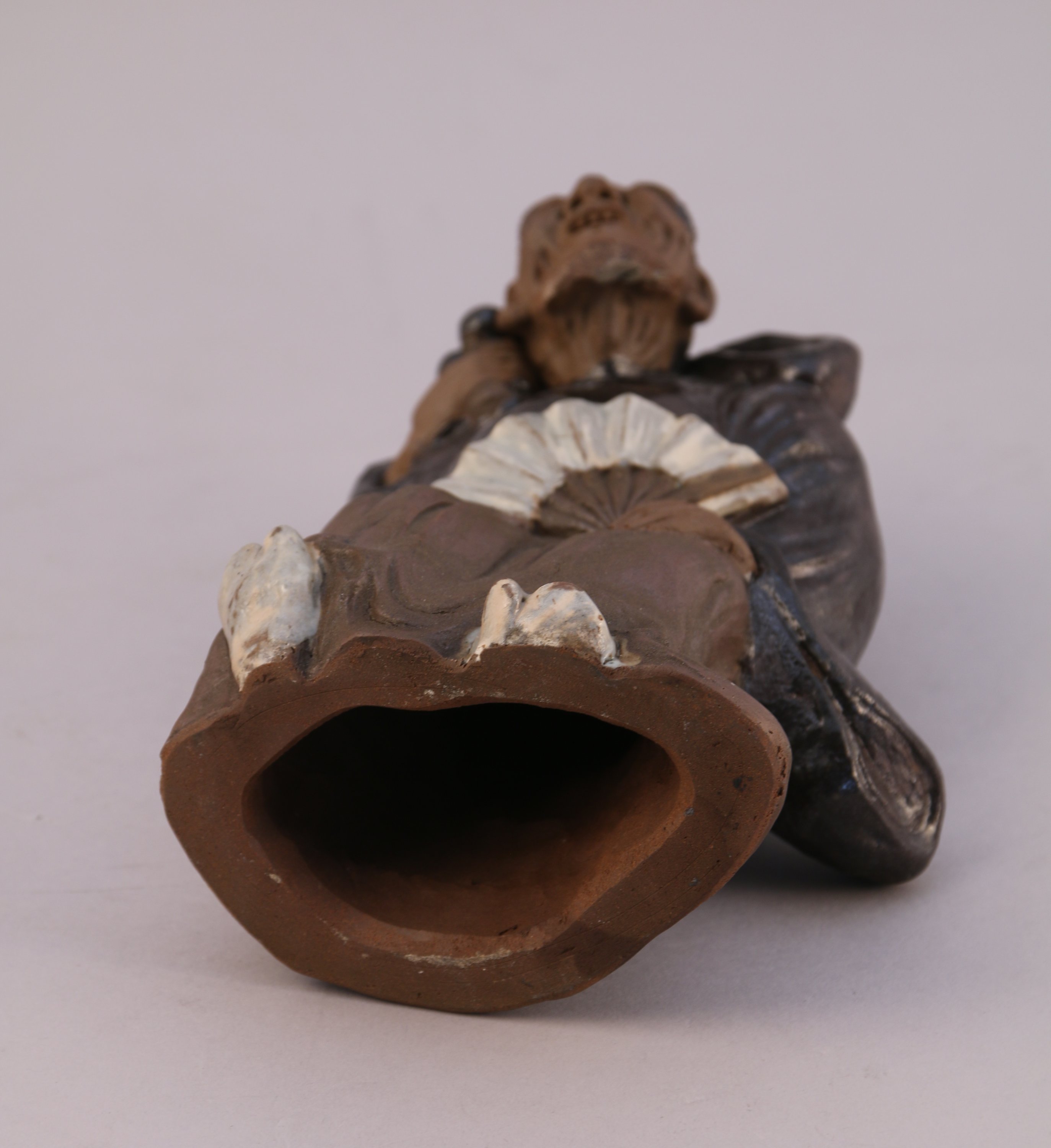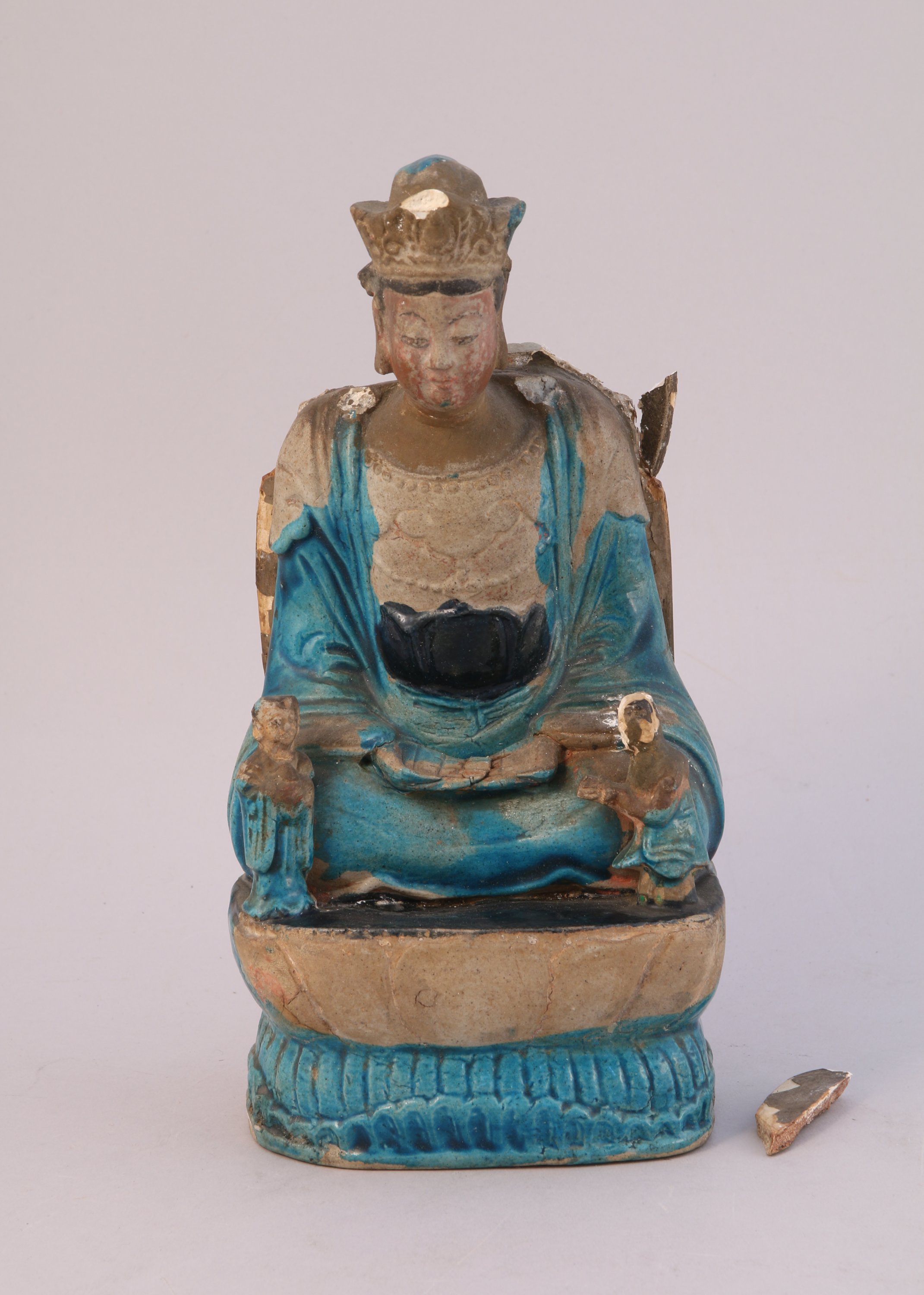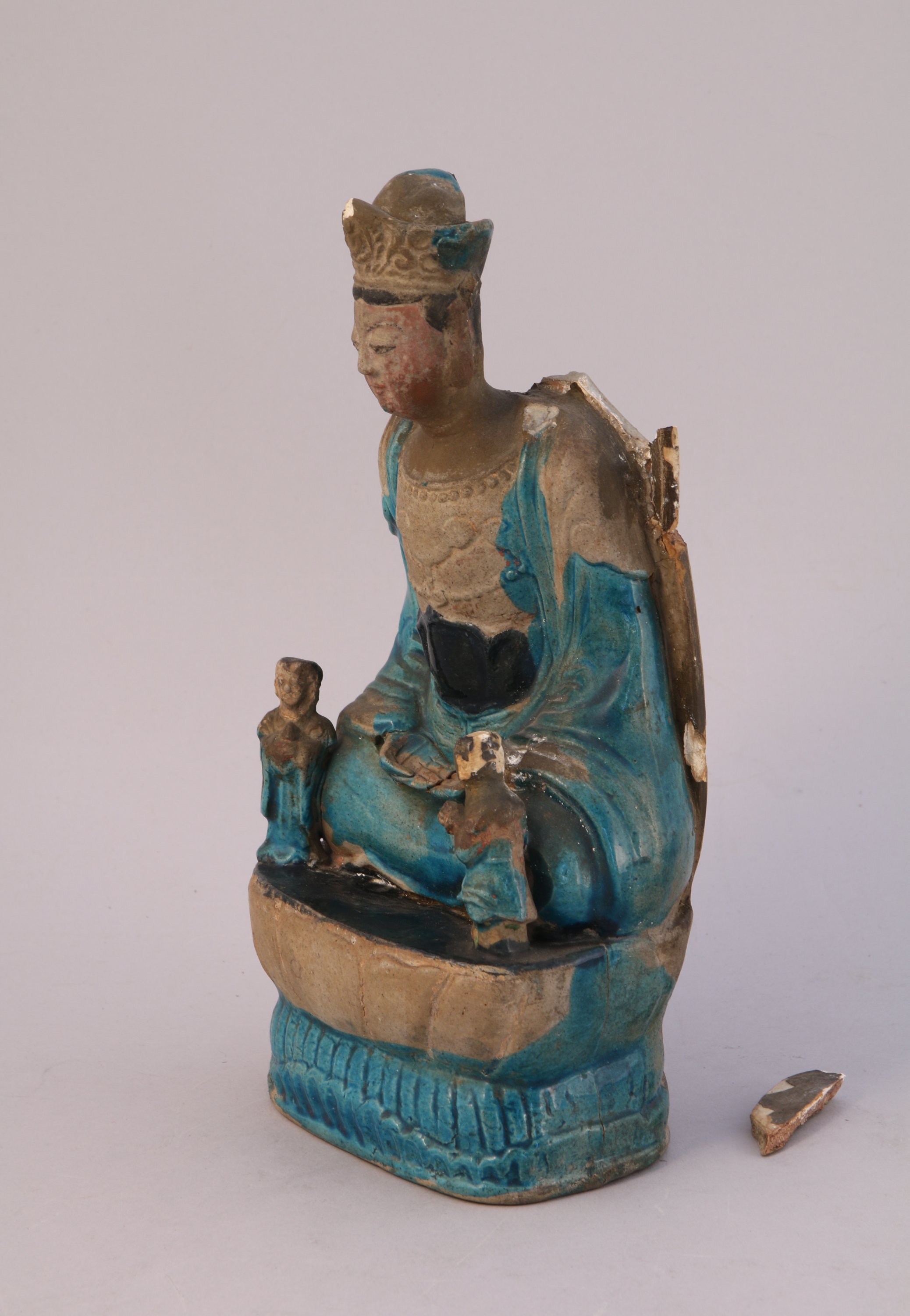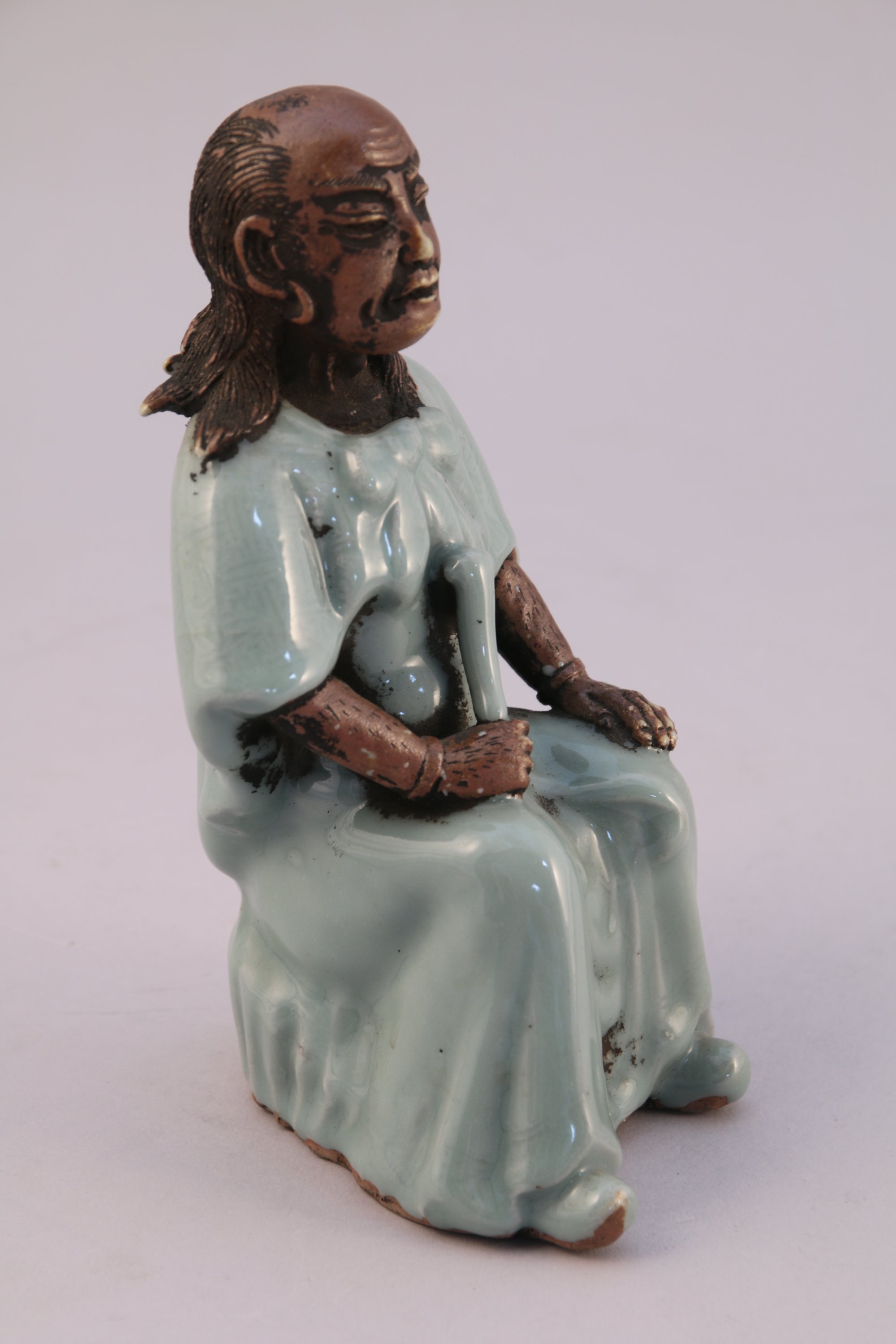 TROIS PERSONNAGES en grès émaillé: veillard à l'éventail, lettré assis, dignitaire.
