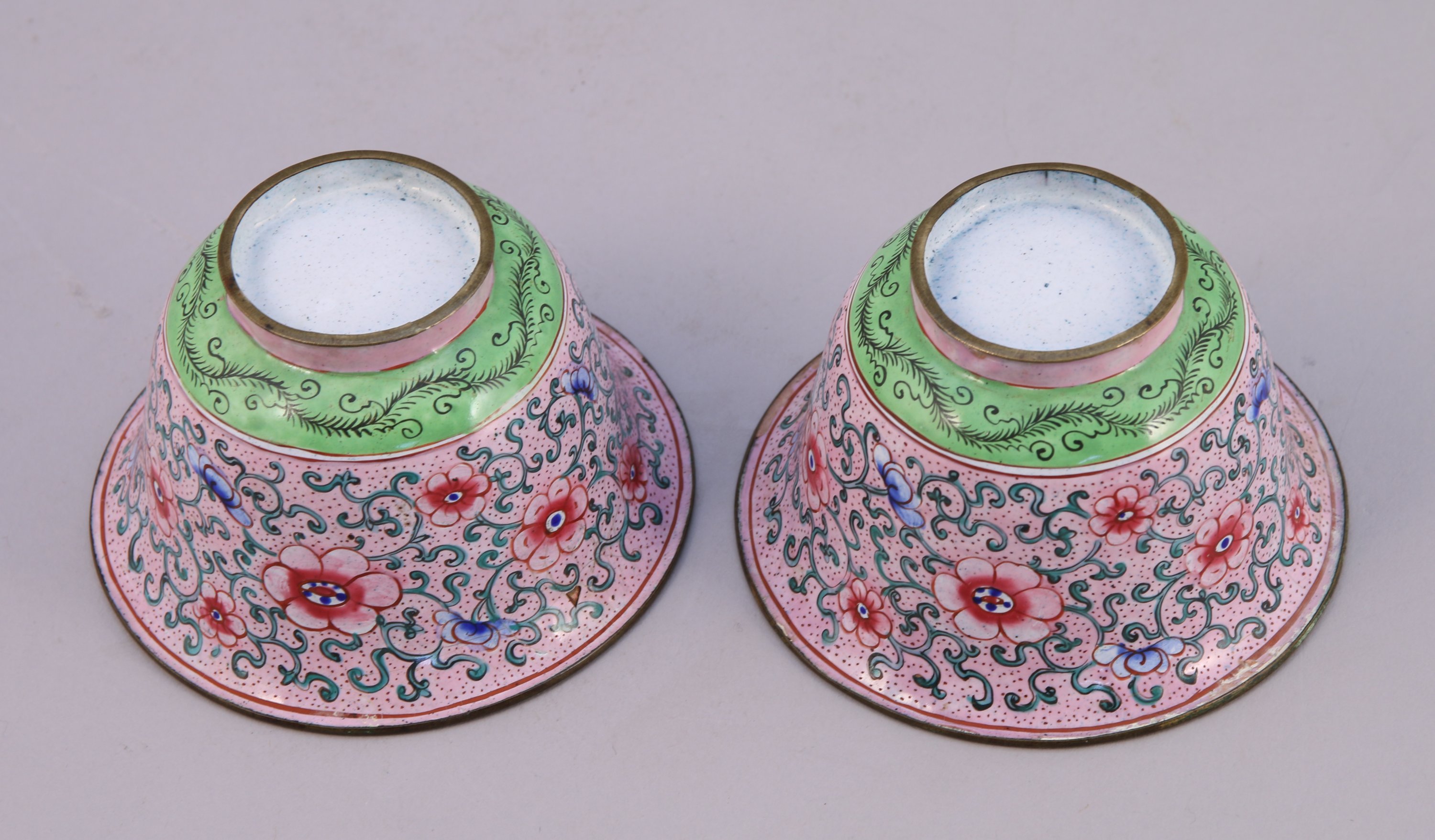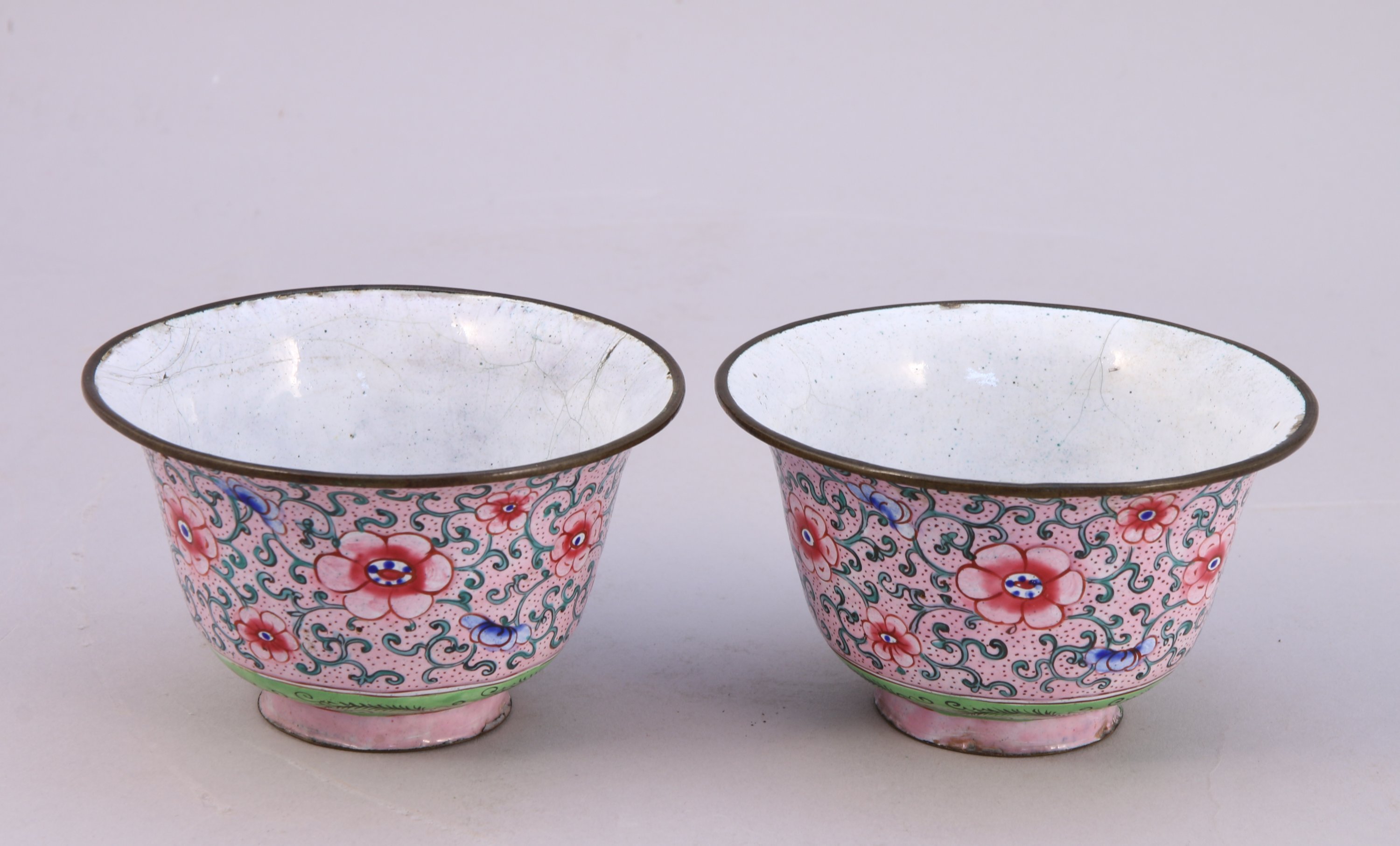 Paire de COUPES en métal émaillé polychrome d'un décor floral sur fond rose.