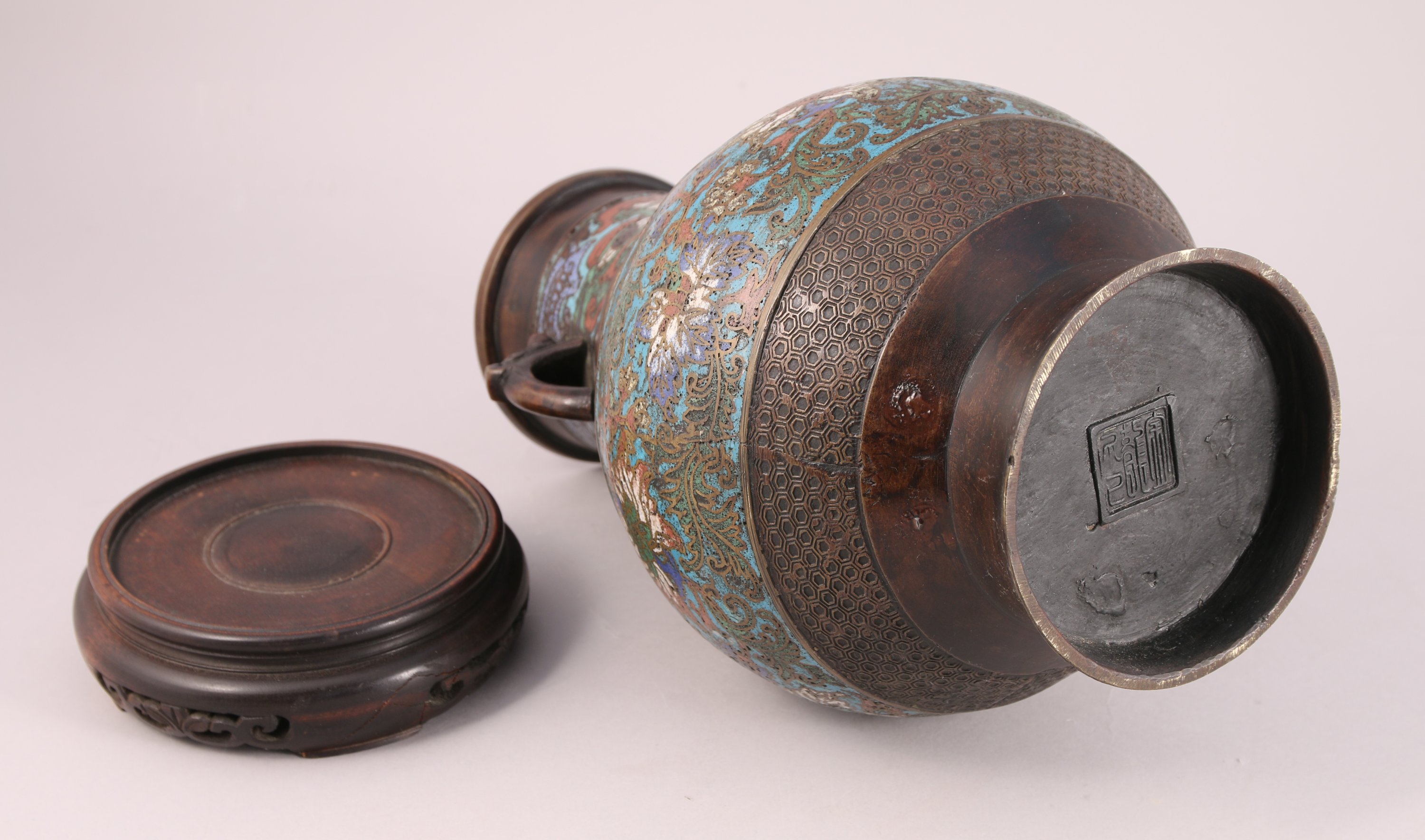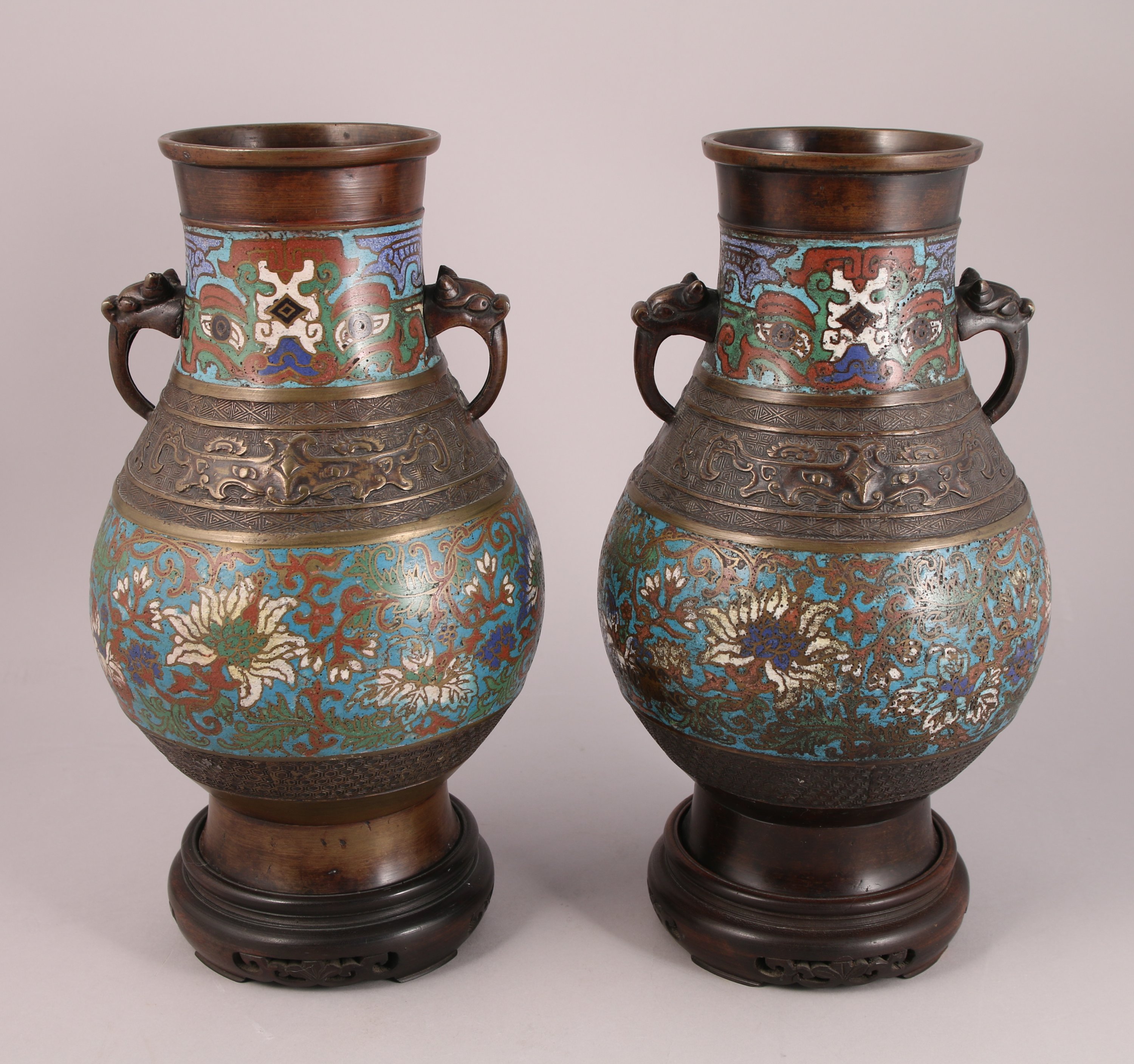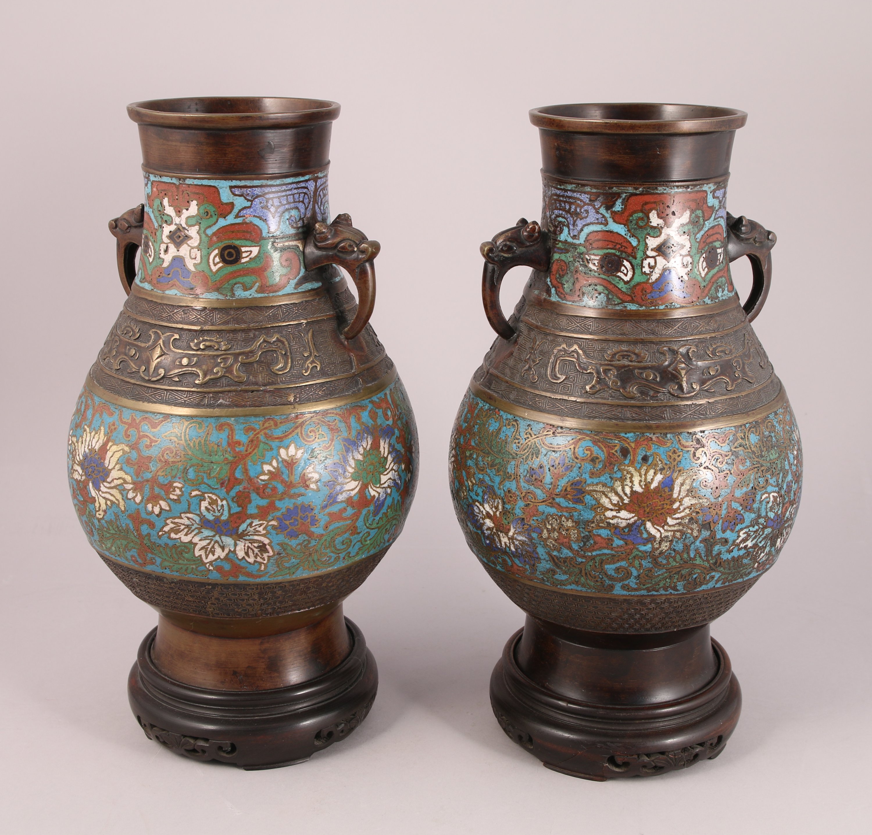 Paire de VASES aux anses zoomorphes en cloisonné, à décors de fleurs. Socles en bois.