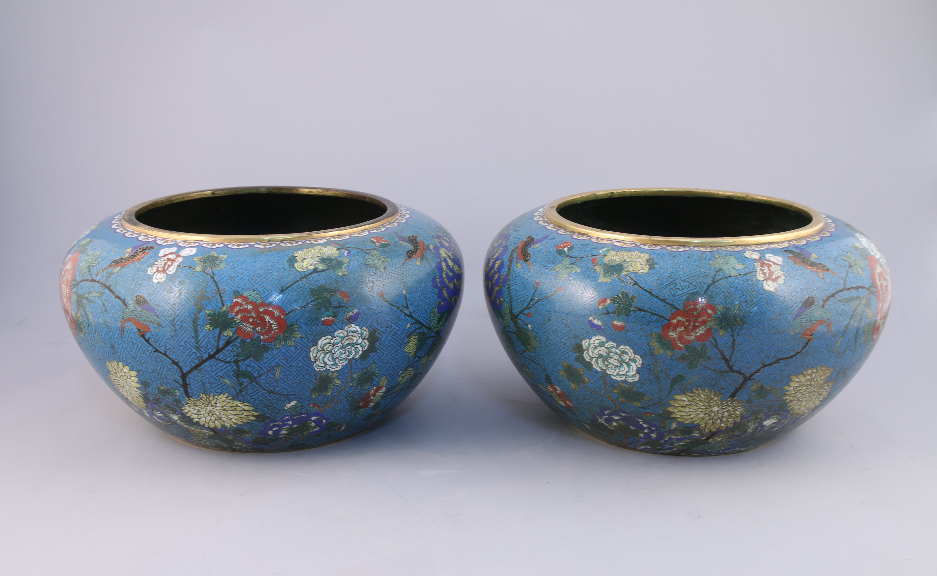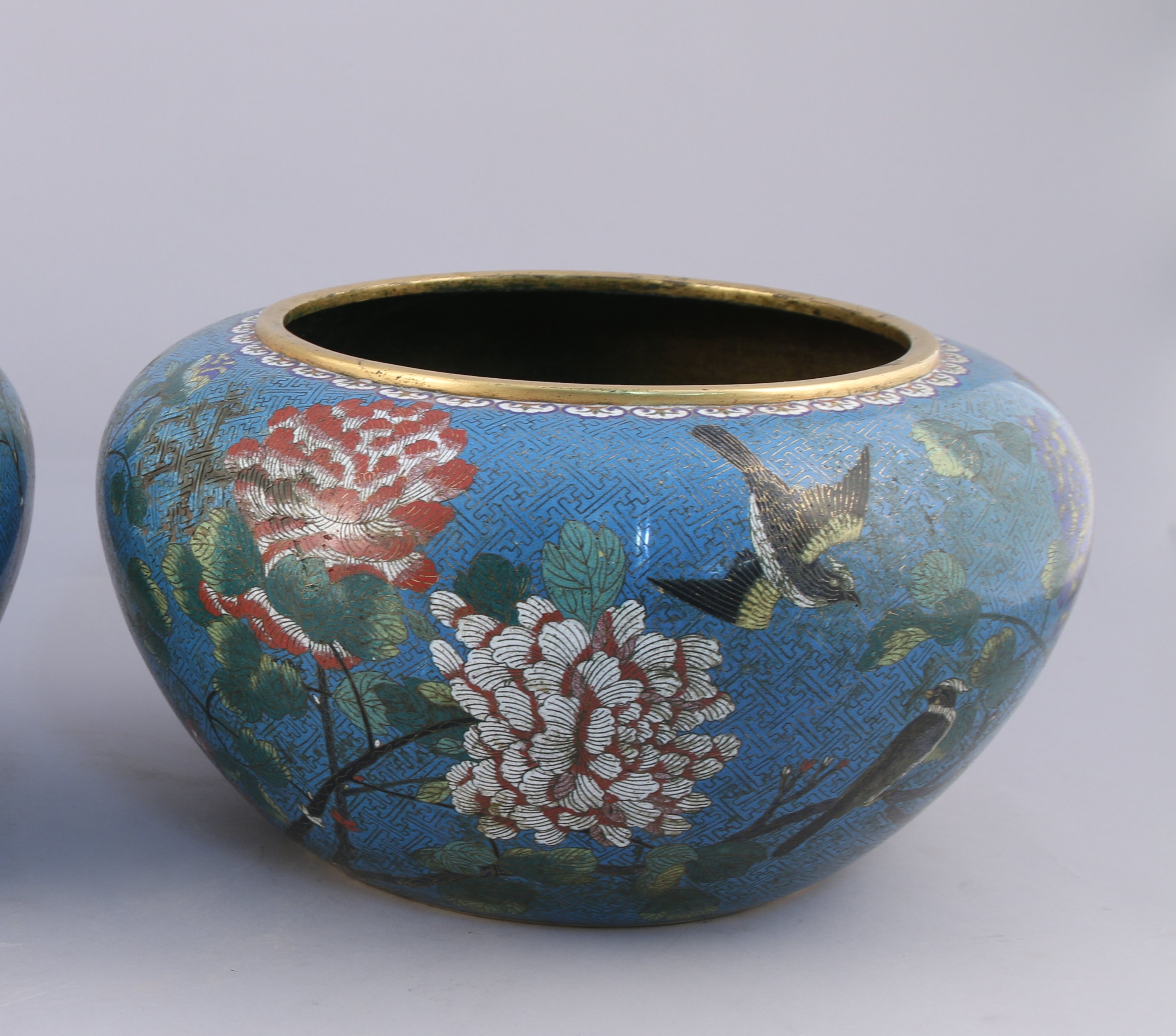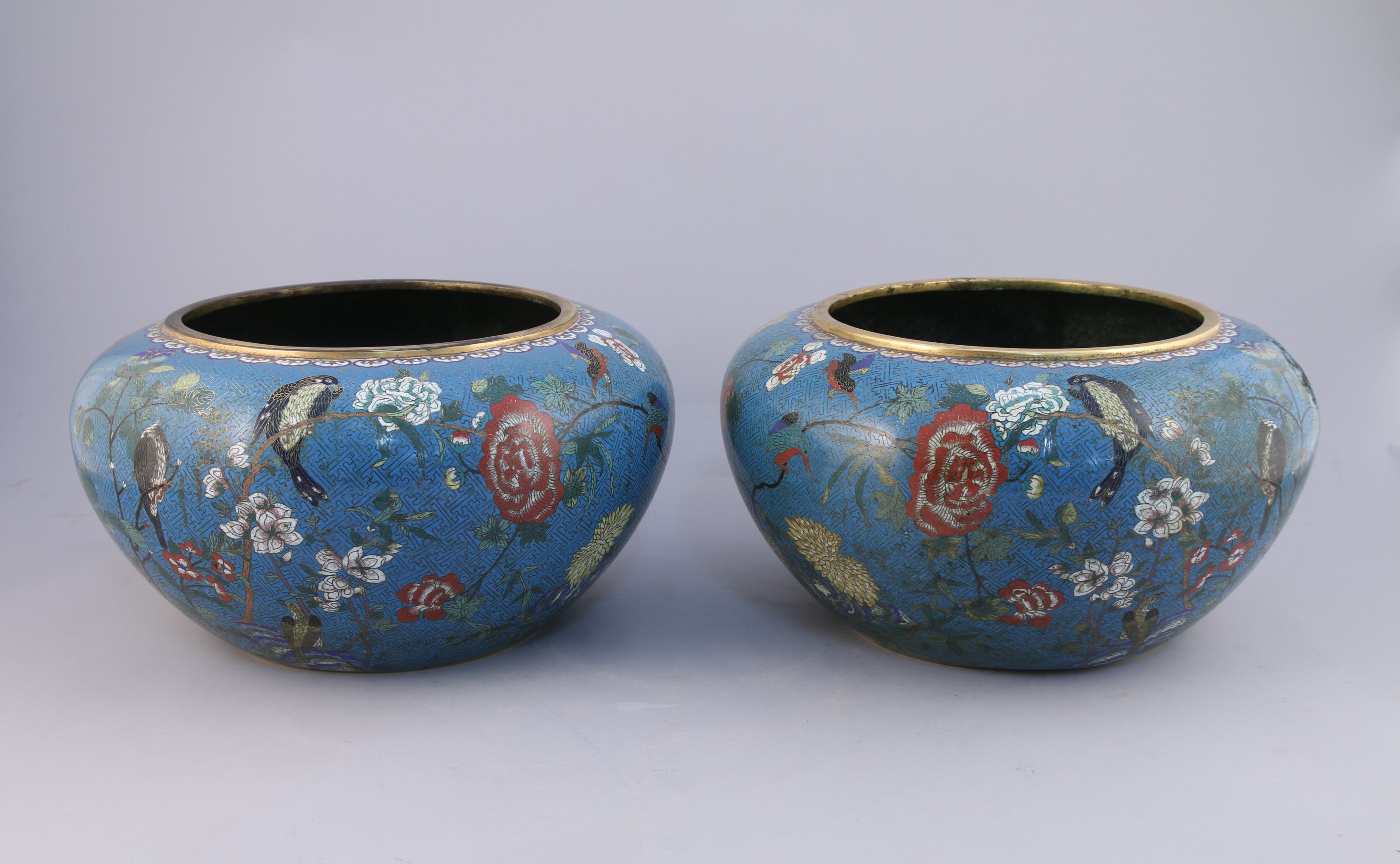 Paire de VASQUES en bronze et émaux cloisonnés à décor d'oiseaux parmi les pivoines en fleurs, sur fond turquoise à motifs de svastika, le rebord orné d'une frise de lingzhi. Marque De Cheng.