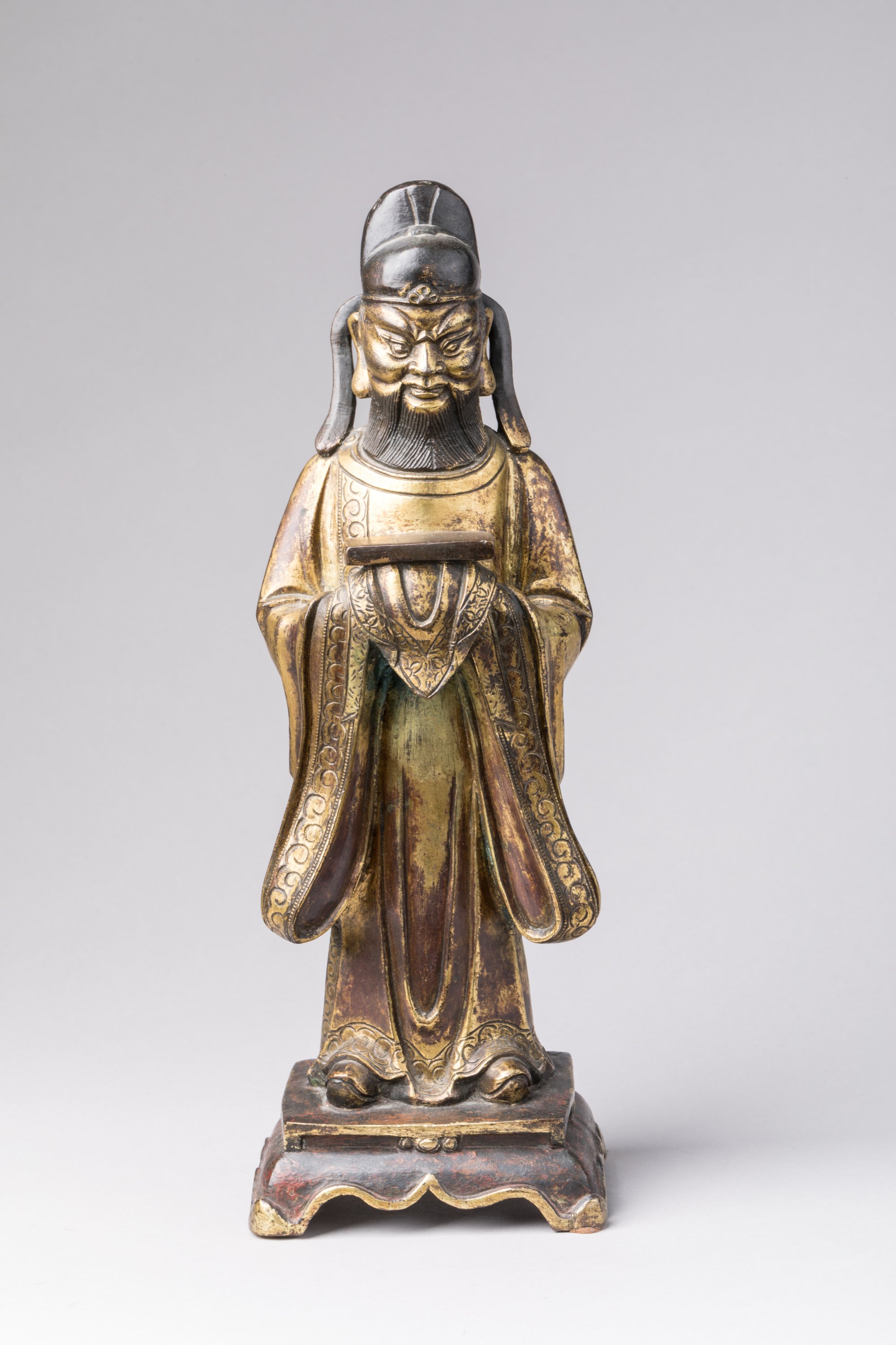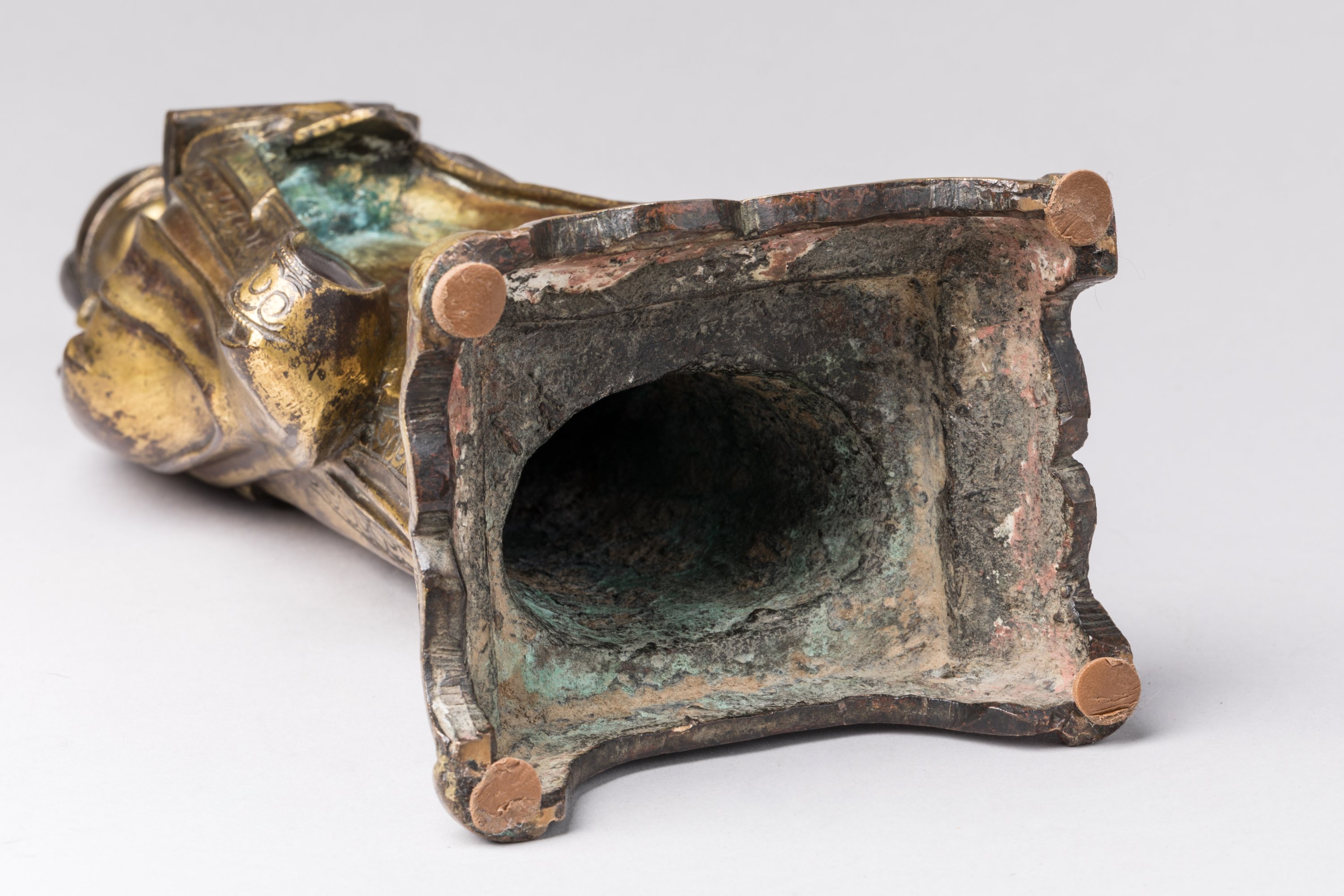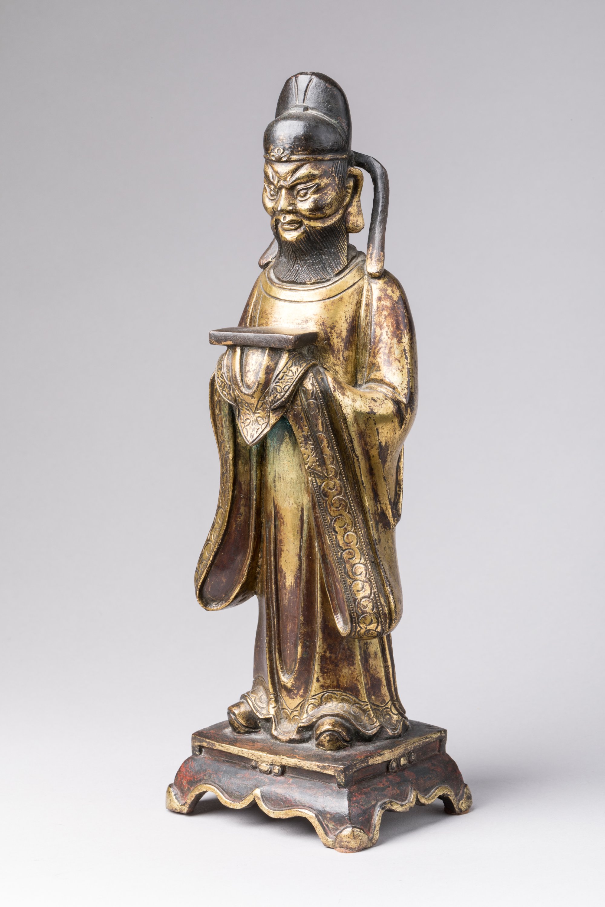DIGNITAIRE en bronze doré, debout sur un socle rectangulaire et tenant une tablette sur ses mains jointes.