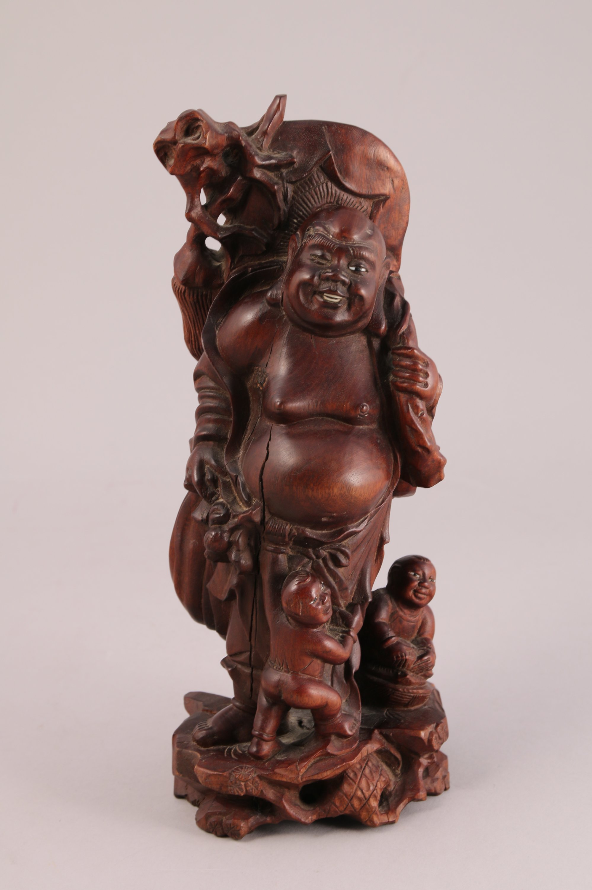 BOUDDHA RIEUR en bois sculpté figurant le Budai sur un tertre.