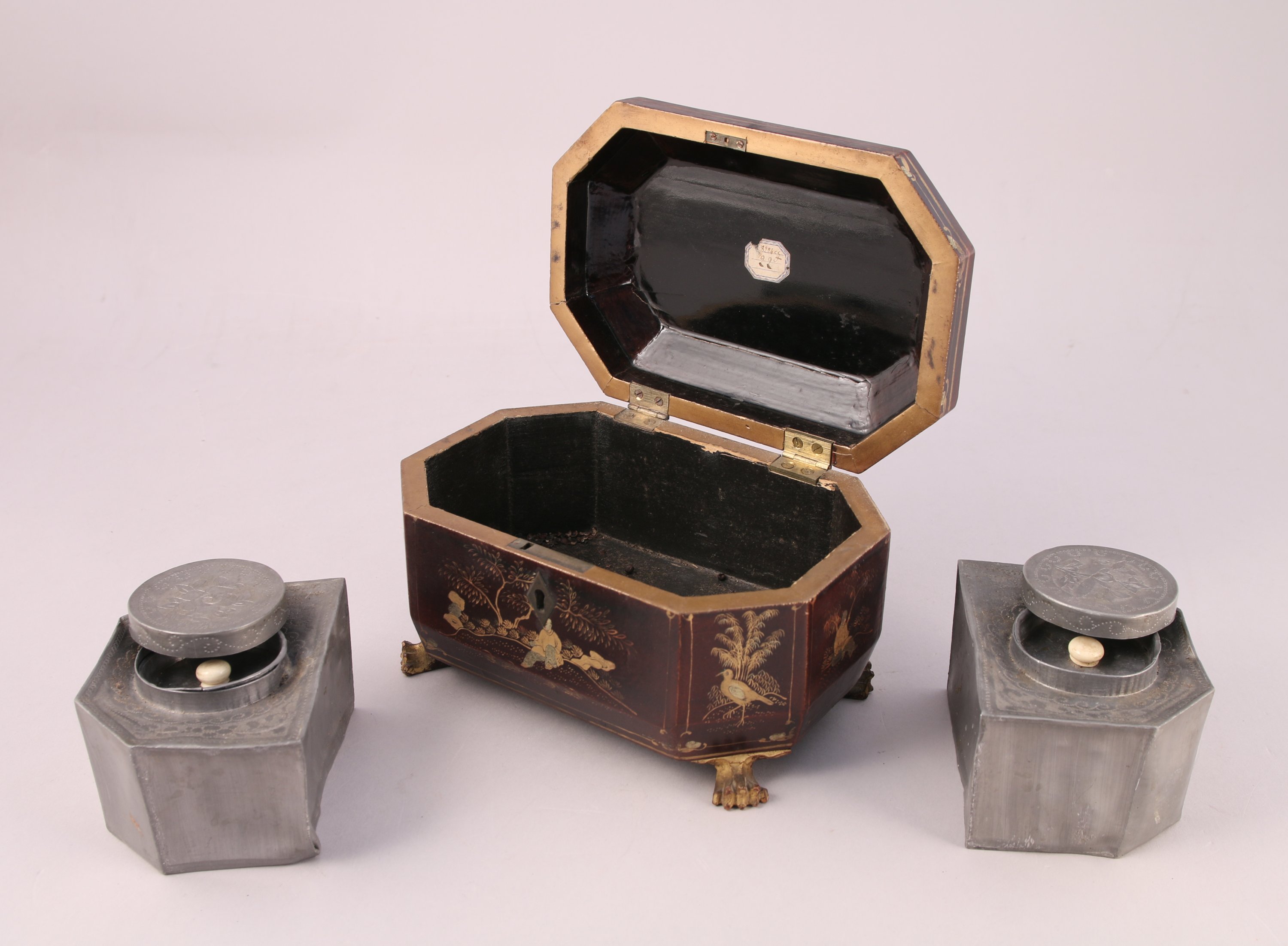 BOÎTE À THÉ en laque à la façon de la Chine, de forme lobée, animée d'un décor de personnages, de fleurs et d'oiseaux. L'intérieur comprend deux boîtiers à double couvercle en étain gravé de fleurs et de perles.