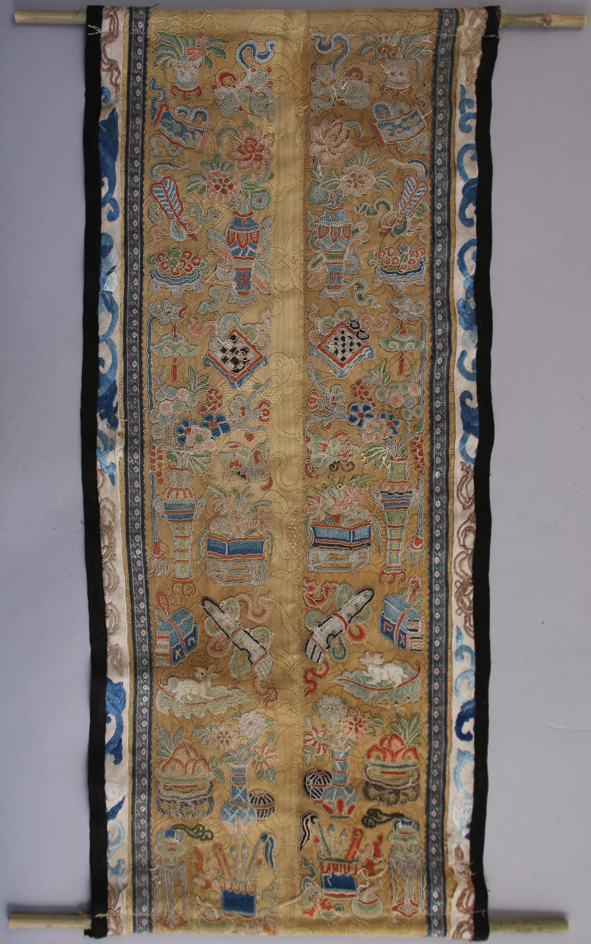 Paire de BANDES DE MANCHES DE MANDARIN en soie jaune brodé de sujets mobiliers.