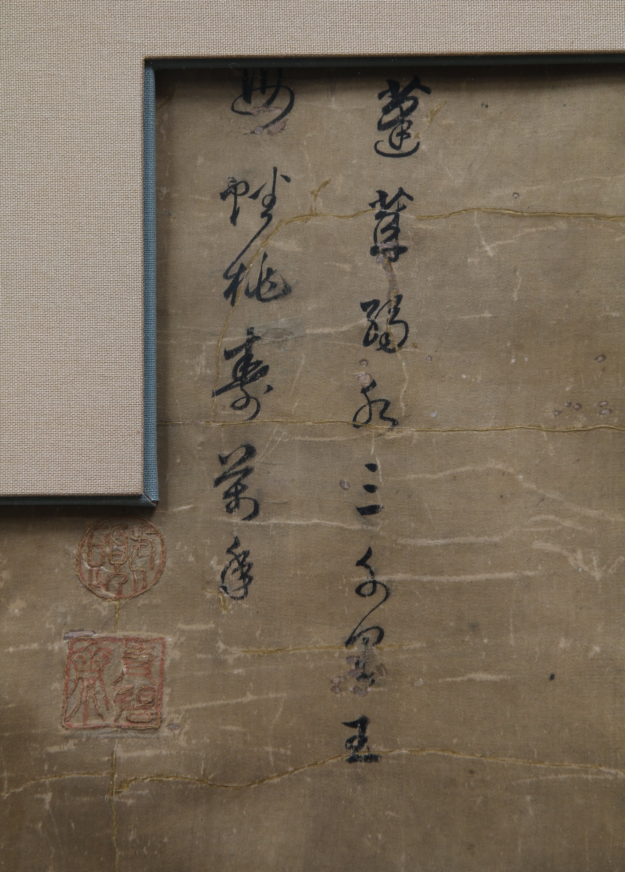 Dimensions, à vue: Haut. 112, Larg. 42 cm. (pliures, soie jaunie, manques et restaurations)