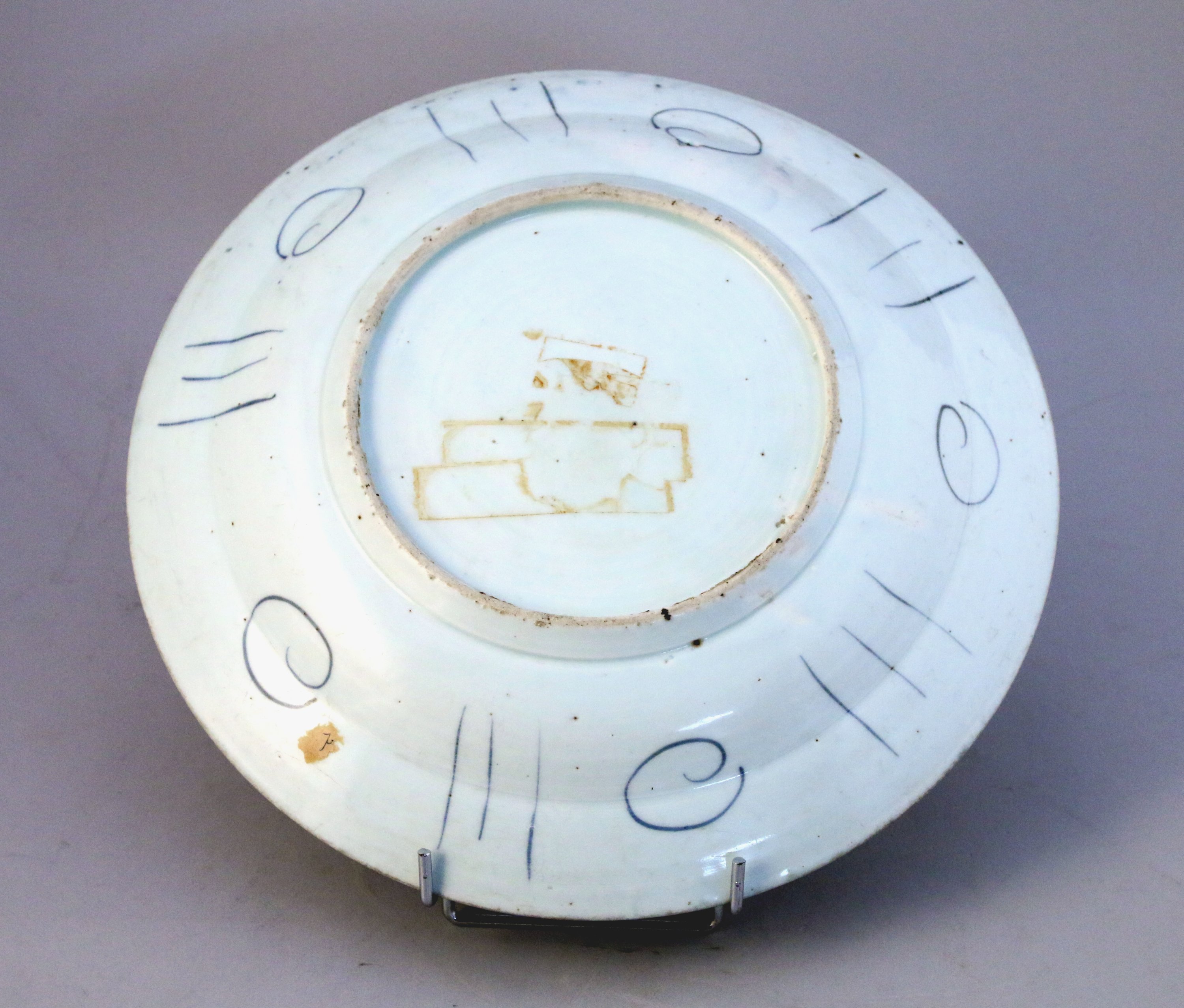 PLAT en porcelaine à décor en bleu sous couverte d'un vas fleri au centre, l'aile ornée de fleurs et de végétaux stylisés dans des réserves.
