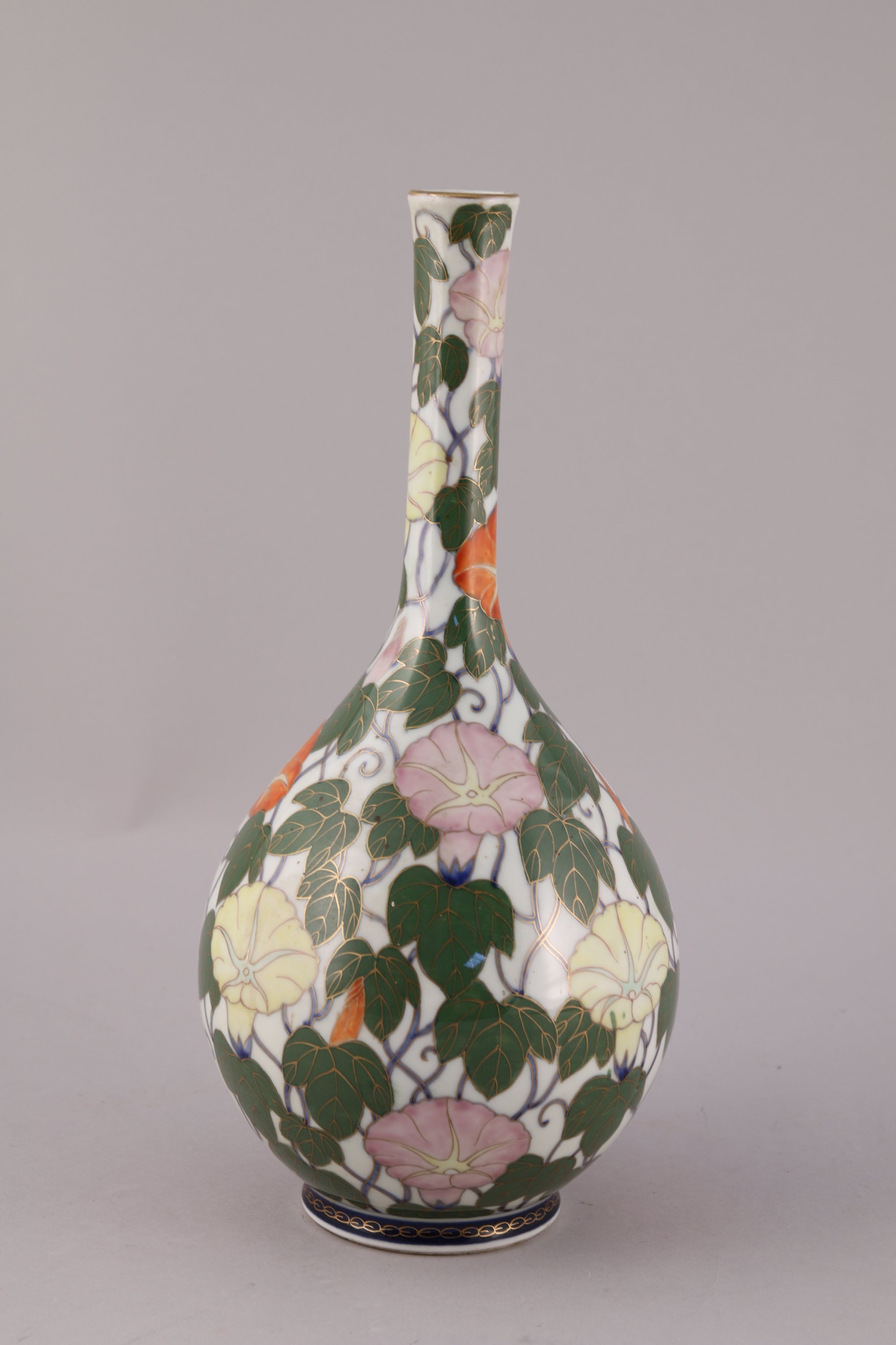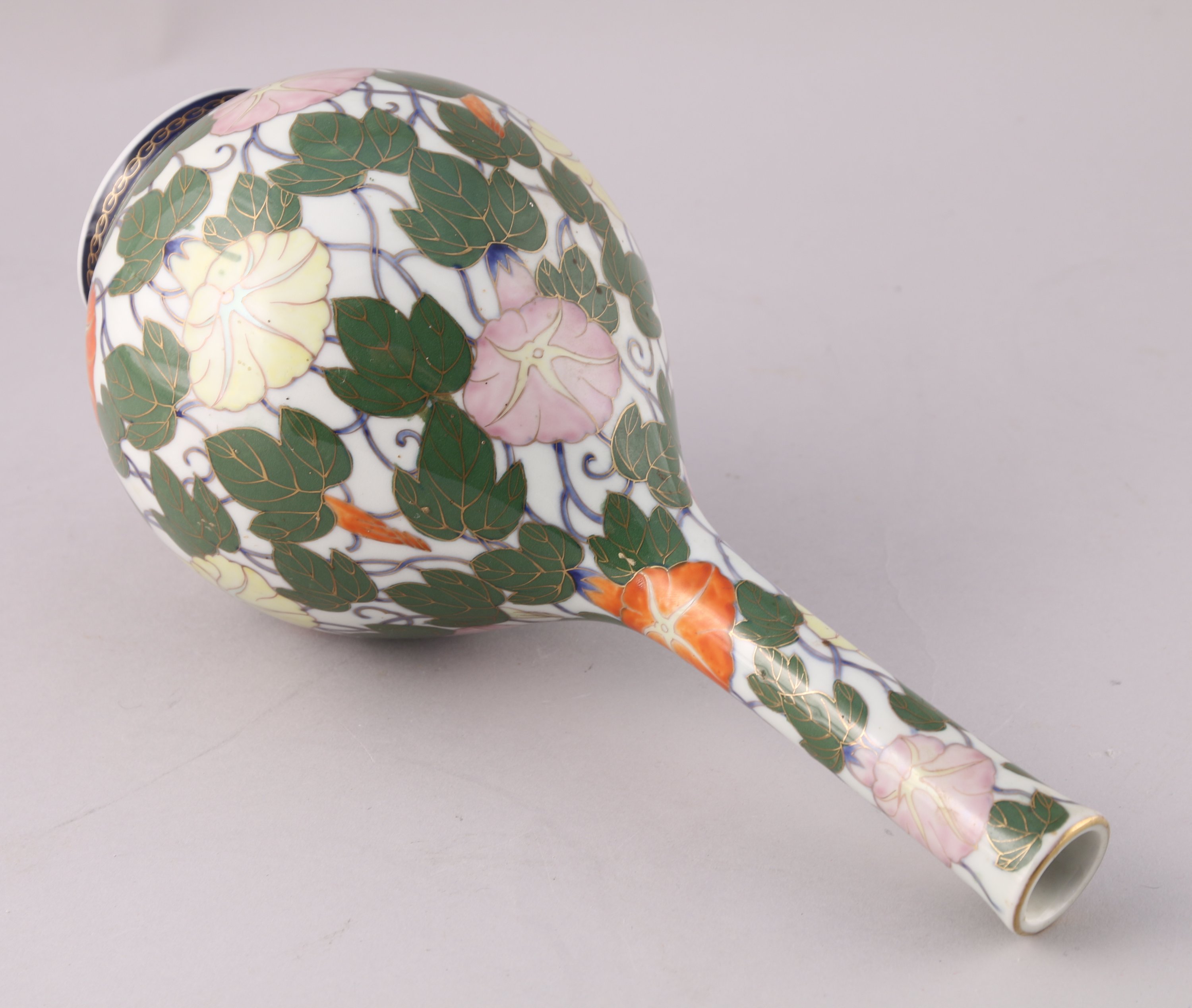 VASE bouteille en porcelaine émaillée polychrome à décor de belles de jour dans leur feuillage. Au revers, la marque Fukagawa.