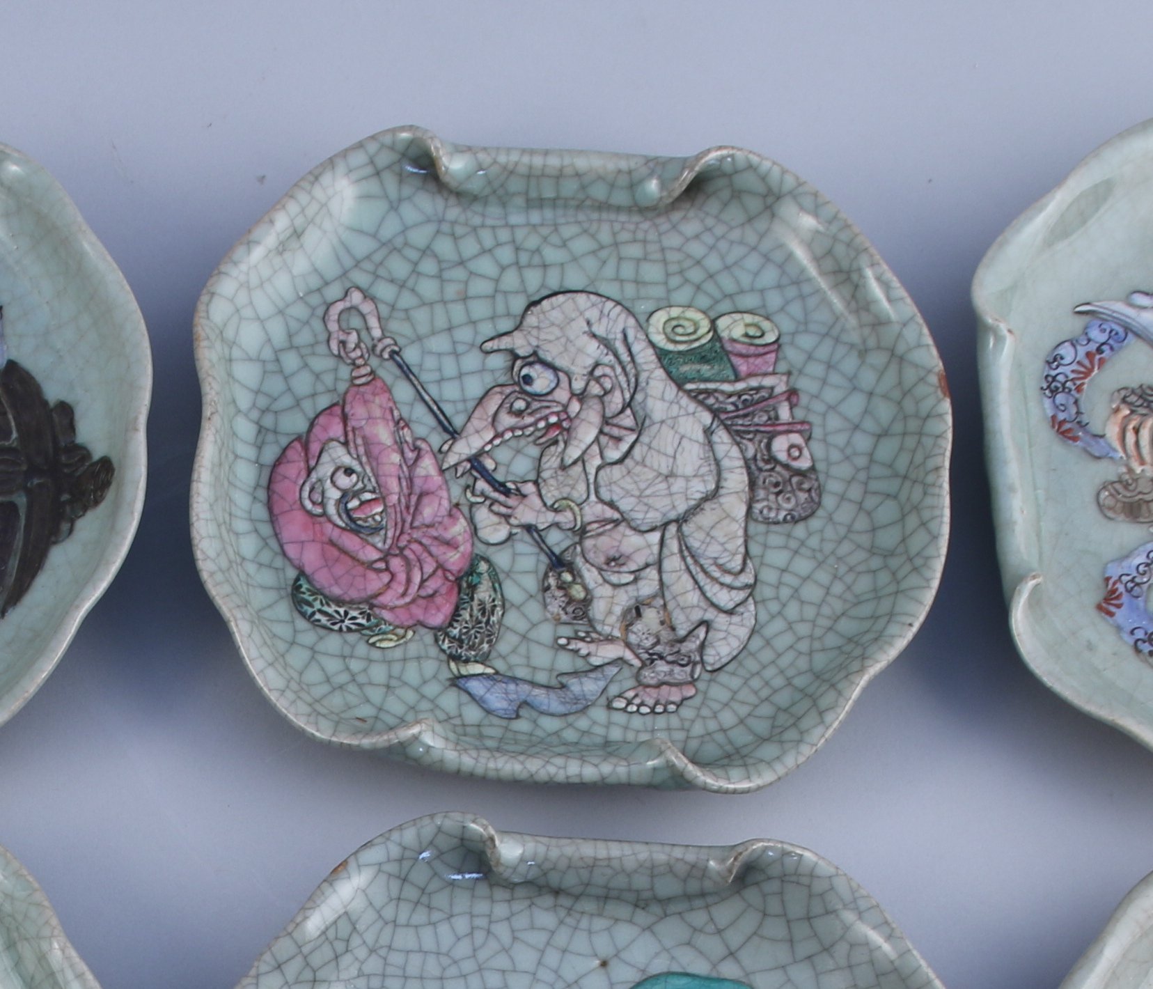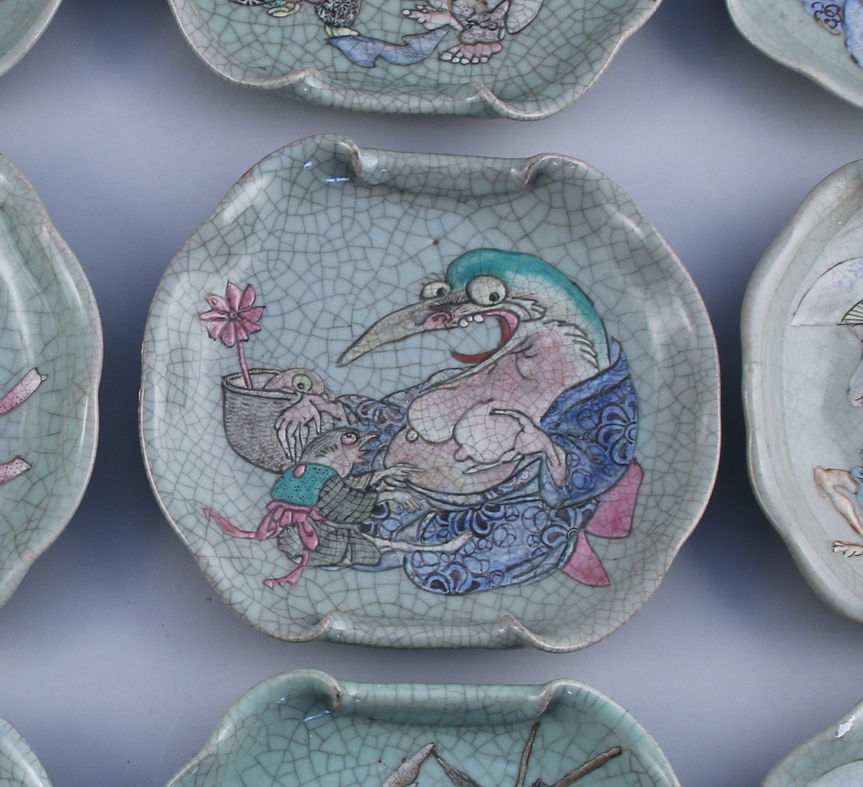 Suite de 12 ASSIETTES en grès à décor polychrome de scènes simiesques en léger relief sur fond vert céladon craquelé.