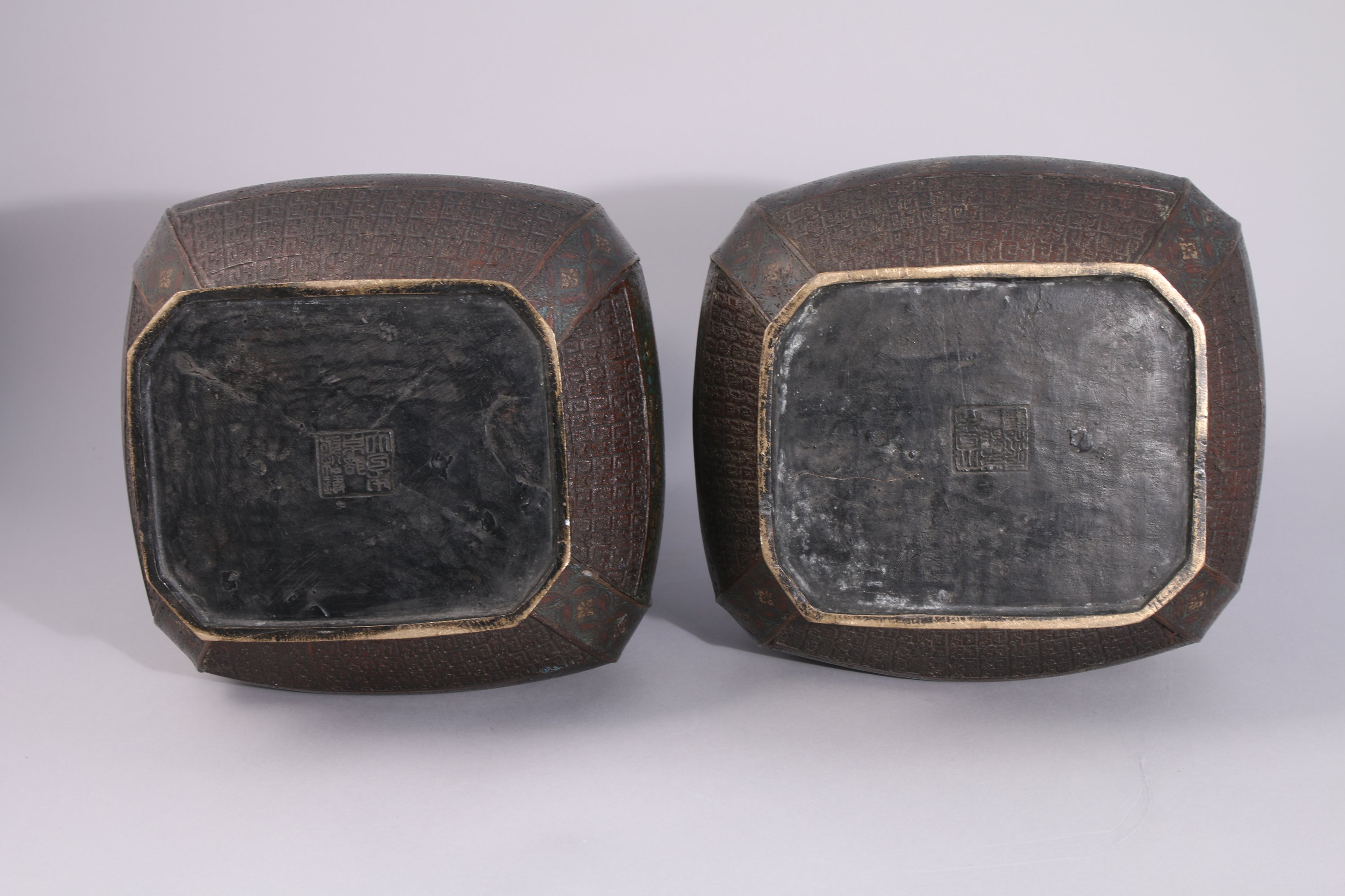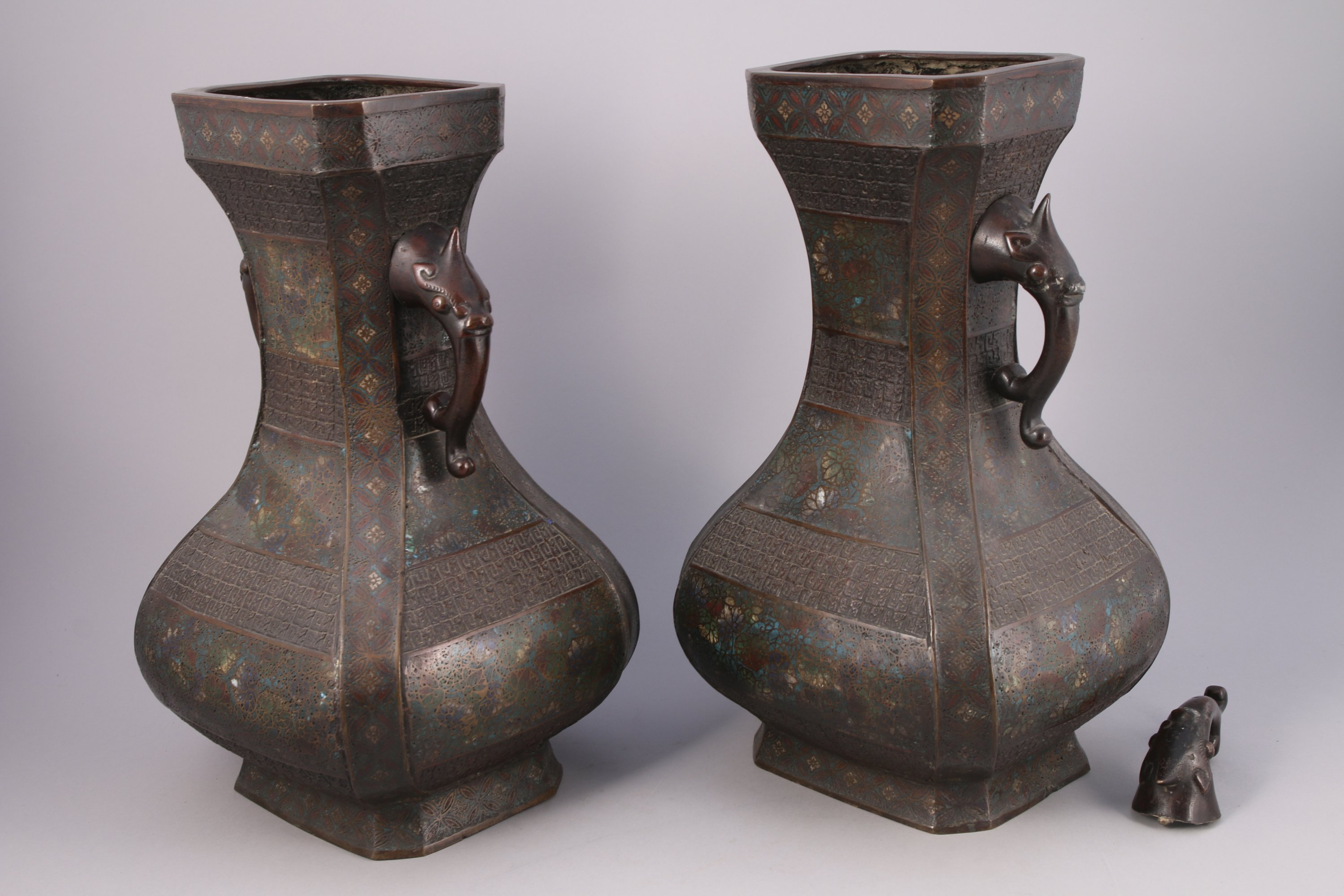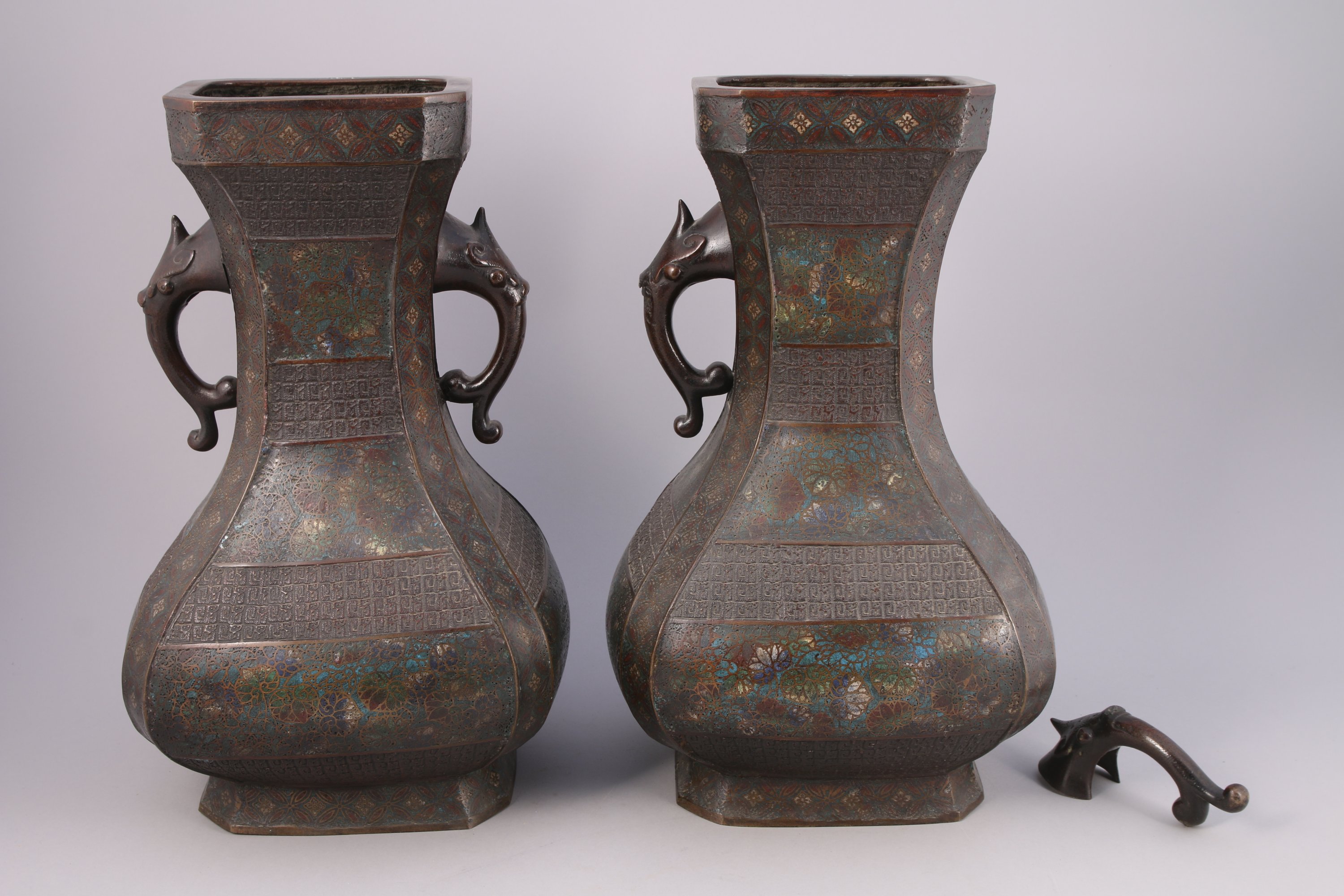 Paire de VASES balustre en bronze à décor de motifs floraux et géométriques en émaux cloisonnés. Anses à têtes d'éléphants. Signés.