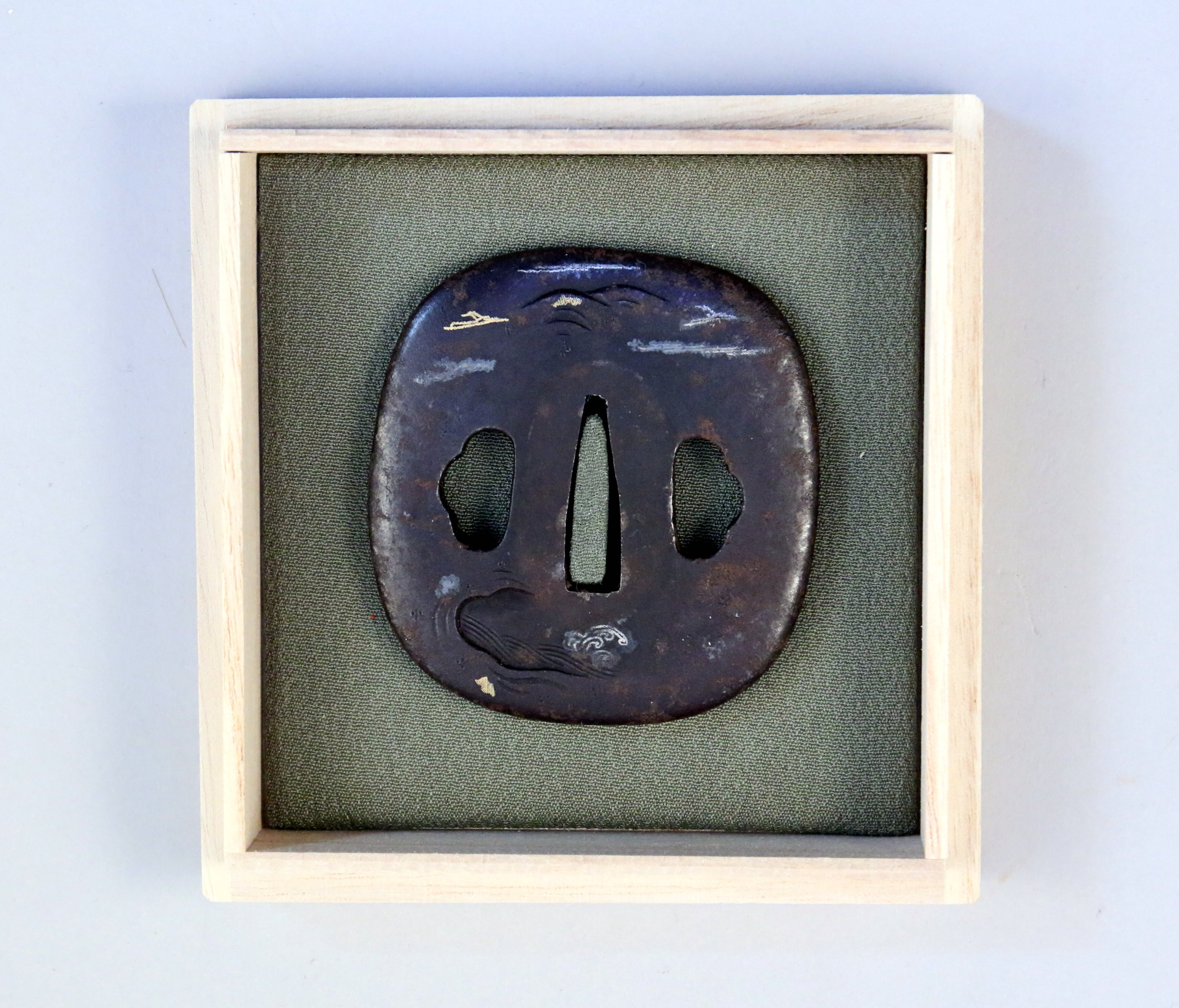 HOKEI GATA en fer à décor incisé et incrusté de shibuichi et cuivre doré d'un pin près d'une cascade.
