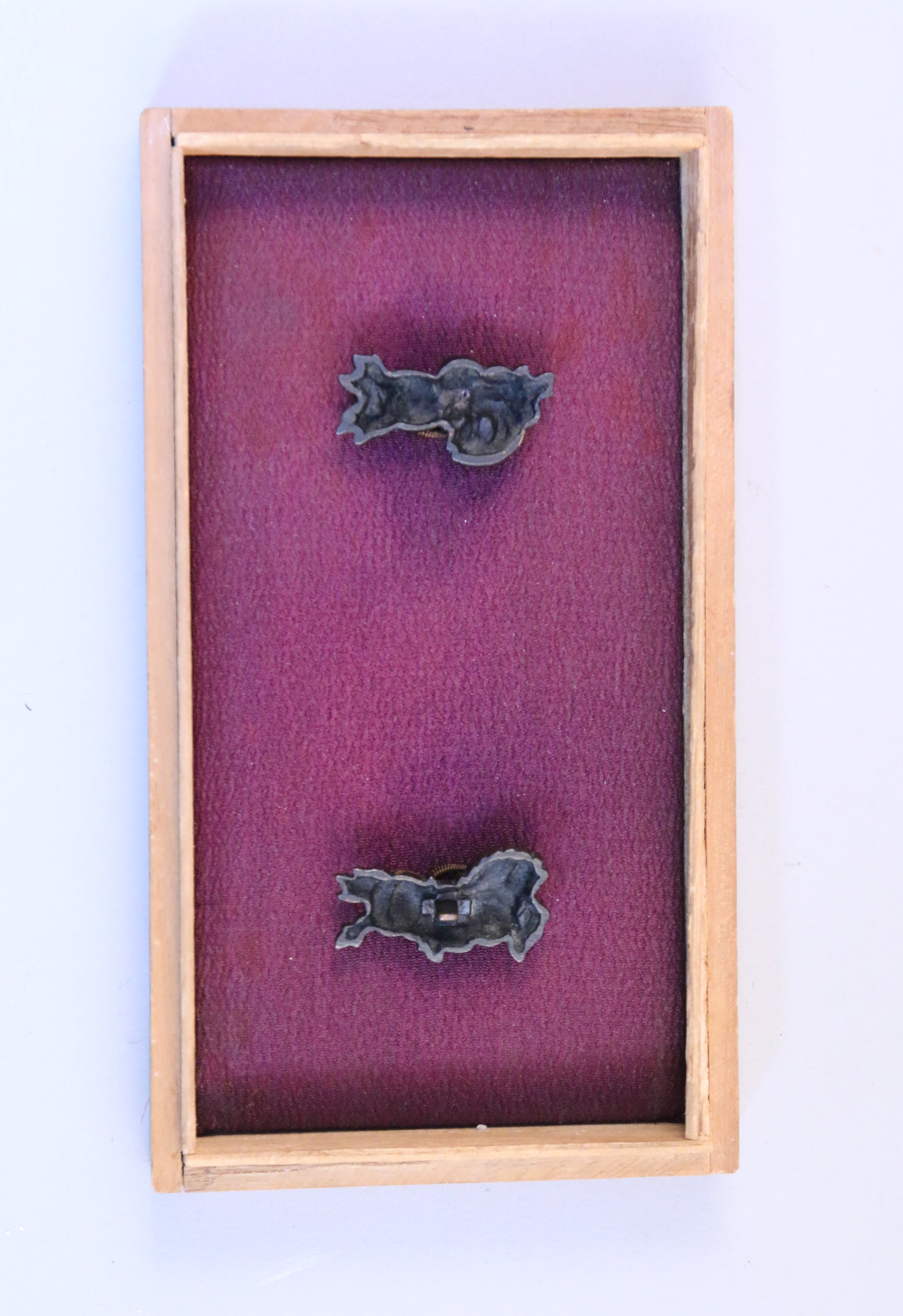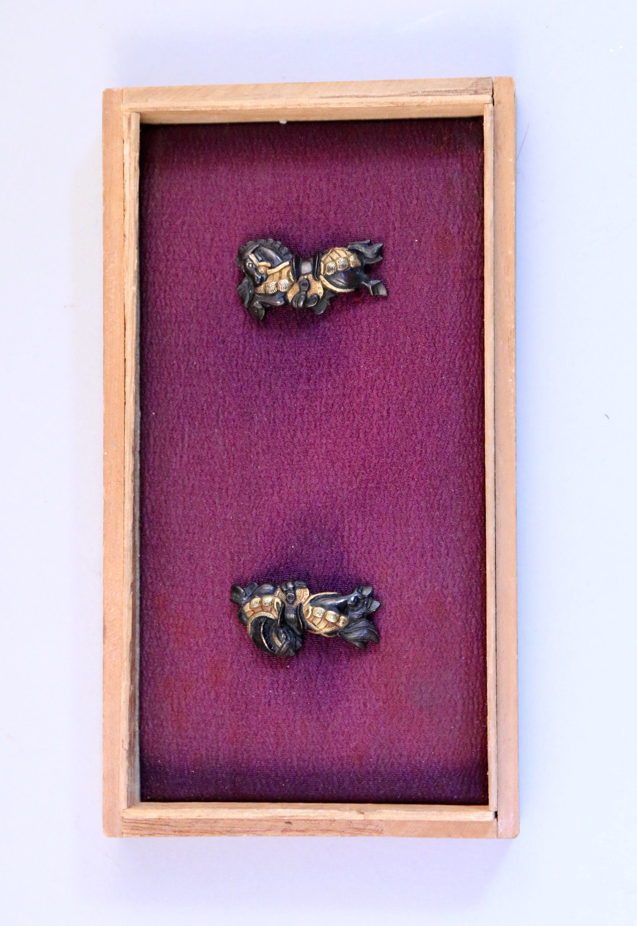 Paire de MENUKI en shibuichi et cuivre doré, chevaux parés se cabrant et sautant.