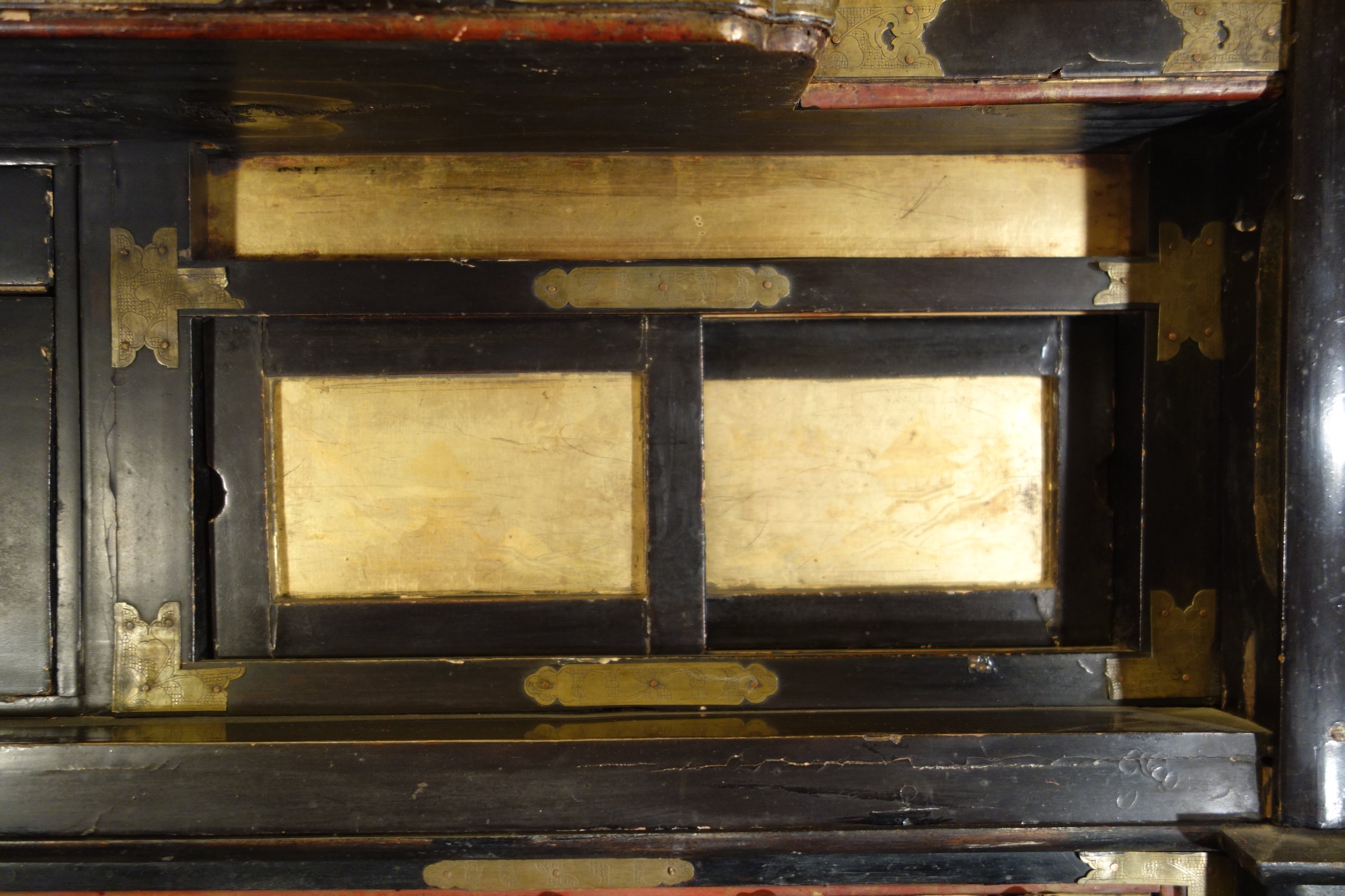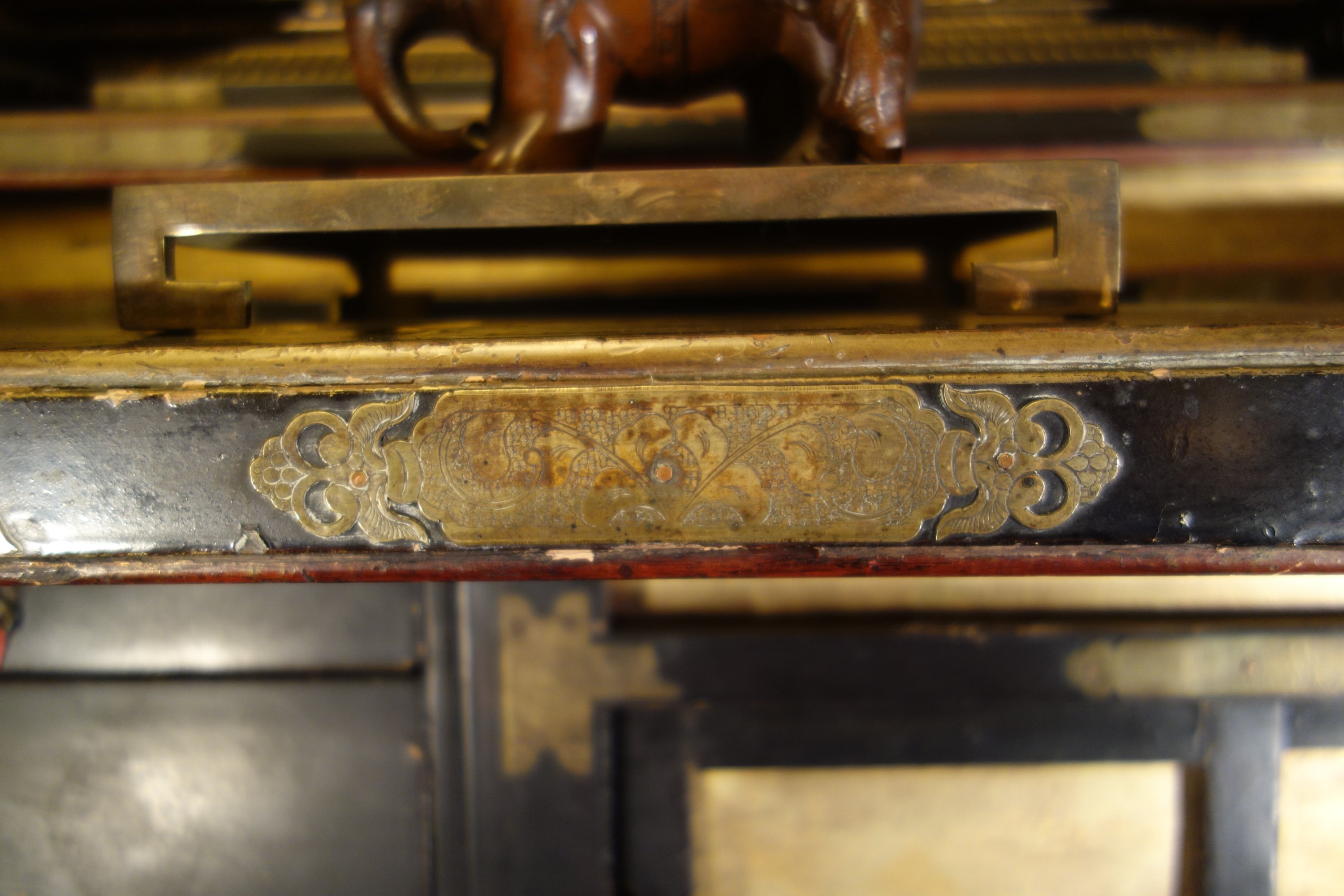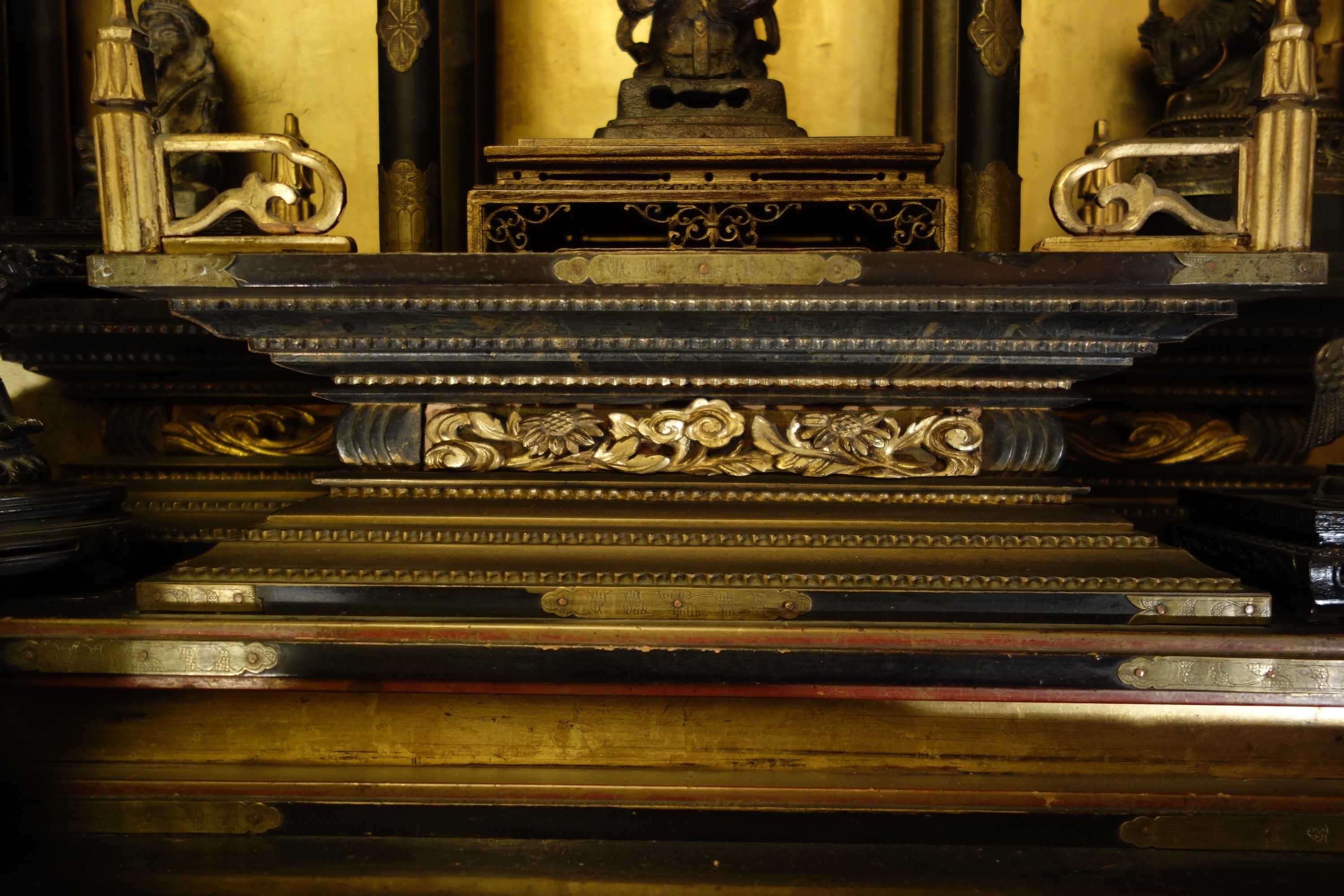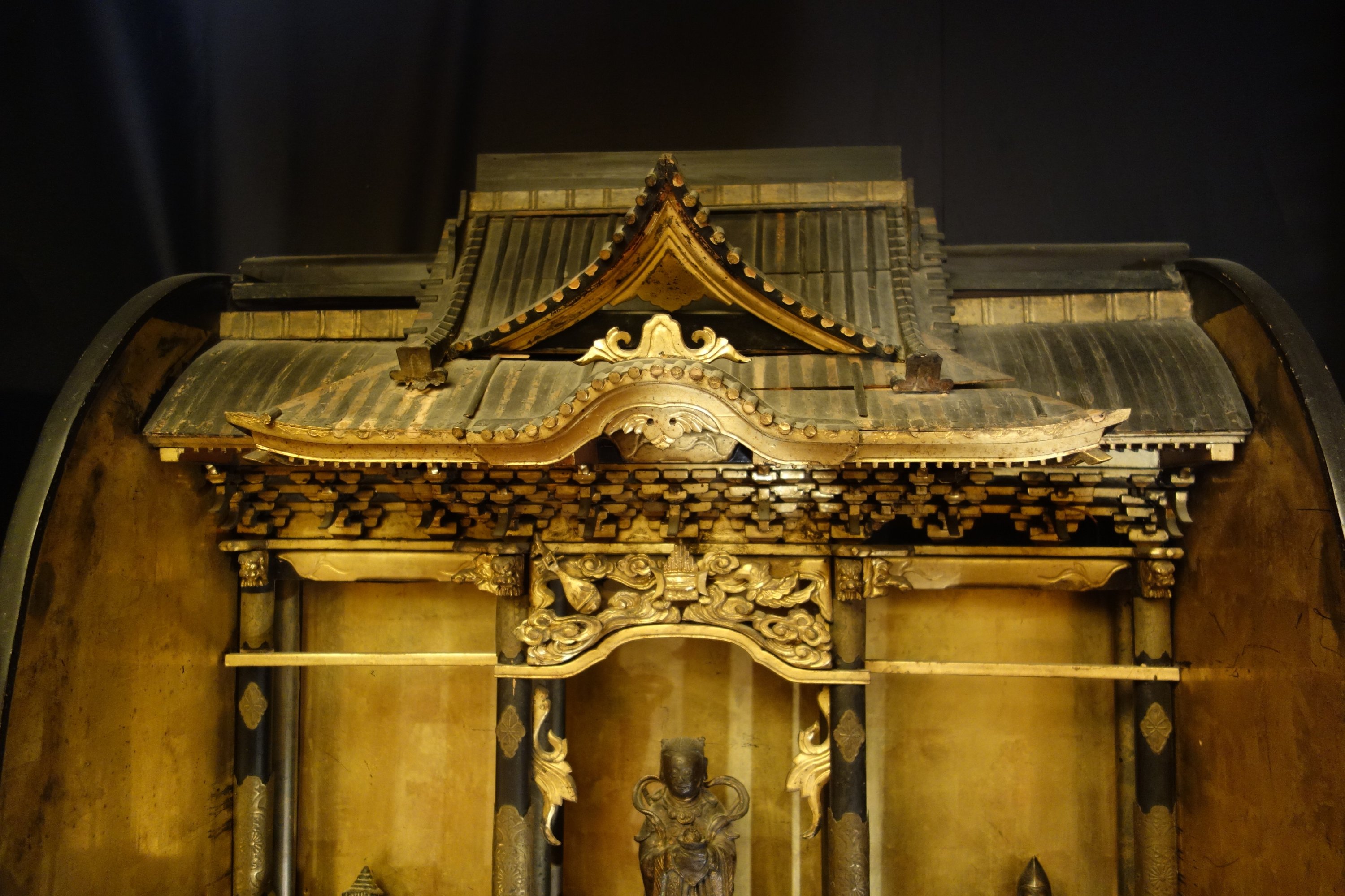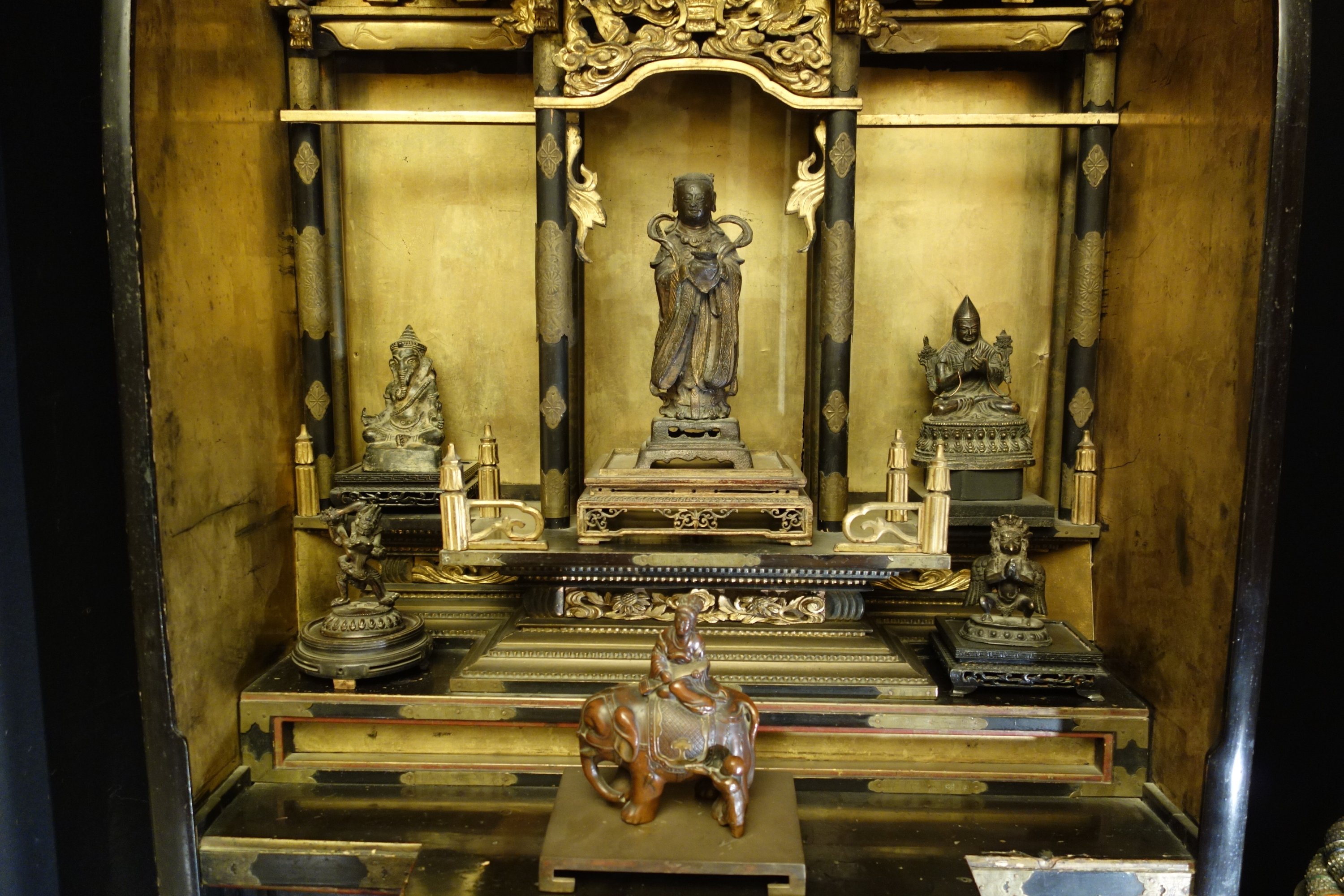 Important AUTEL DOMESTIQUE en bois doré et bois noirci. La niche centrale surmontée d'un toit en forme de pagode, et divisé en trois parties soutenues par des colonnes avec de chapiteaux en chimère, éléphant, décor de nuages et instruments de musique. En partie basse, il ouvre par deux tiroirs et deux portes coulissantes. Son piètement orné de dragons affrontés dans les nuages en bois sculpté ajouré et doré. Ornementation de pièces en cuivre gravé de motifs fleuris.