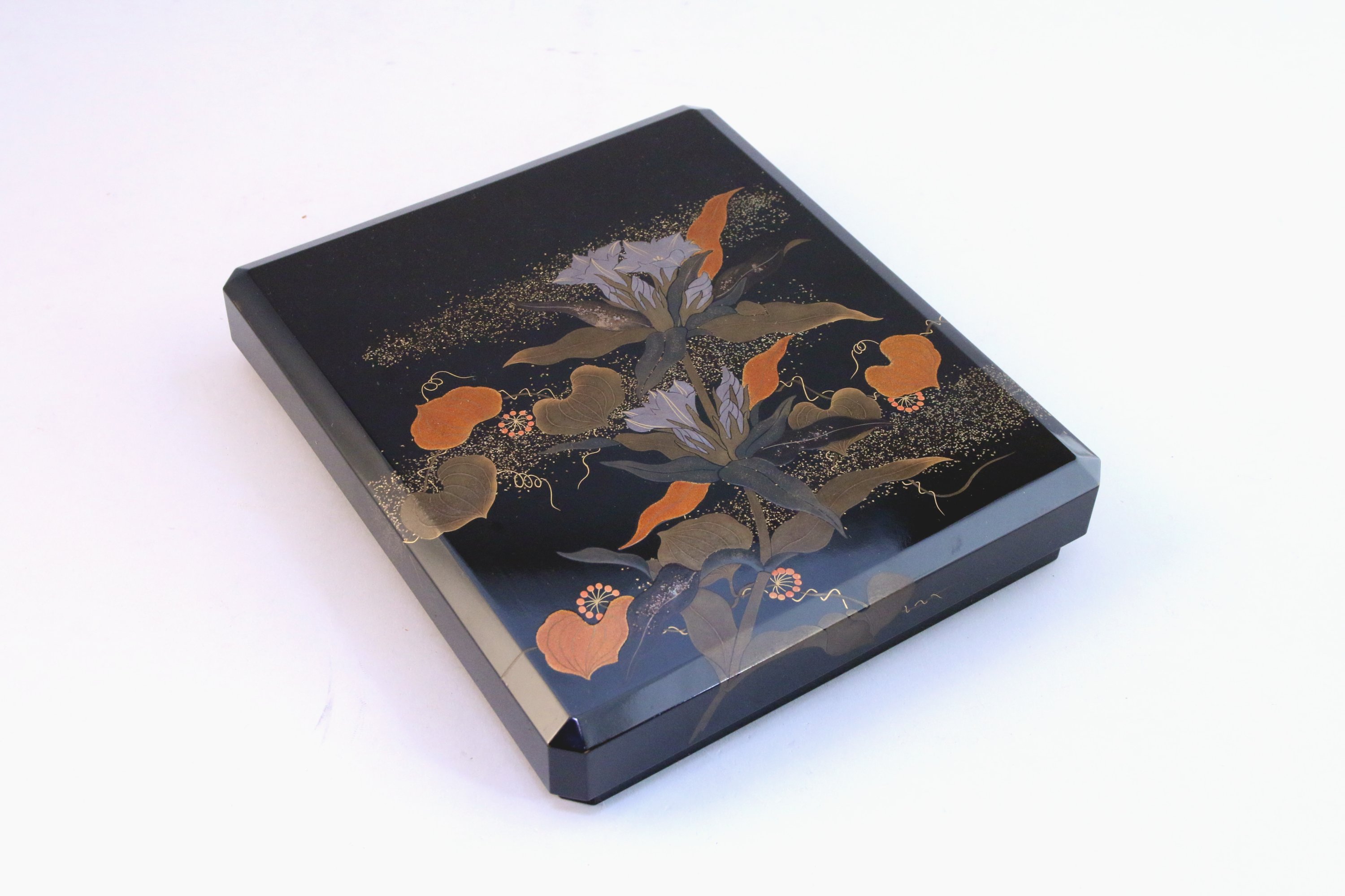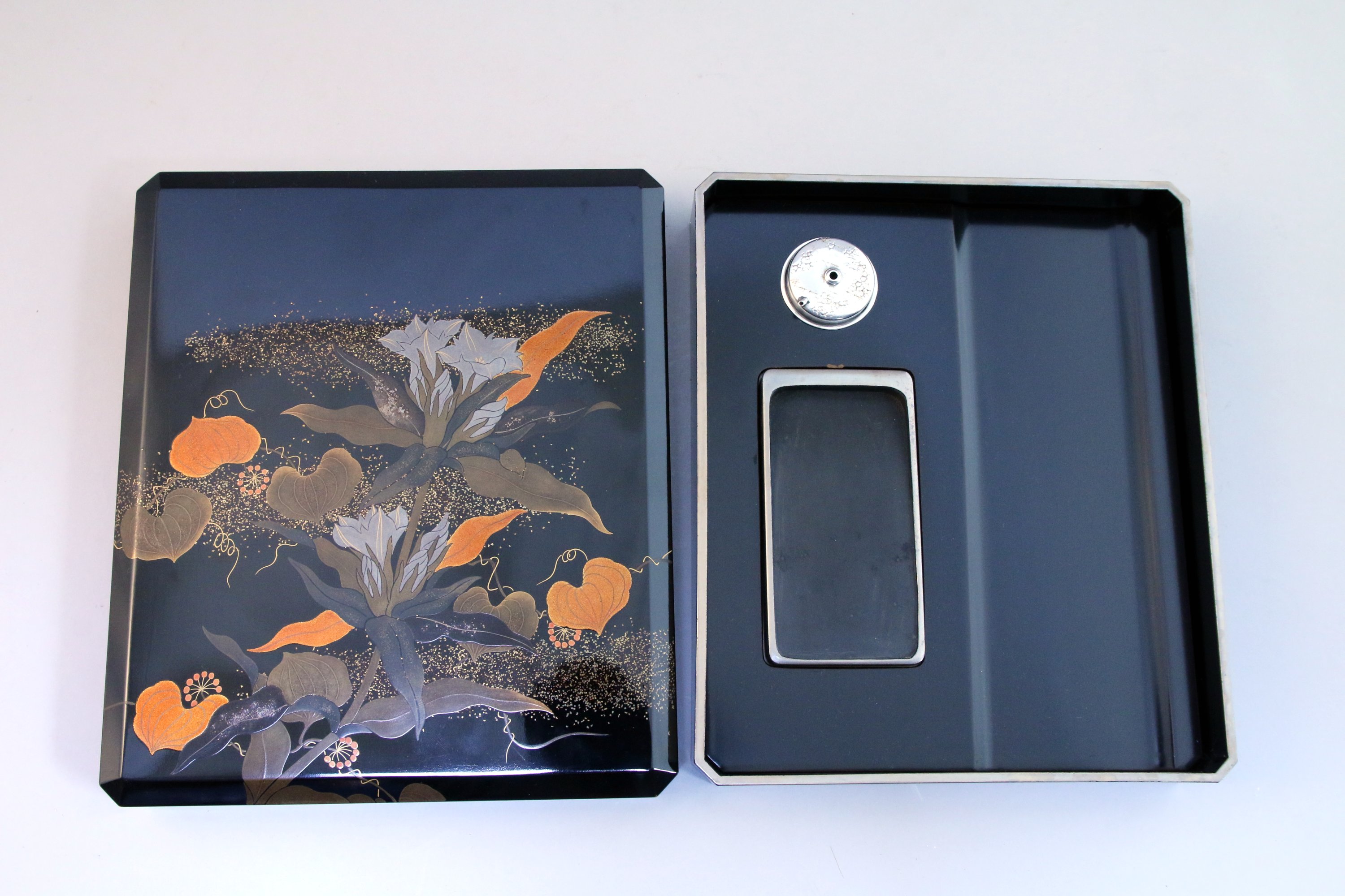 SUZURIBAKO en laque noire à décor en hirame et hiramaki-e de laqueargent, or, vert et brun de lys épanoui et de vrilles. Intérieur en laque noire.