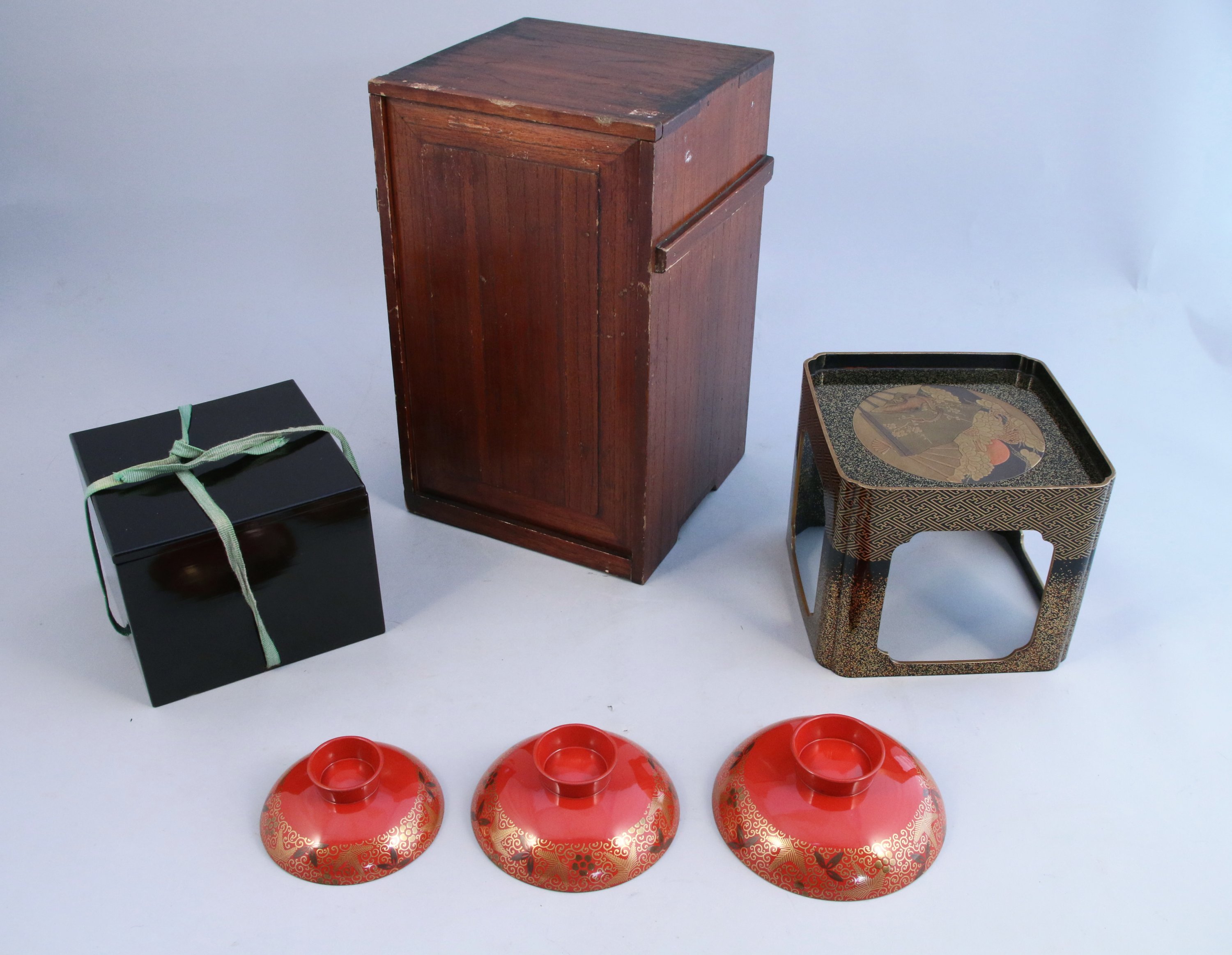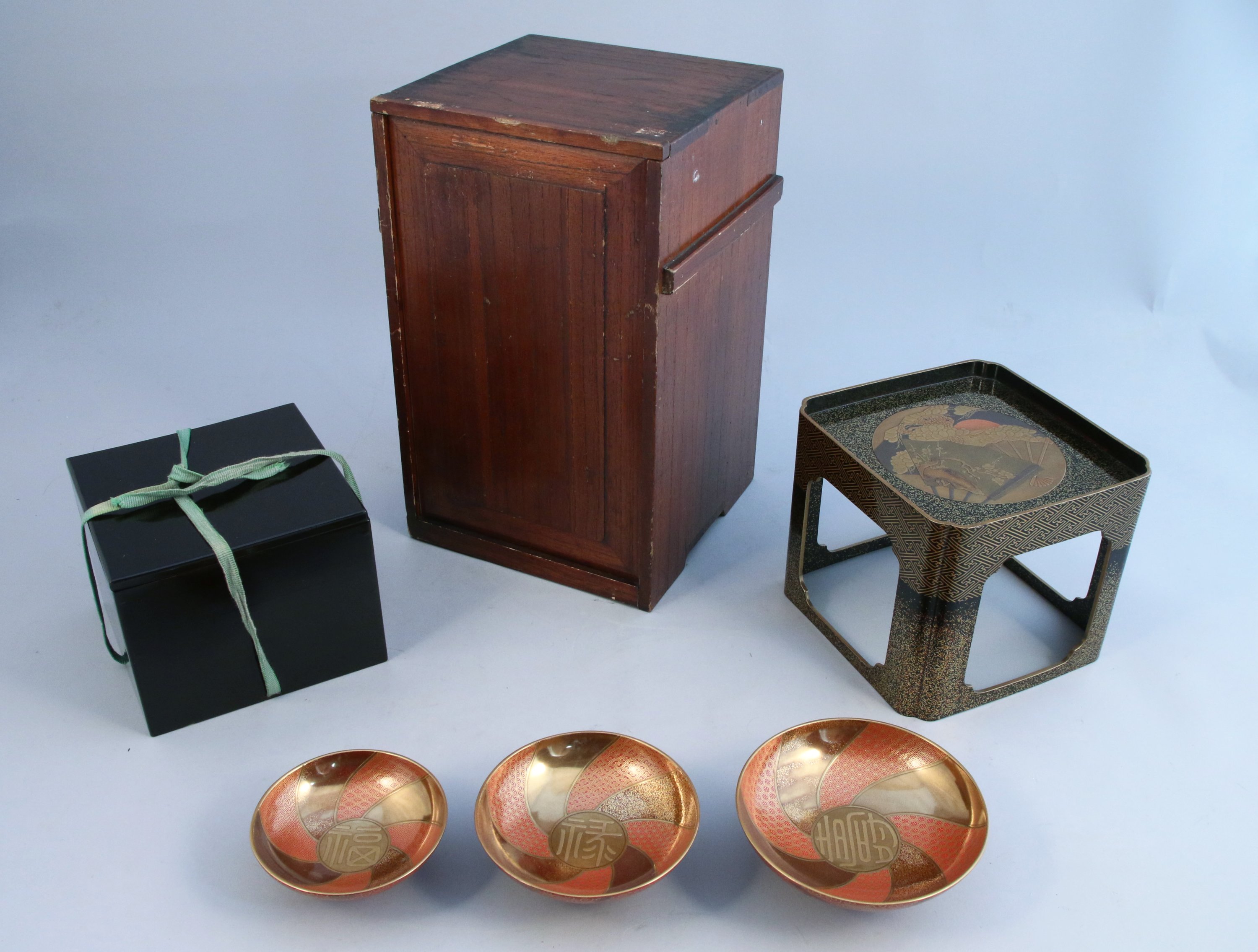 ENSEMBLE À SAKÉ comprenant un support en laque hirame à décor en hiramaki-e de laque or argent et rouge d'éventails et pins au soleil couchant, et trois coueplles en laque à décor en hiramaki-e de laque or et rouge de brocarts.