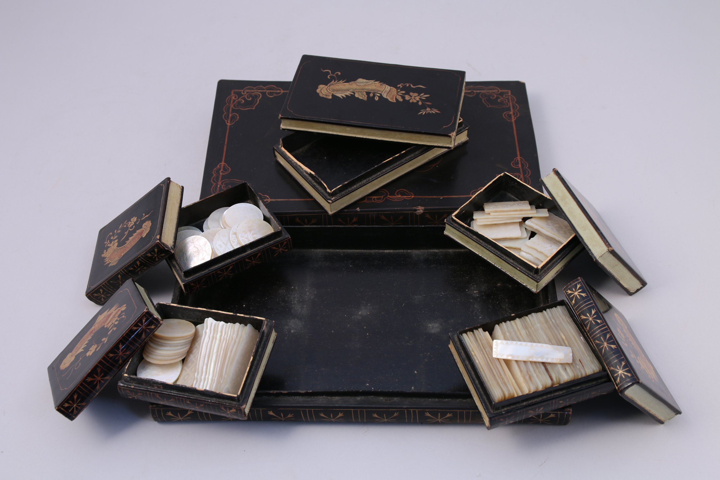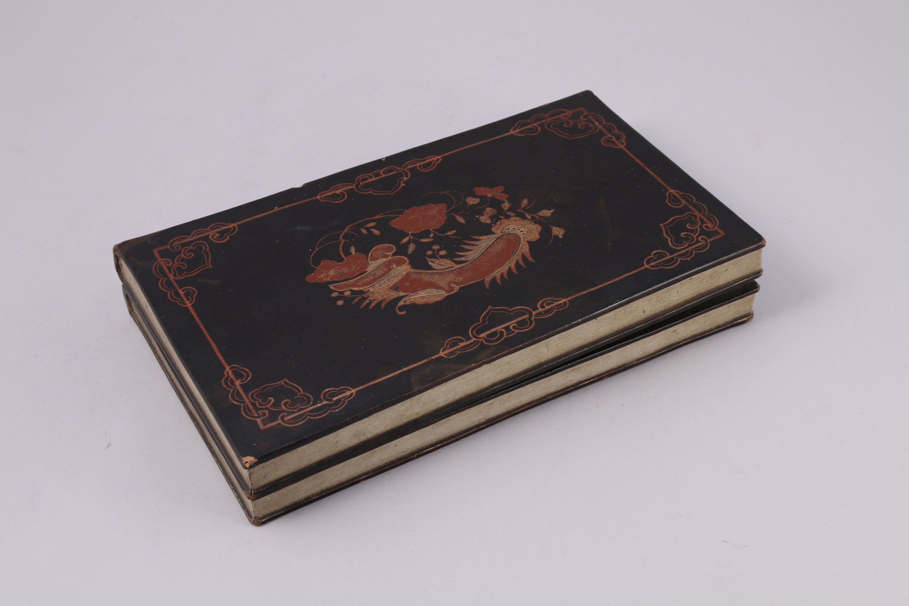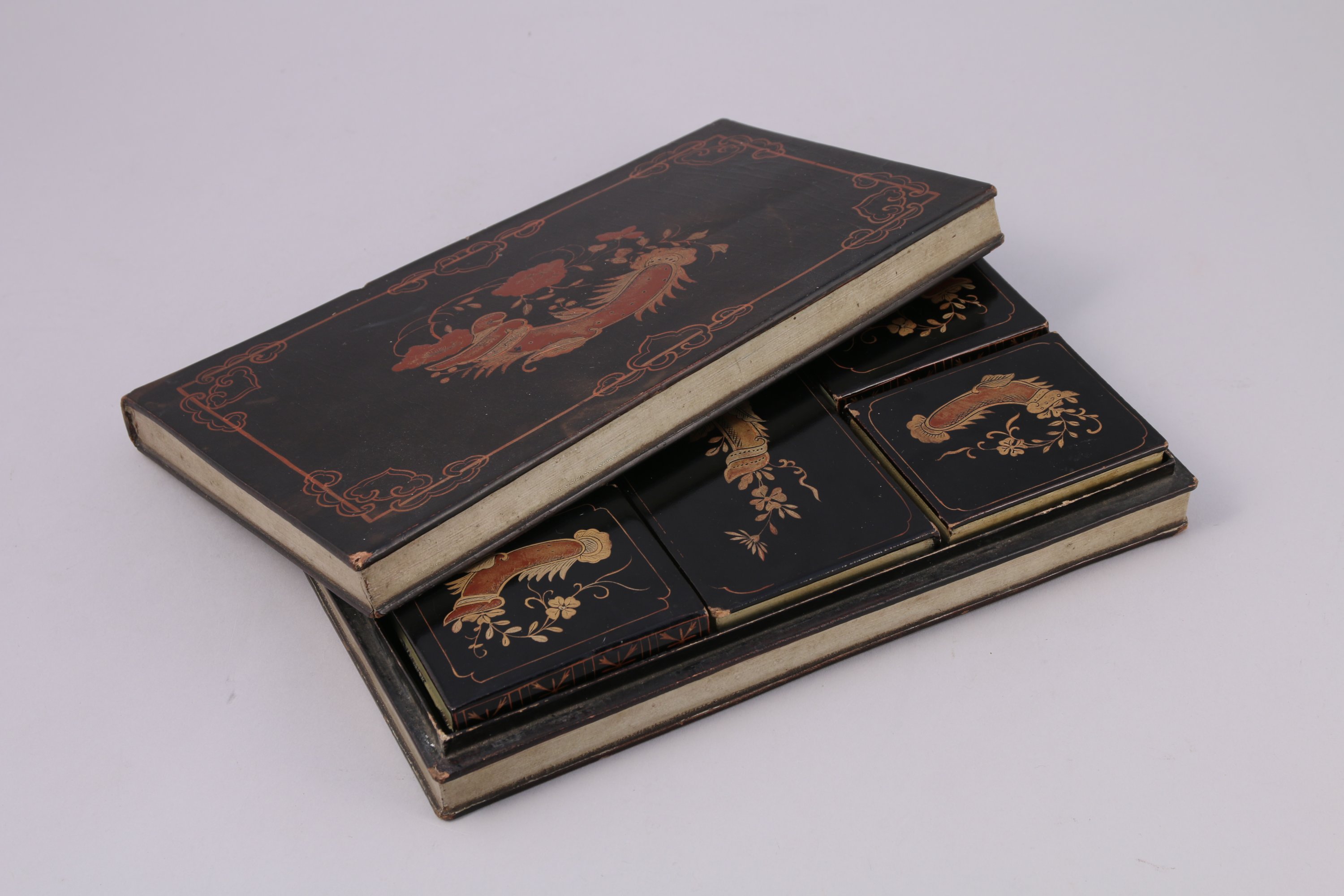 BOÎTE-À-JEUX figurant deux livres posés l'un sur l'autre en laque à fond noir à décor or et rouge. Elle découvre cinq petites boîtes adoptant la même forme et le même décor recelant plaquettes et jeton de nacre à décor de colombes amoureuses dans des rinceaux.