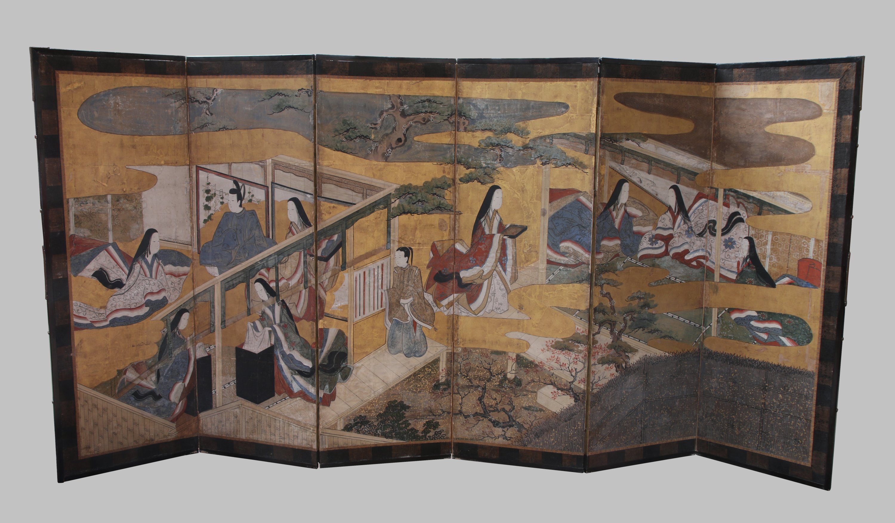 PARAVENT à six feuilles, encre polychrome sur feuille d'or, représentant une scène du "Genji Monogatari". Le prince Genji dans un intérieur, entouré de sa femme et de ses servantes.