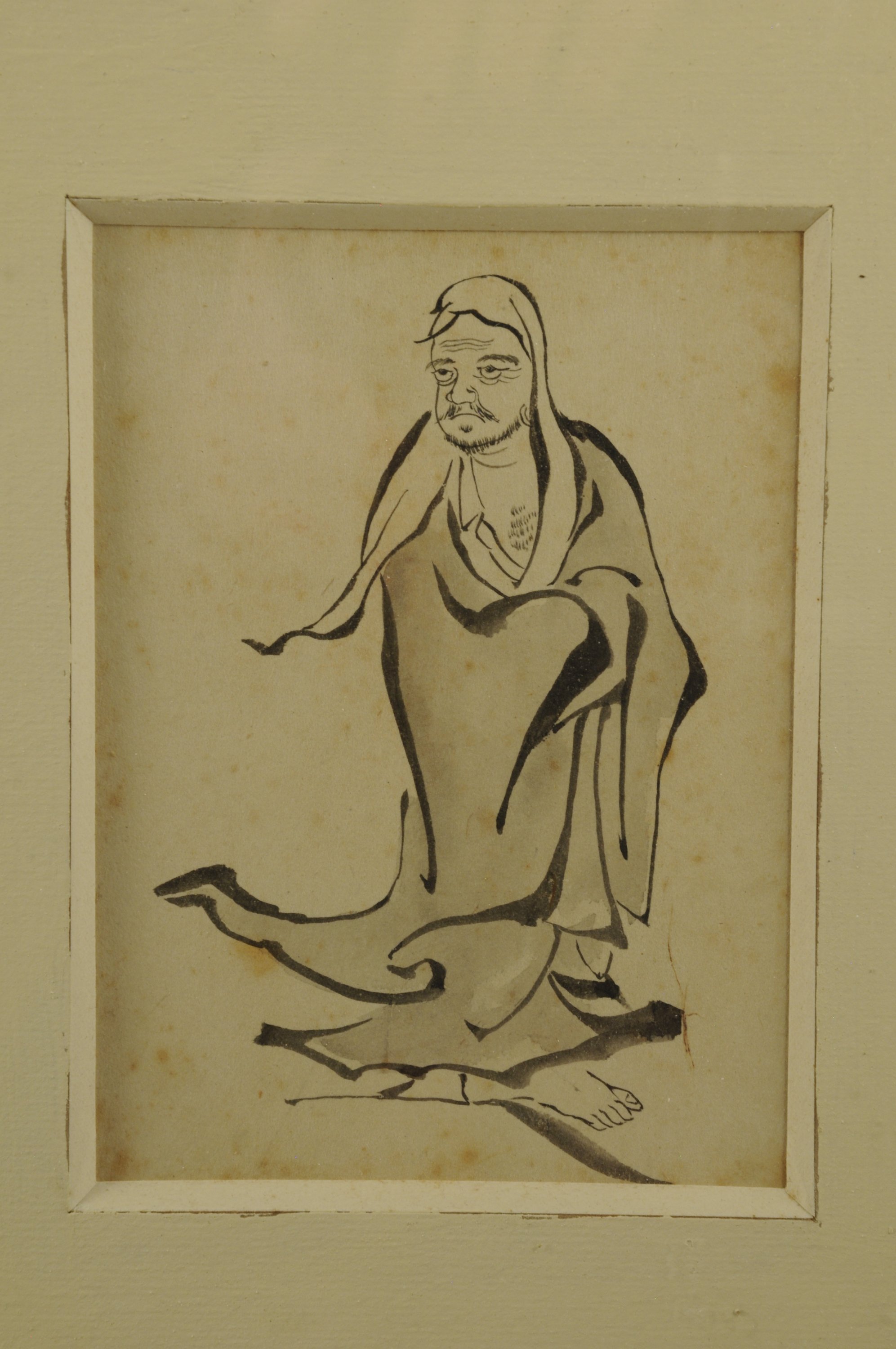 Quatre DESSINS à l'encre sur papier, Daruma et Shoki. L'un signé Tomochika.