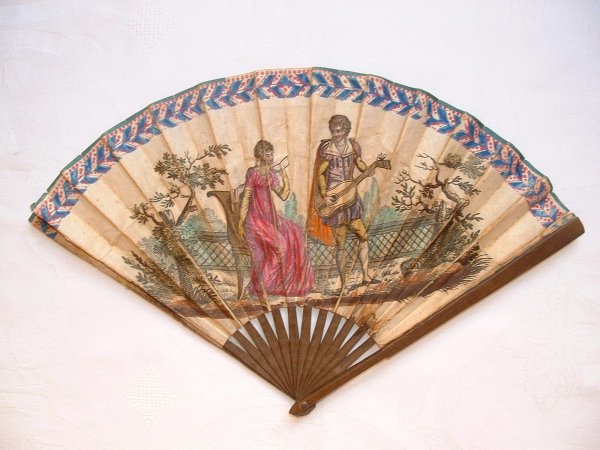 Eventail plié, fin XVIIIe. Gravure aquarellée. Intermède musical dans un parc. Monture en bois.