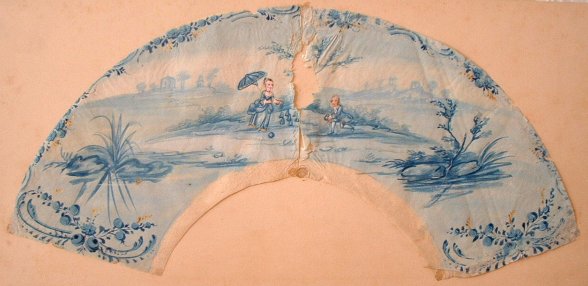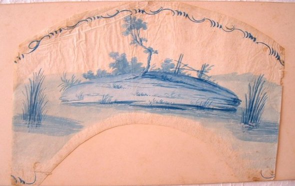 Projet d'éventail, fin XVIIIe. Feuille en papier gouachée en camaïeu de bleu: couple jouant aux quilles.