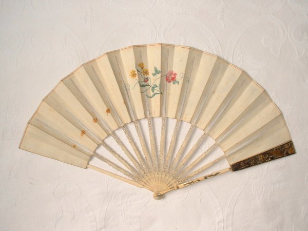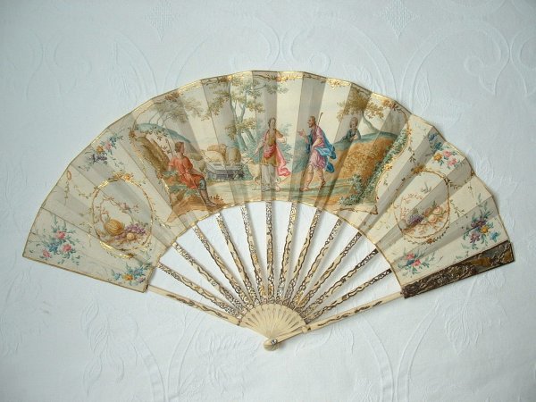 Eventail plié, fin XVIIIe. Feuille en vélin illustrée d'Eliezer et Rébecca au puits. Dans les médaillons latéraux, des fruits. Rehauts de peintures dorée. Très fine monture en ivoire, repercée d'instruments de musique et de fleurs. Rehauts or, argent et vermeil.