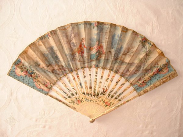 Eventail plié, fin XVIIIe. Feuille gouachée d'un couple avec un enfant. Une inscription sur une tour: "La charte sera ma perte."