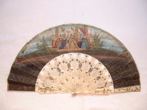 Monture en os, repercée de fleurs. Rehauts de dorures argentées et dorées.