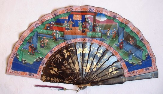 Eventail plié cantonais, 1860-1870. La feuille en papier peinte de personnages aux habits de soie et à tête d'ivoire. Monture en laque décorée de feuillages dorés. Scène similaire au revers.