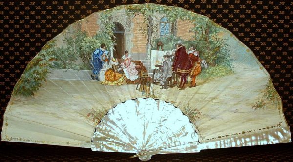 Eventail plié, 1883. Feuille peinte à la gouache. Belle scène de peintre au travail, signée et datée: Francine Fichet, 1883.