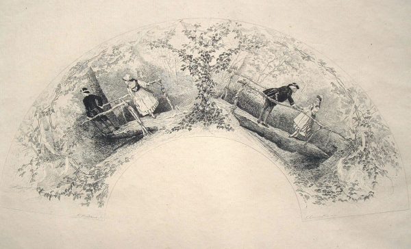 Eau-forte, fin XIXe, représentant une feuille d'éventail de la même époque, intitulée "Le Péage" et signé E. Rudaux (Edmond Rudaux, né en 1840). Gravé par Saro Cucinotta et imprimé par Cadart.
