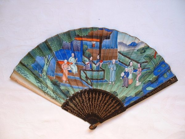 Eventail plié double-face, Chine, fin XIXe. Feuille en papier, gouachée de scènes de la vie quotidienne. Au revers, une pie dans un arbre en fleurs.