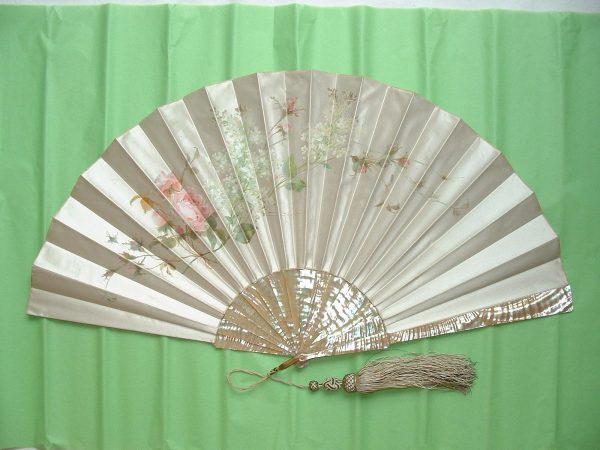 Eventail plié, fin XIXe. Feuille en soie crème, peinte à la gouache de roses aux teintes très fraîches. Monture en nacre haliotide.
