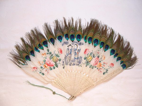 Eventail en plumes d'oie et de paon, fin XIXe, gouachées de deux personnages chinois et de roses. Monture en os, repercée.