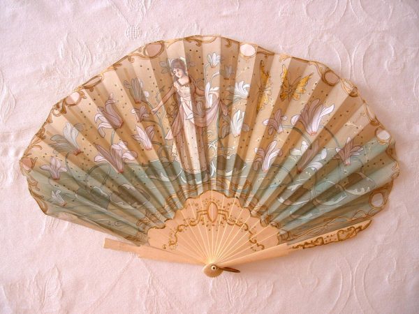 Eventail de forme ballon, de style Art nouveau, début XXe. La feuille en soie gouachée d'une jeune fille, dans une nuée de fleurs, papillons blancs et paillettes cousues. Monture en os, gravée, avec rehauts dorés.