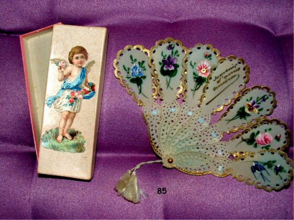 Petit éventail à palmettes en rhodoïd, vers 1920. Des fleurs et des oiseaux décorent les palmettes repercées. Gouache très fraîche.
